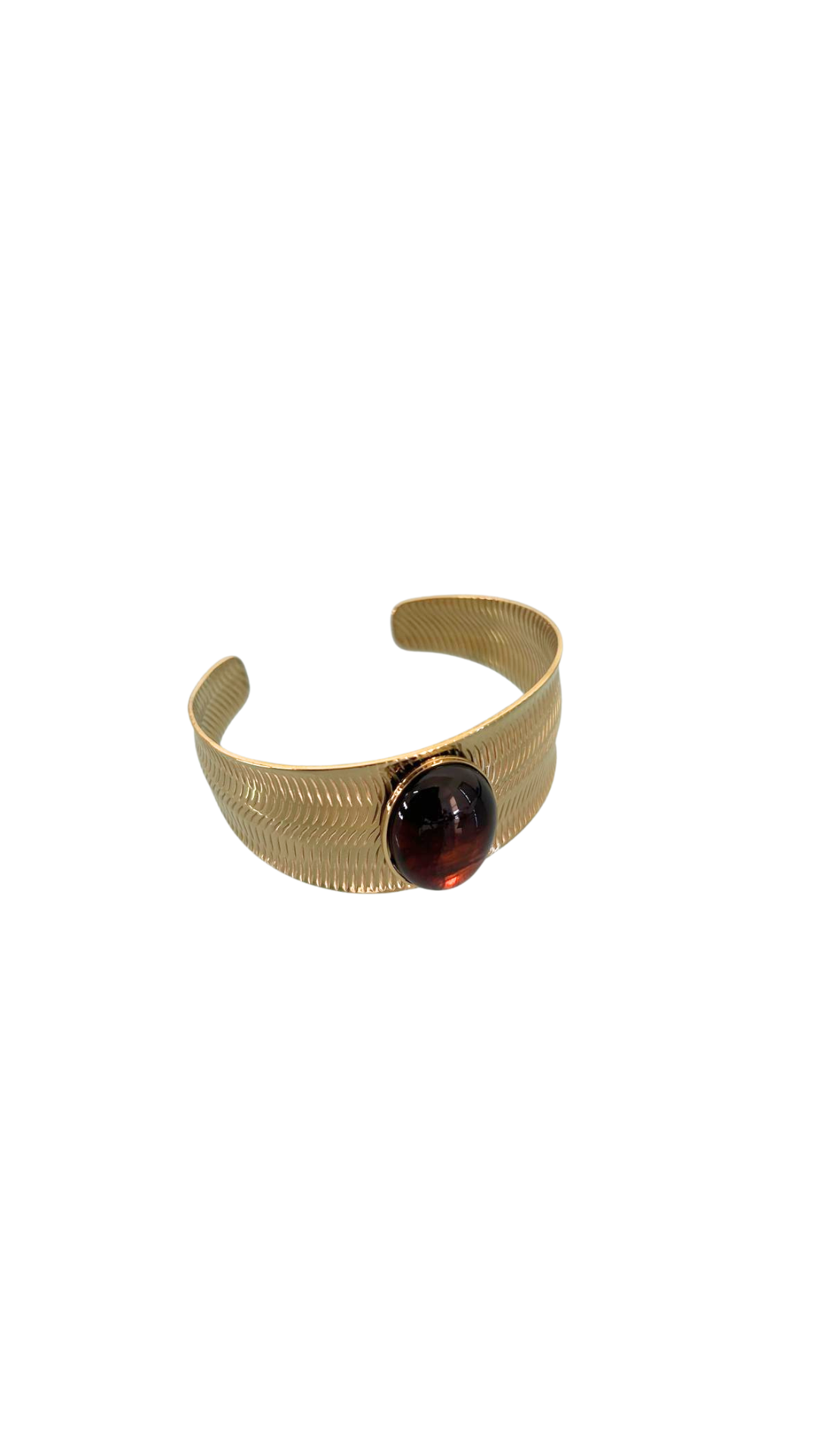 Brazalete dorado con piedra ovalada en tono marrón para elevar cualquier outfit de otoño/invierno.