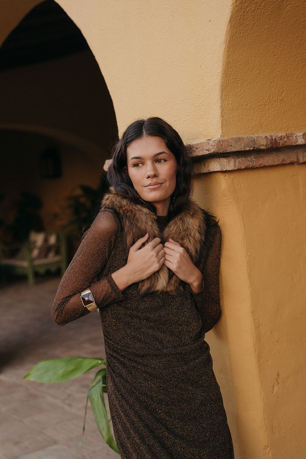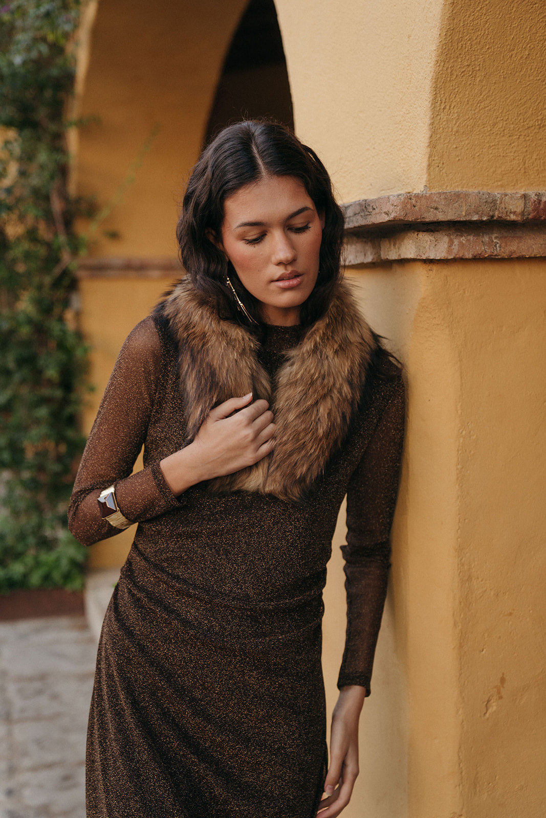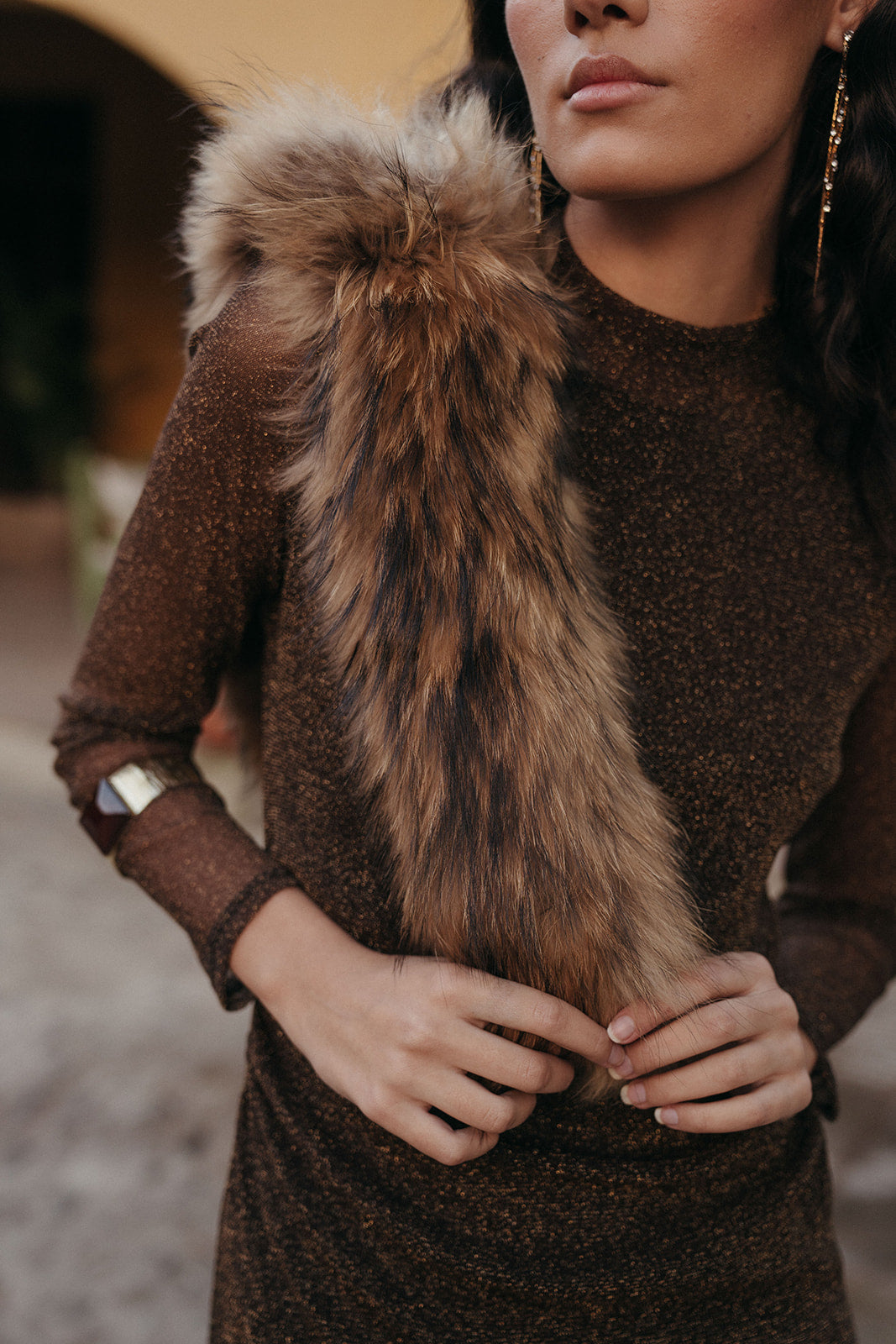 Cuello de pelo camel natural ideal para invierno con cualquier look. Cierre automático con presilla. Al ser de pelo natural, la tonalidad puede variar algo respecto a la foto.