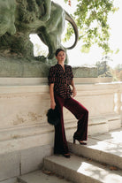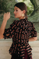 La Camisa Escultura es una pieza sofisticada, confeccionada en terciopelo estampado en tonos burdeos sobre fondo oscuro. Su diseño de corte entallado realza la silueta femenina y se abre en un bajo péplum que aporta volumen y movimiento.