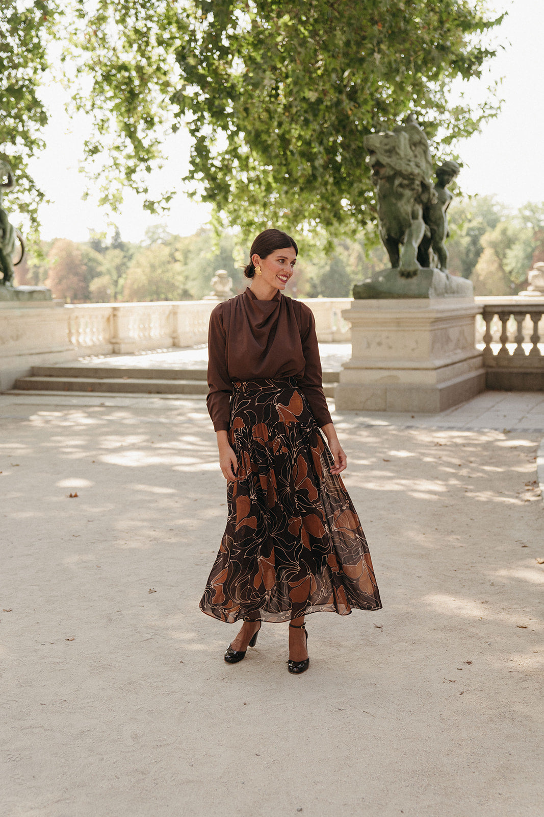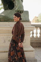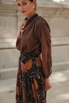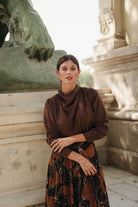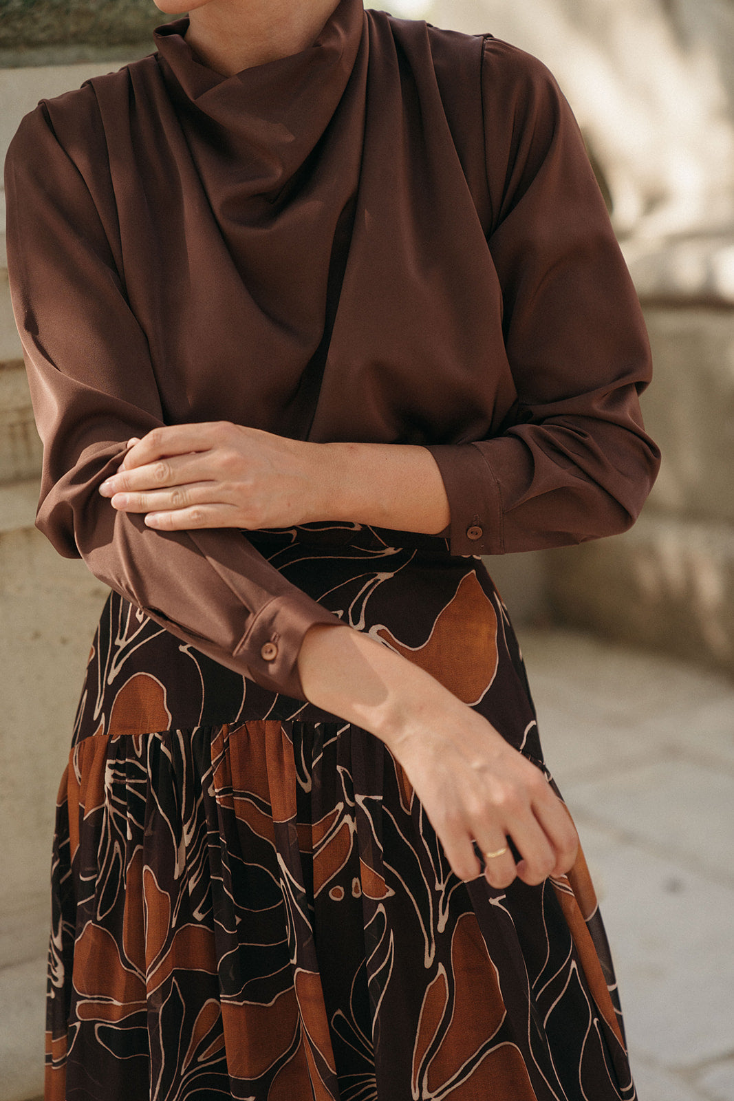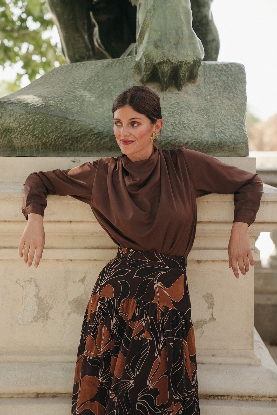 La Camisa Prado con manga larga está confeccionada en un tejido satinado en tono marrón chocolate, presenta un cuello drapeado que cae suavemente sobre el escote y aporta volumen con delicadeza.