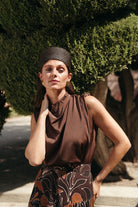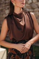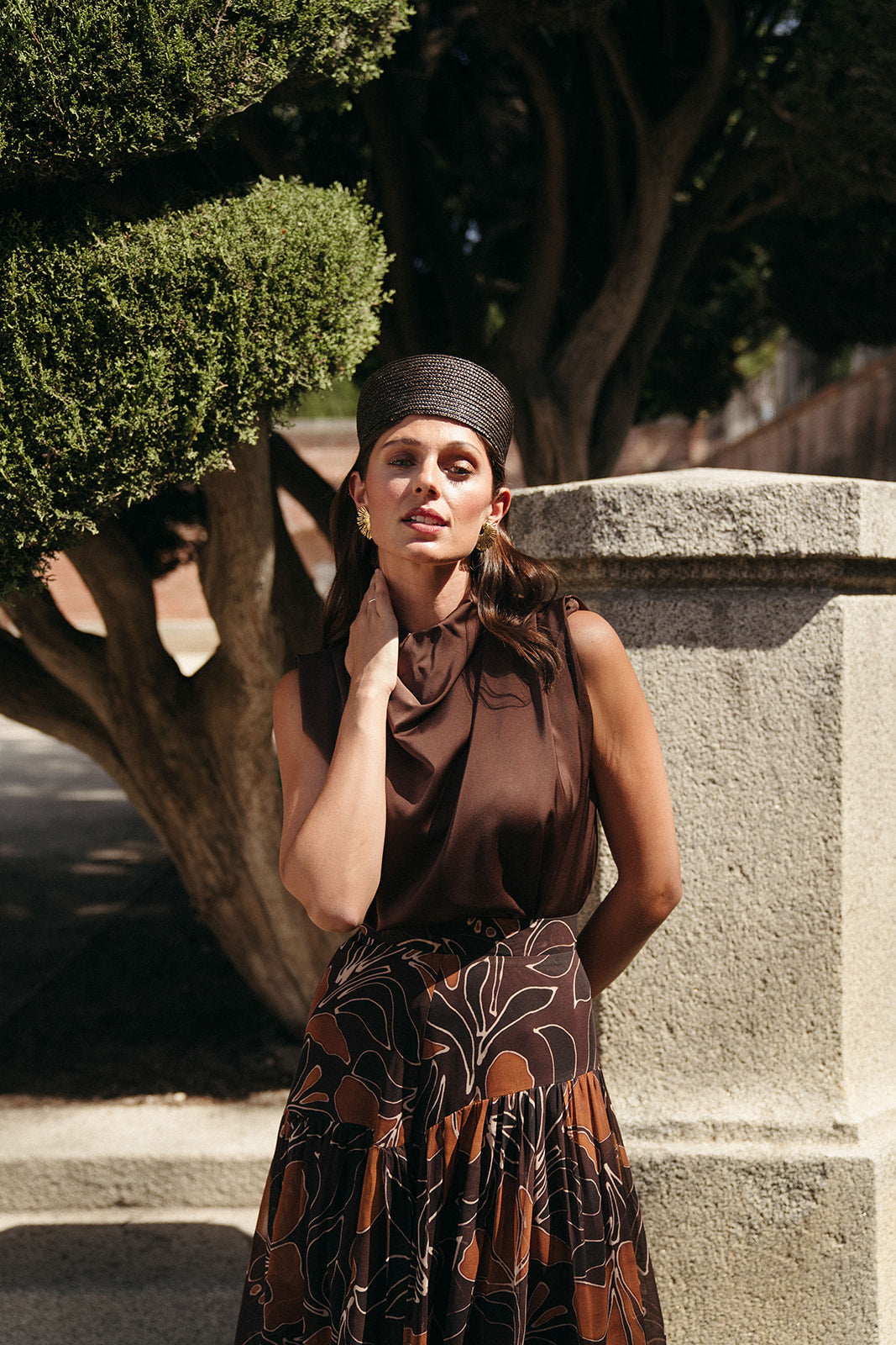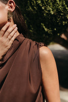 Su diseño sin mangas estiliza la figura y aporta frescura, convirtiéndola en una prenda versátil que puede lucirse tanto en eventos de día como de noche. El tono marrón profundo resalta su elegancia y la convierte en un básico imprescindible.