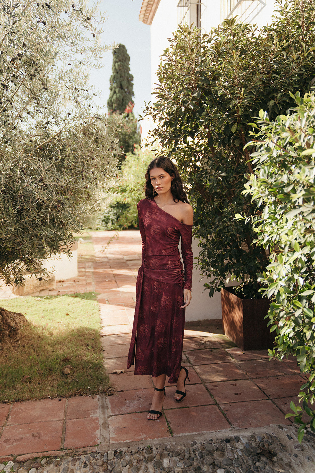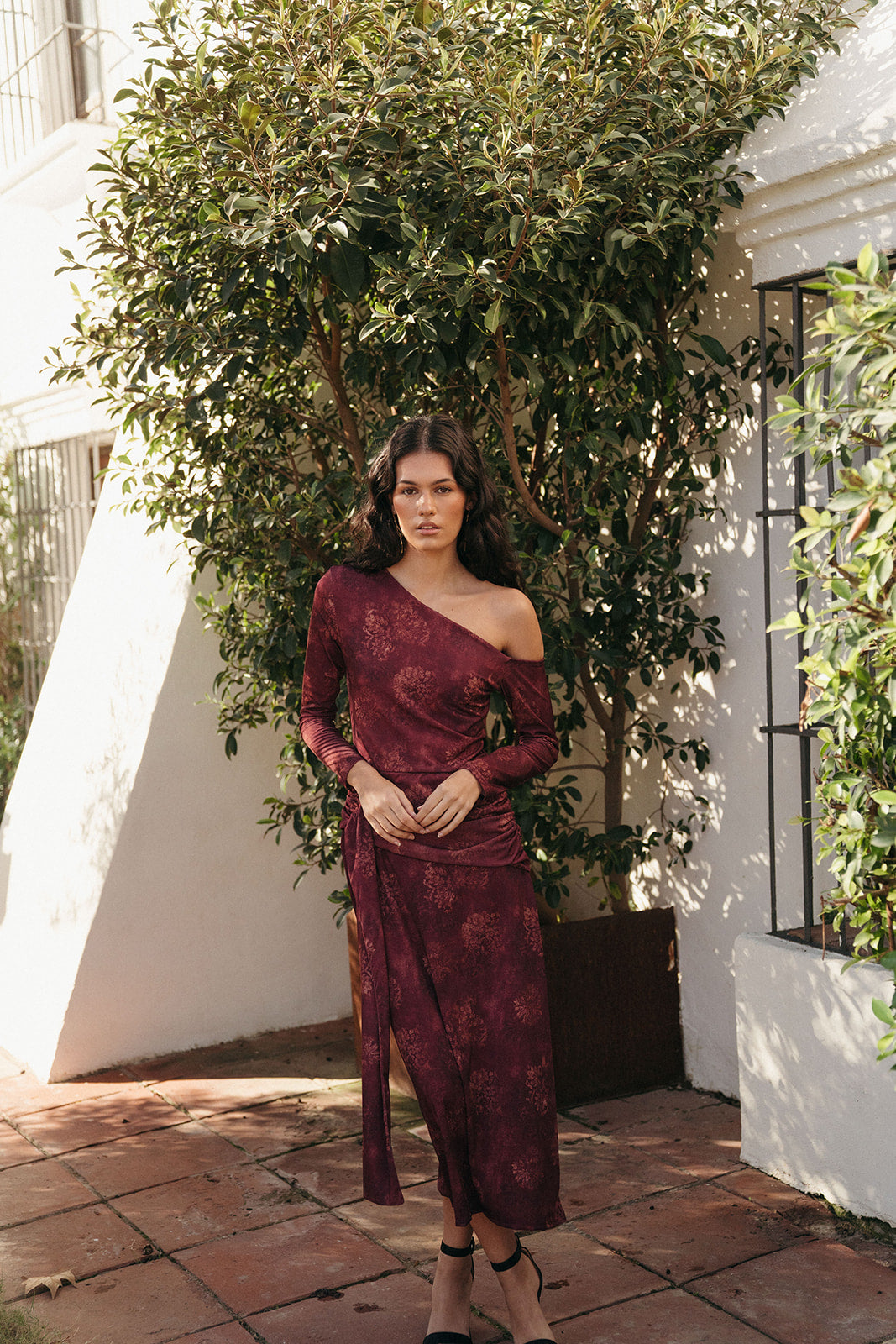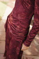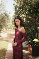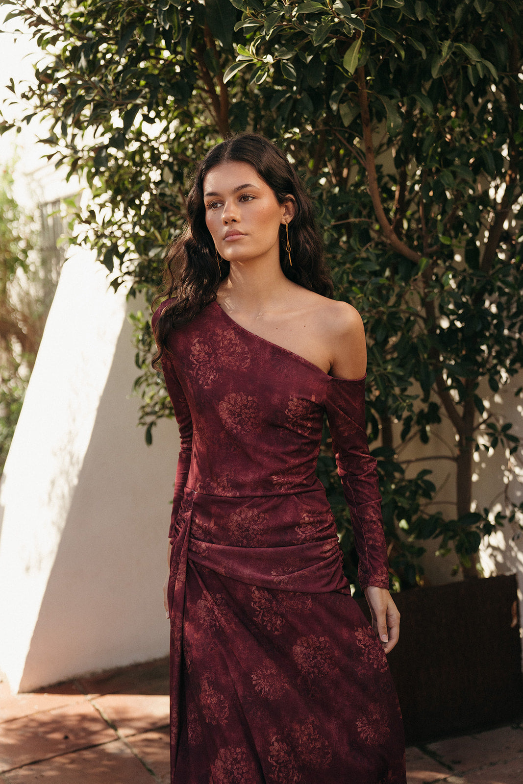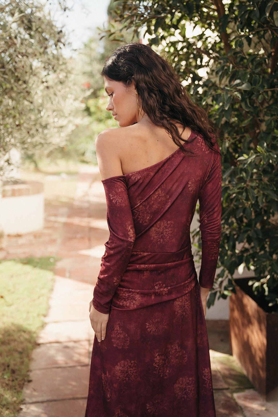 El Vestido Candela tiene cuello asimétrico, manga larga y un drapeado lateral que estiliza y realza la figura. Su estampado floral difuminado en tonos vino aporta profundidad y sofisticación sin recargar, convirtiéndolo en un vestido único para la temporada.