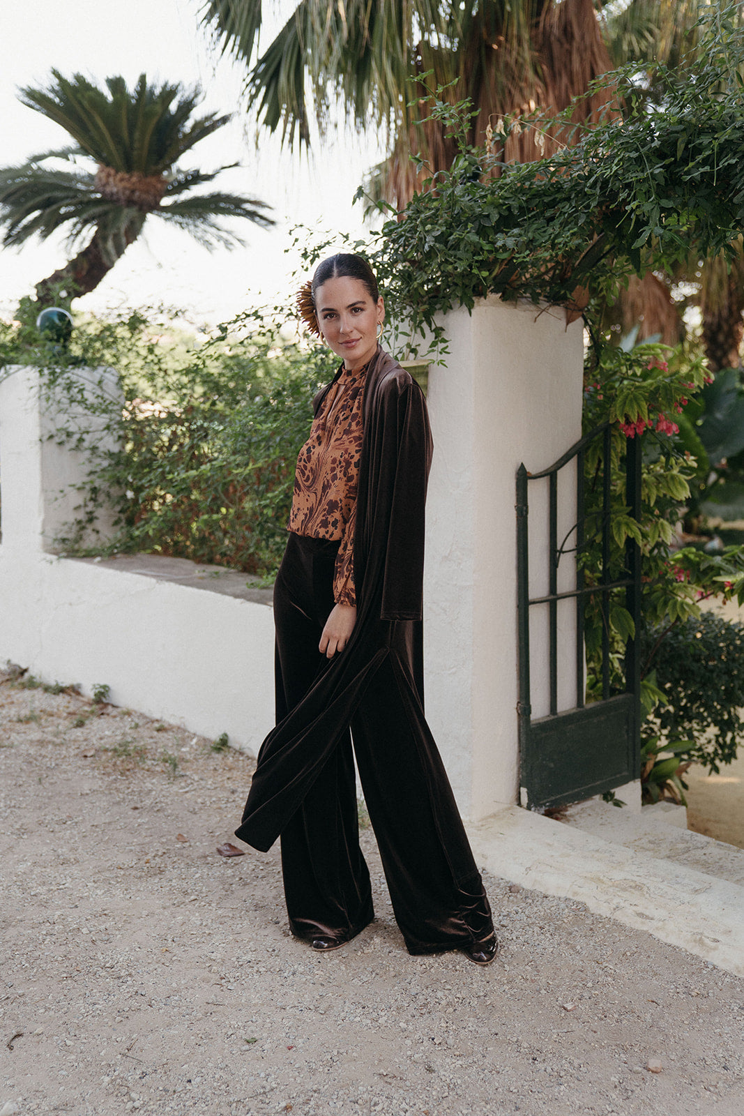 Pantalón en tejido de terciopelo con pata recta y elástico en la cintura. Nuestro pantalón de terciopelo tiene una caída y un corte que se ajusta fenomenal al cuerpo y lo hacen cómodo para llevar en todos tus eventos. Color chocolate.