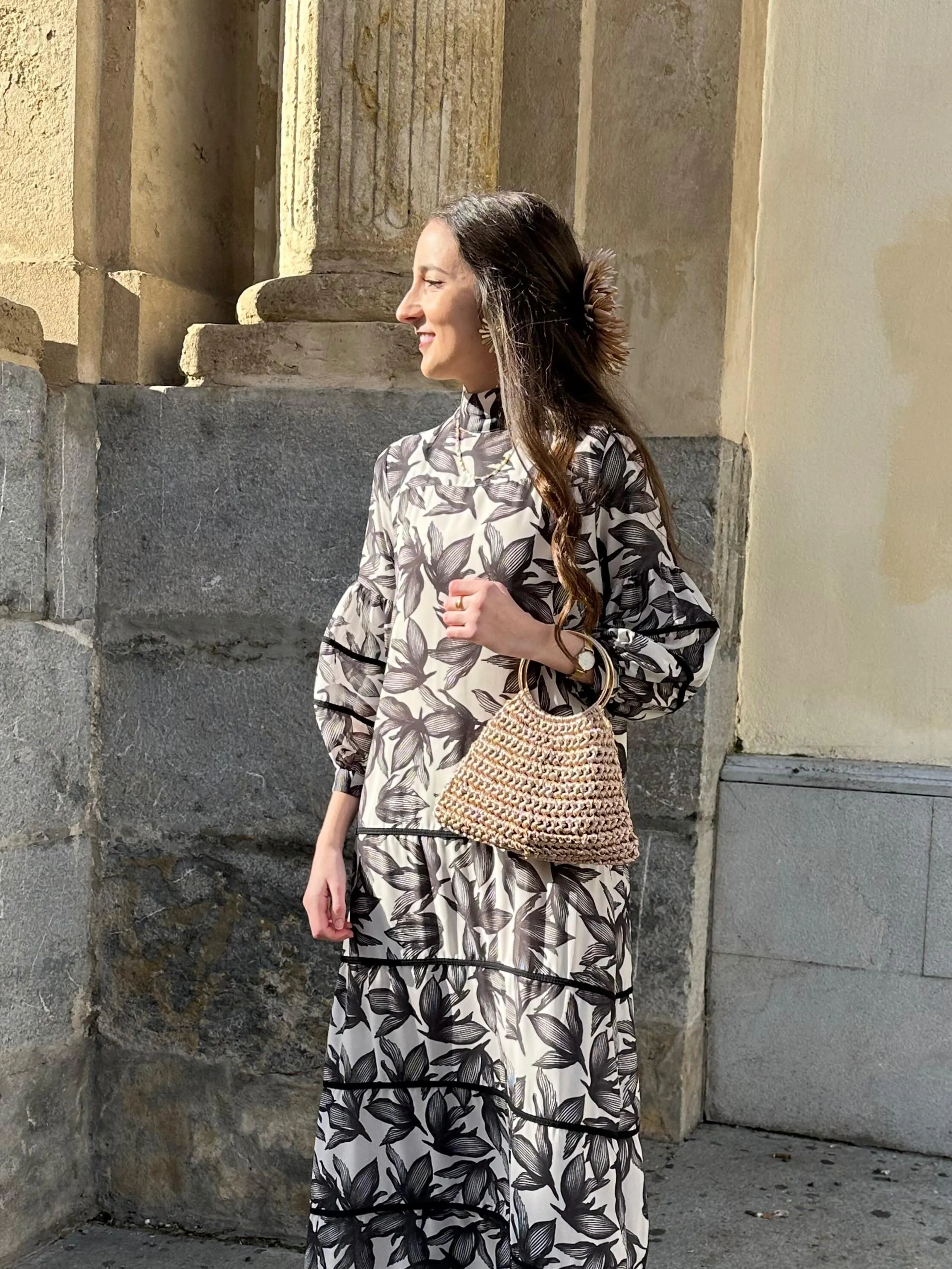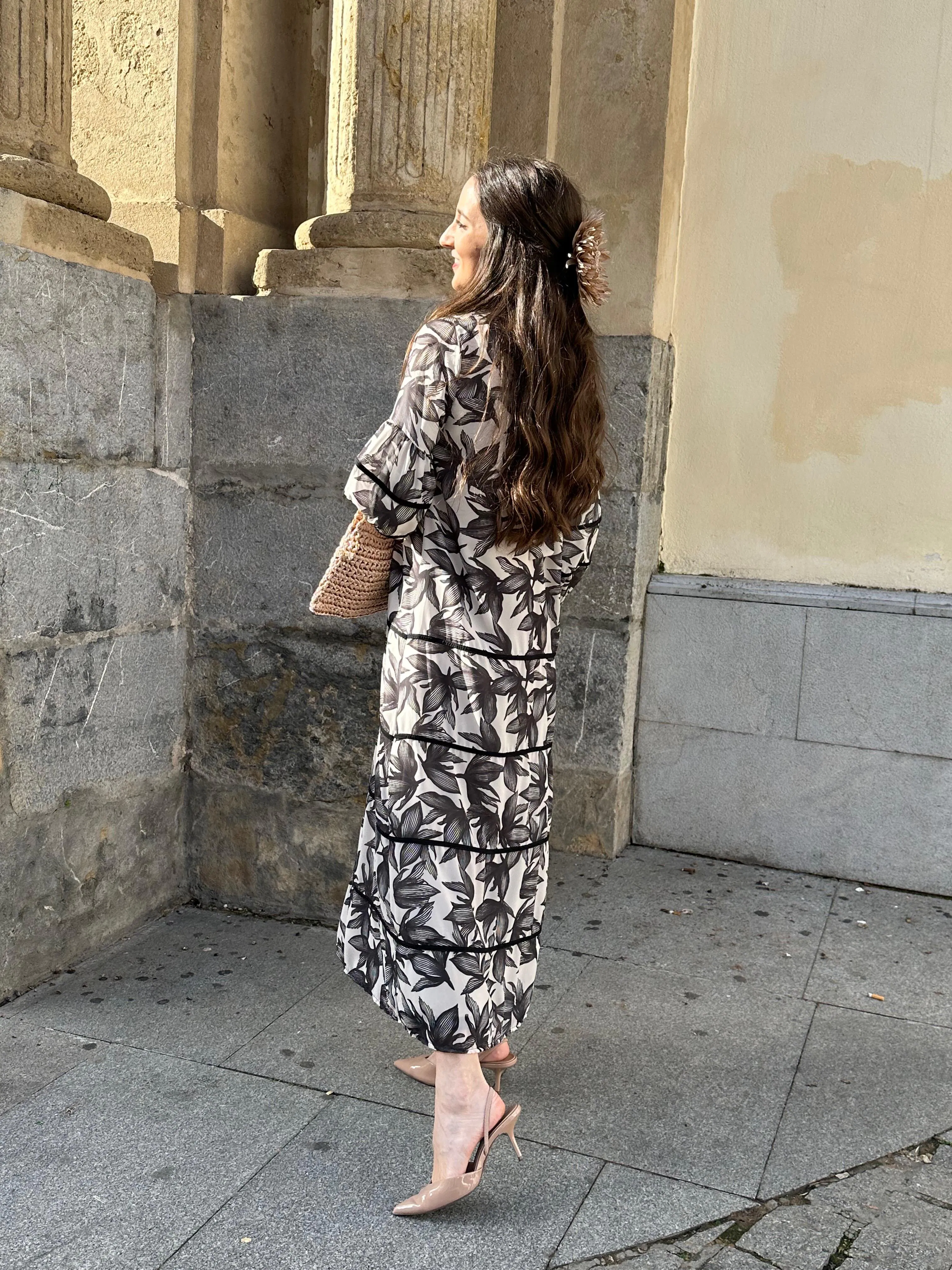 El vestido Pedrita Hojas destaca por su original estampado en flores crudo y negro. De corte recto y largo hasta midi manga francesa ligeramente abullonada y vivos a tono en mangas y bajo que le dan un toque muy especial.