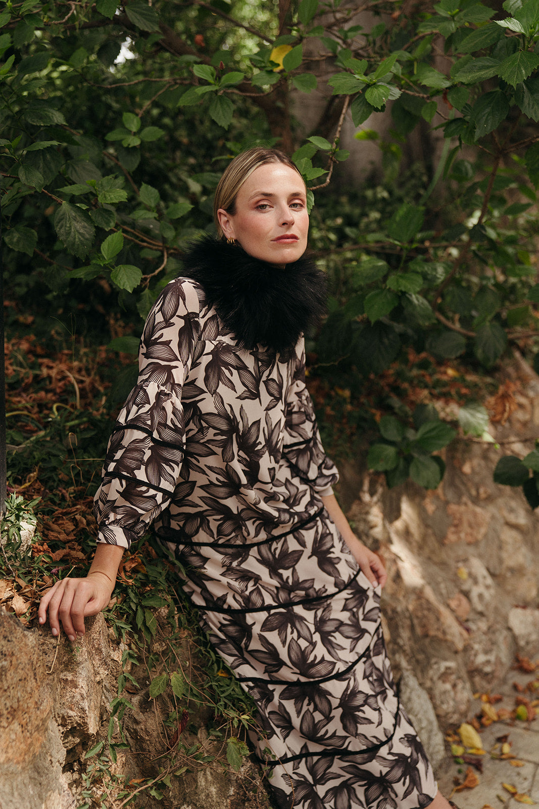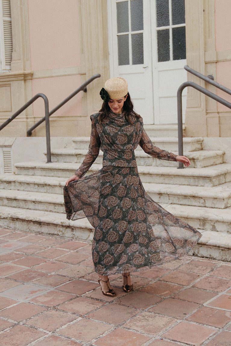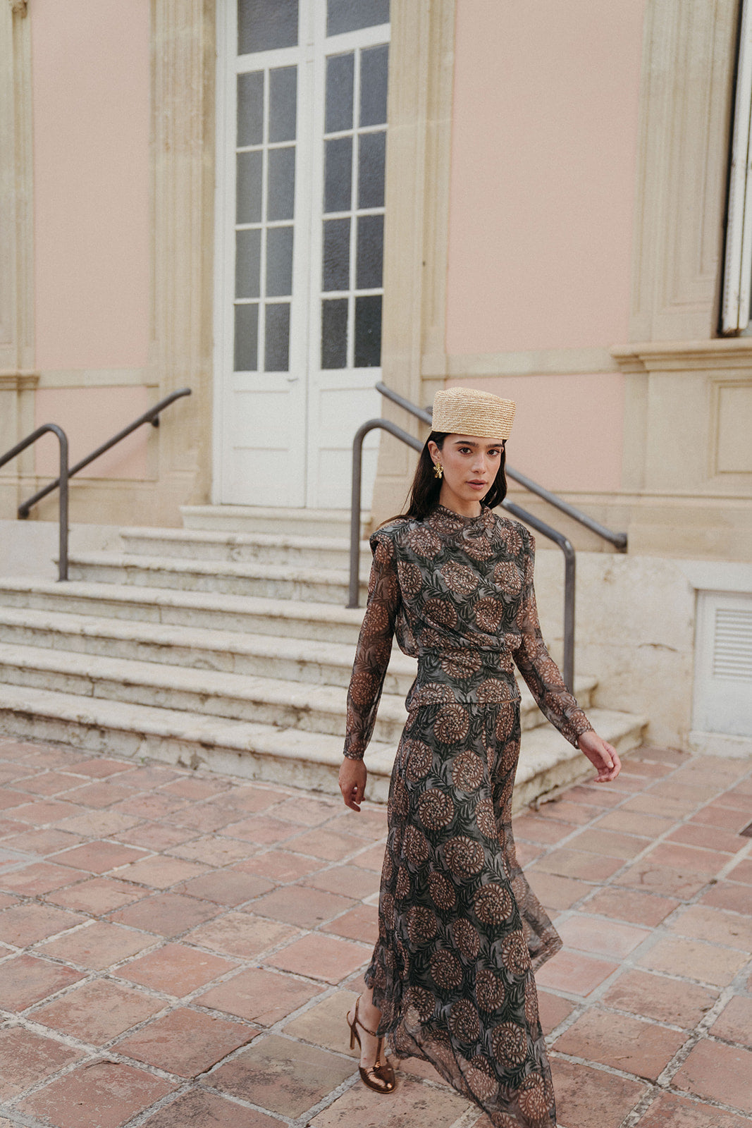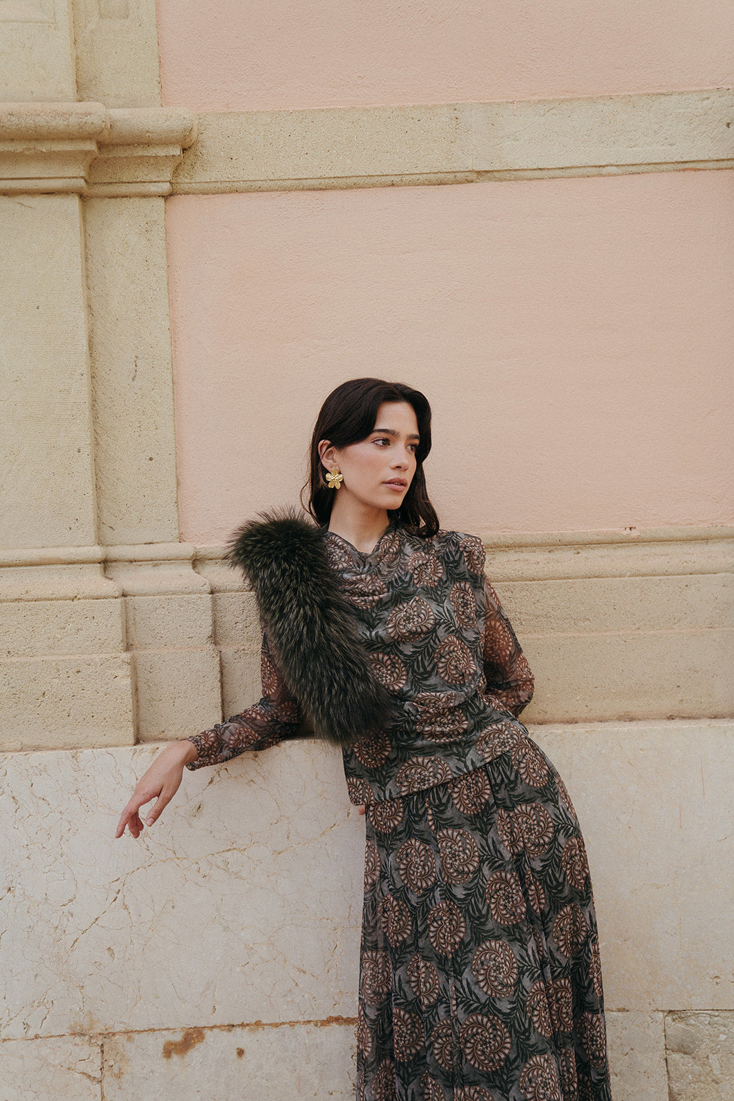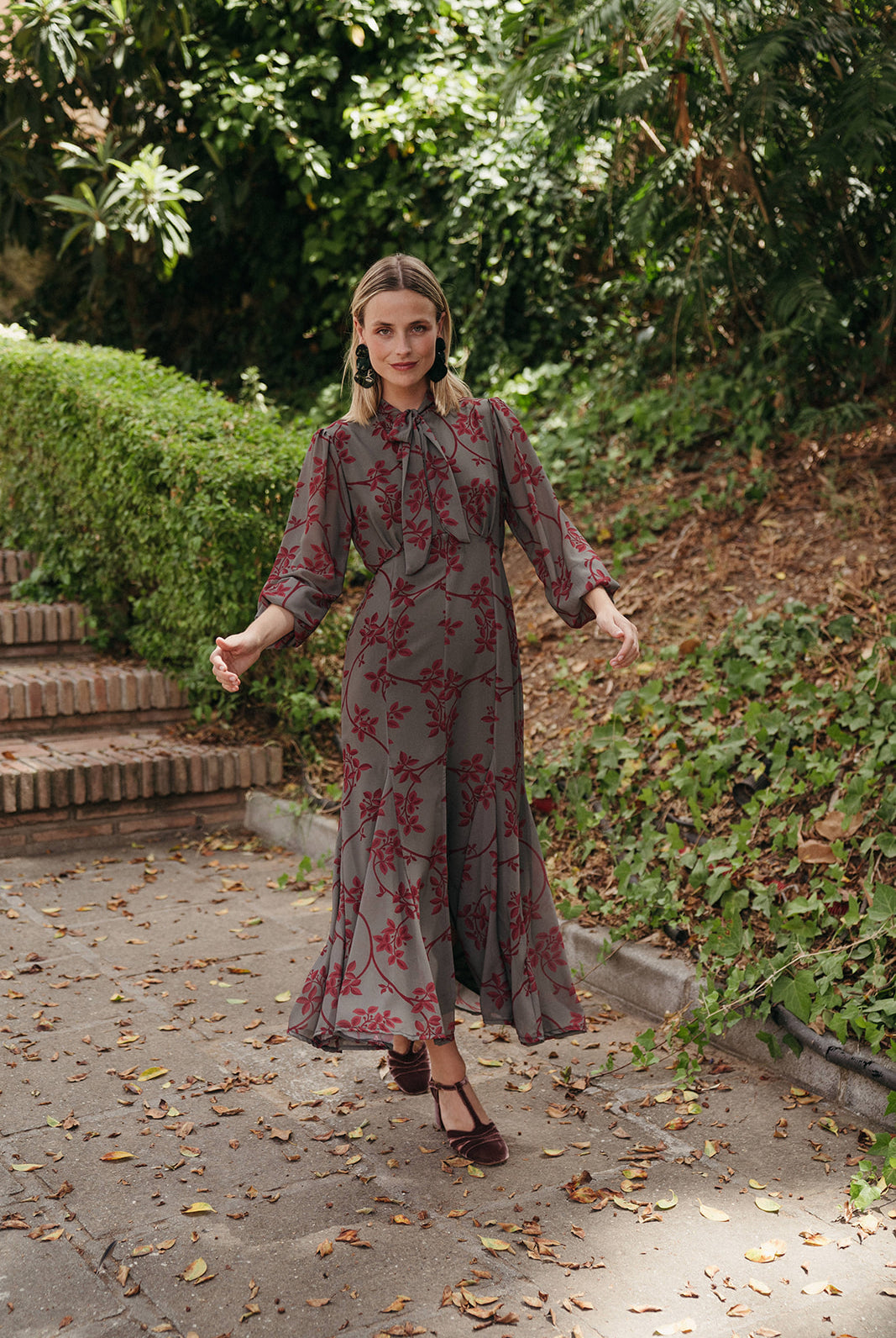 Estampados otoñales, siluetas con movimiento y tejidos con cuerpo, pensados para bodas entre septiembre y noviembre.