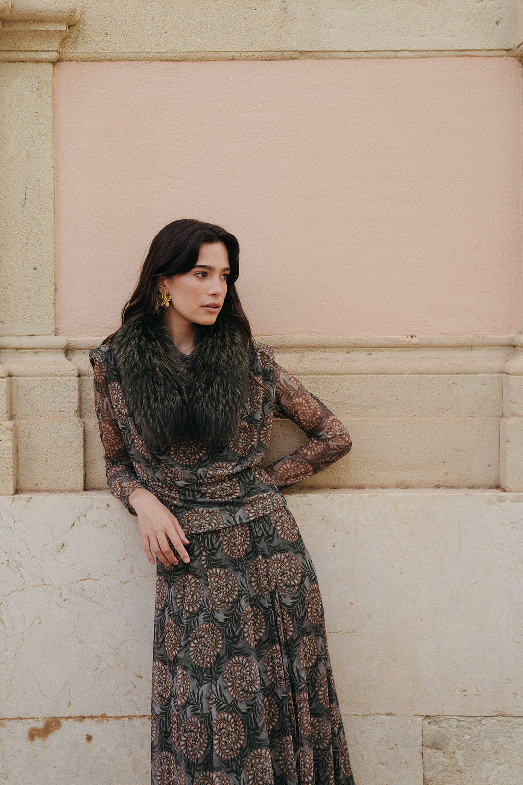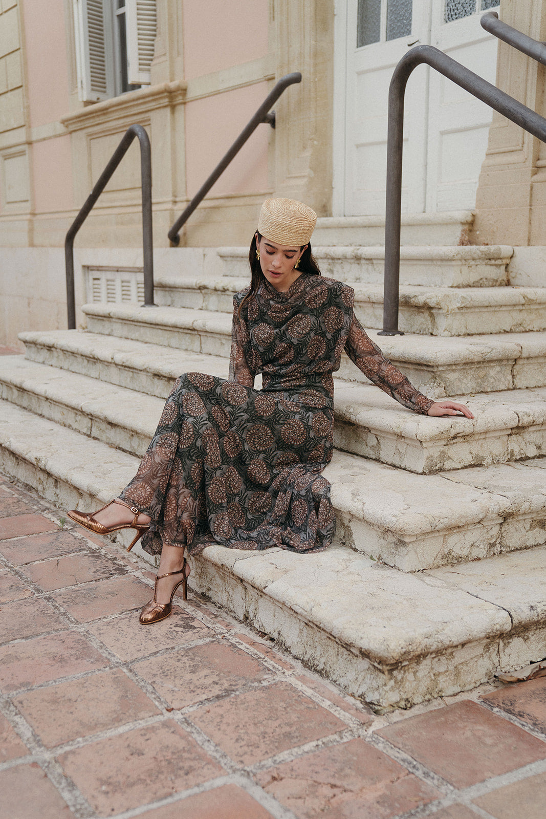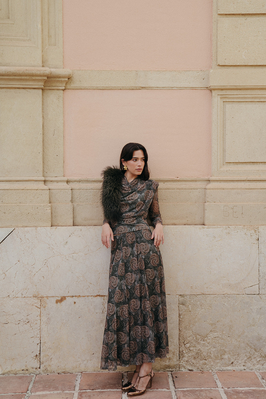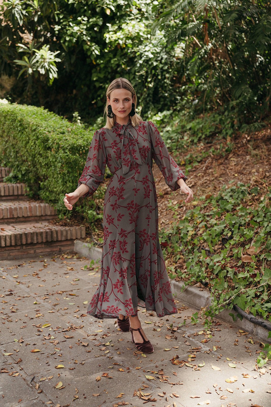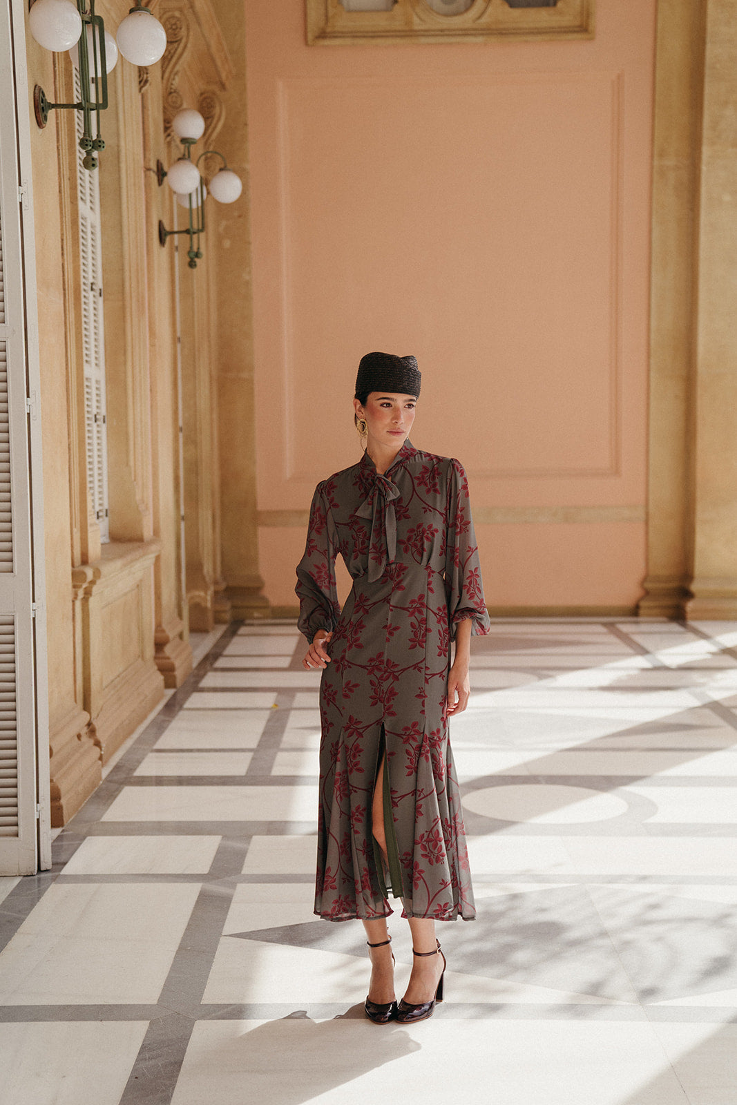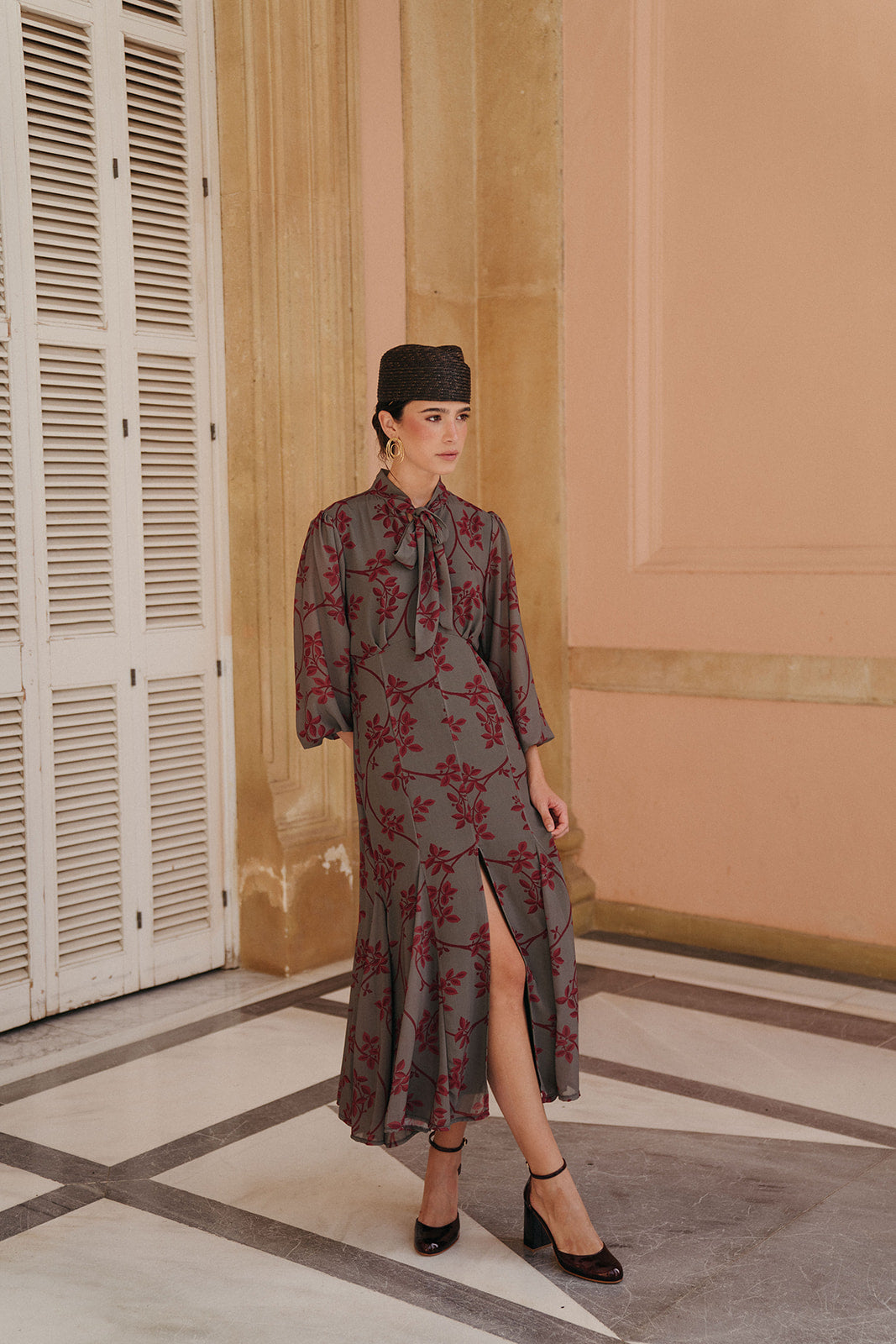 Estampados otoñales, siluetas con movimiento y tejidos con cuerpo, pensados para bodas entre septiembre y noviembre.