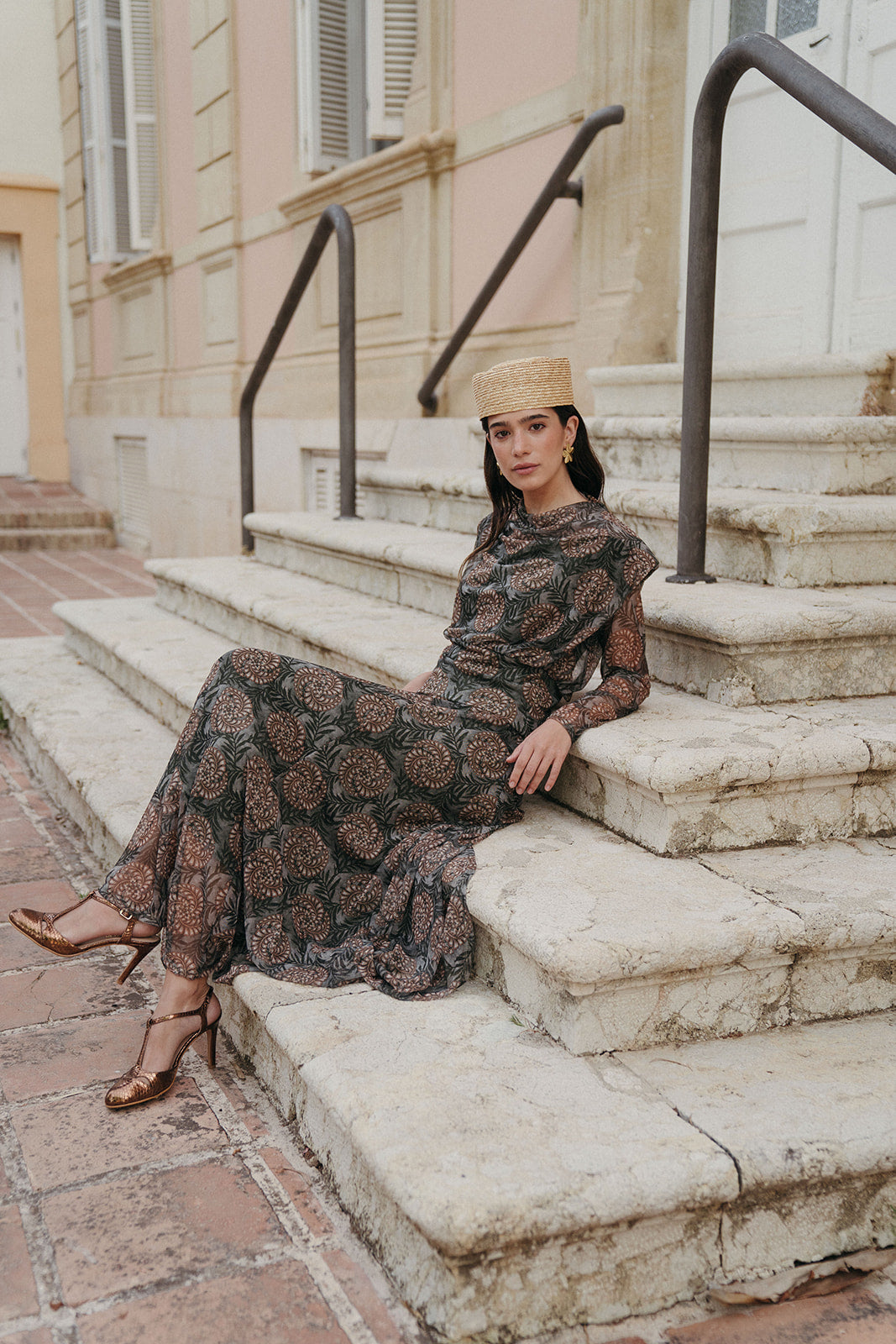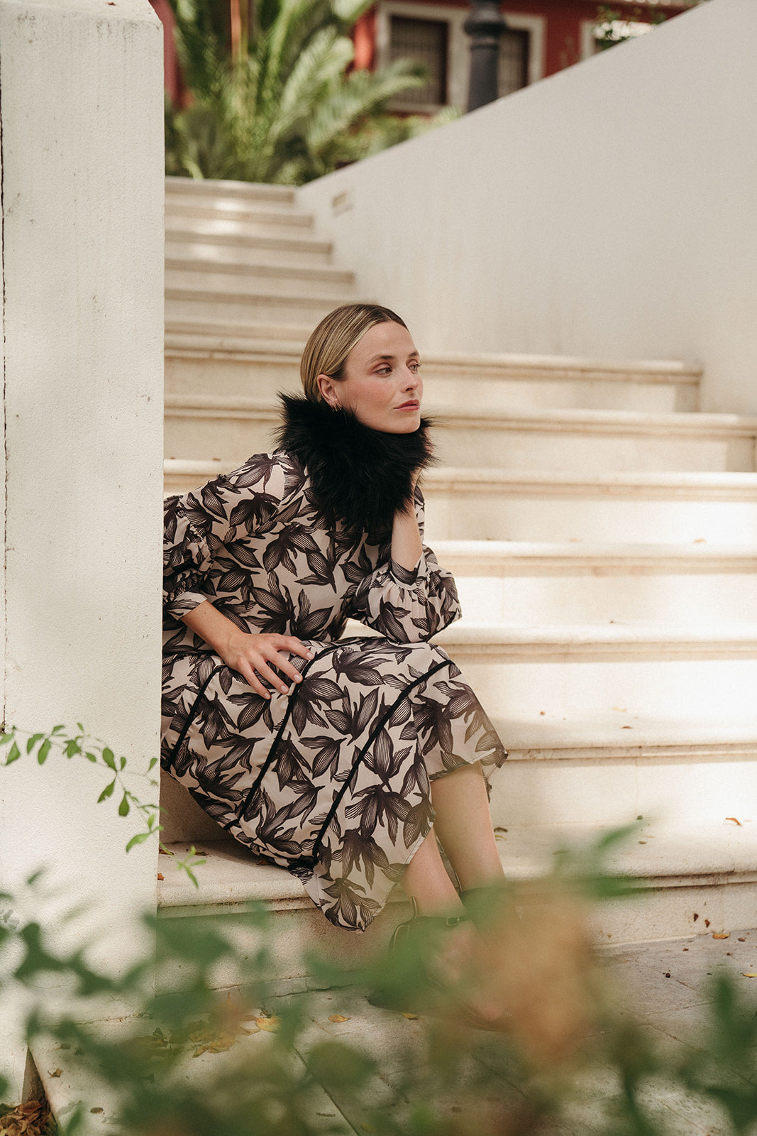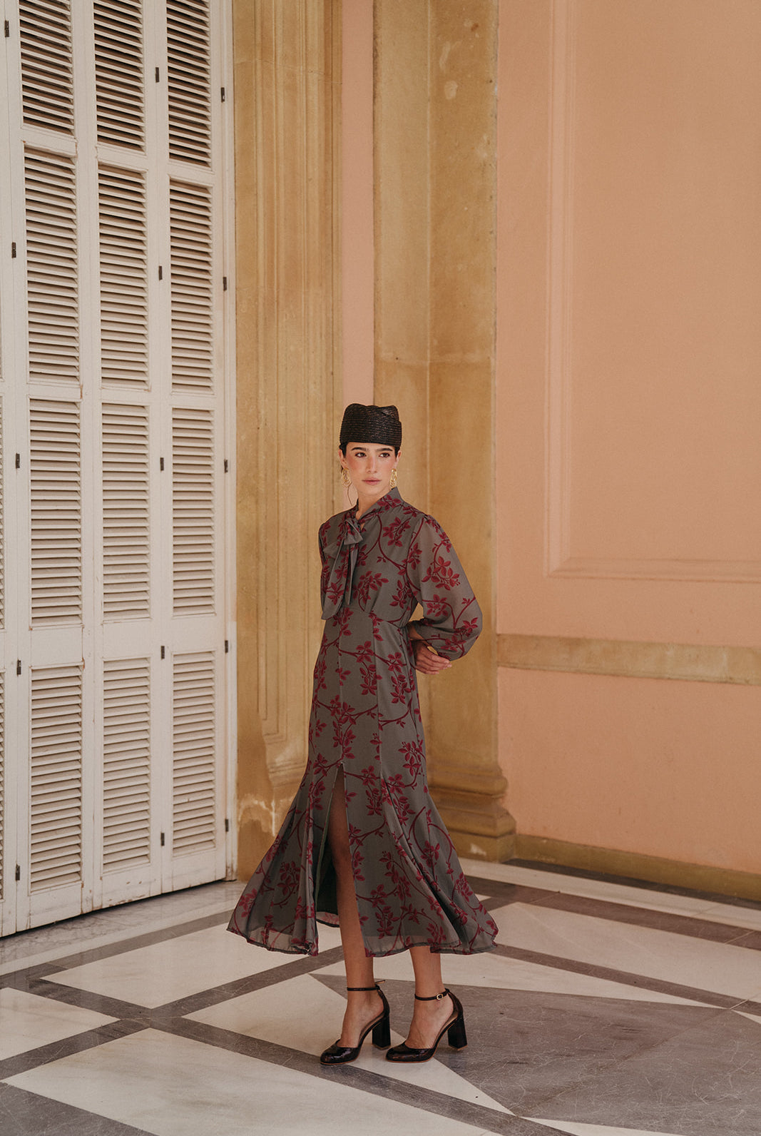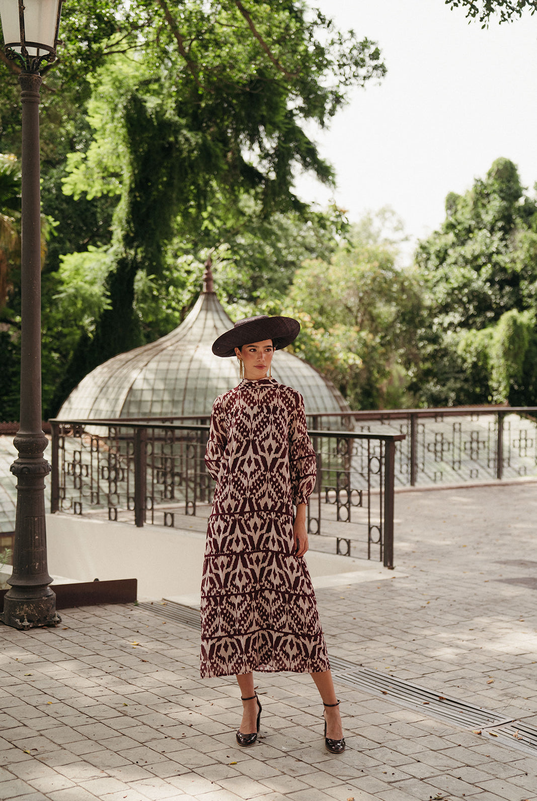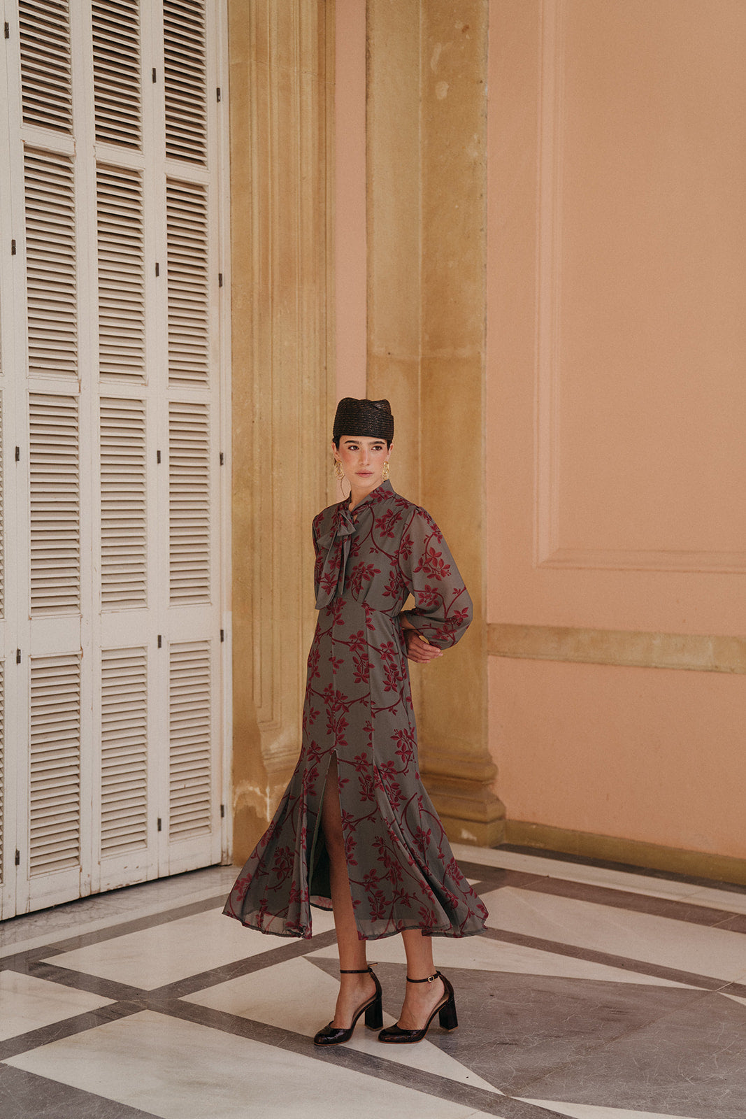 Estampados otoñales, siluetas con movimiento y tejidos con cuerpo, pensados para bodas entre septiembre y noviembre.