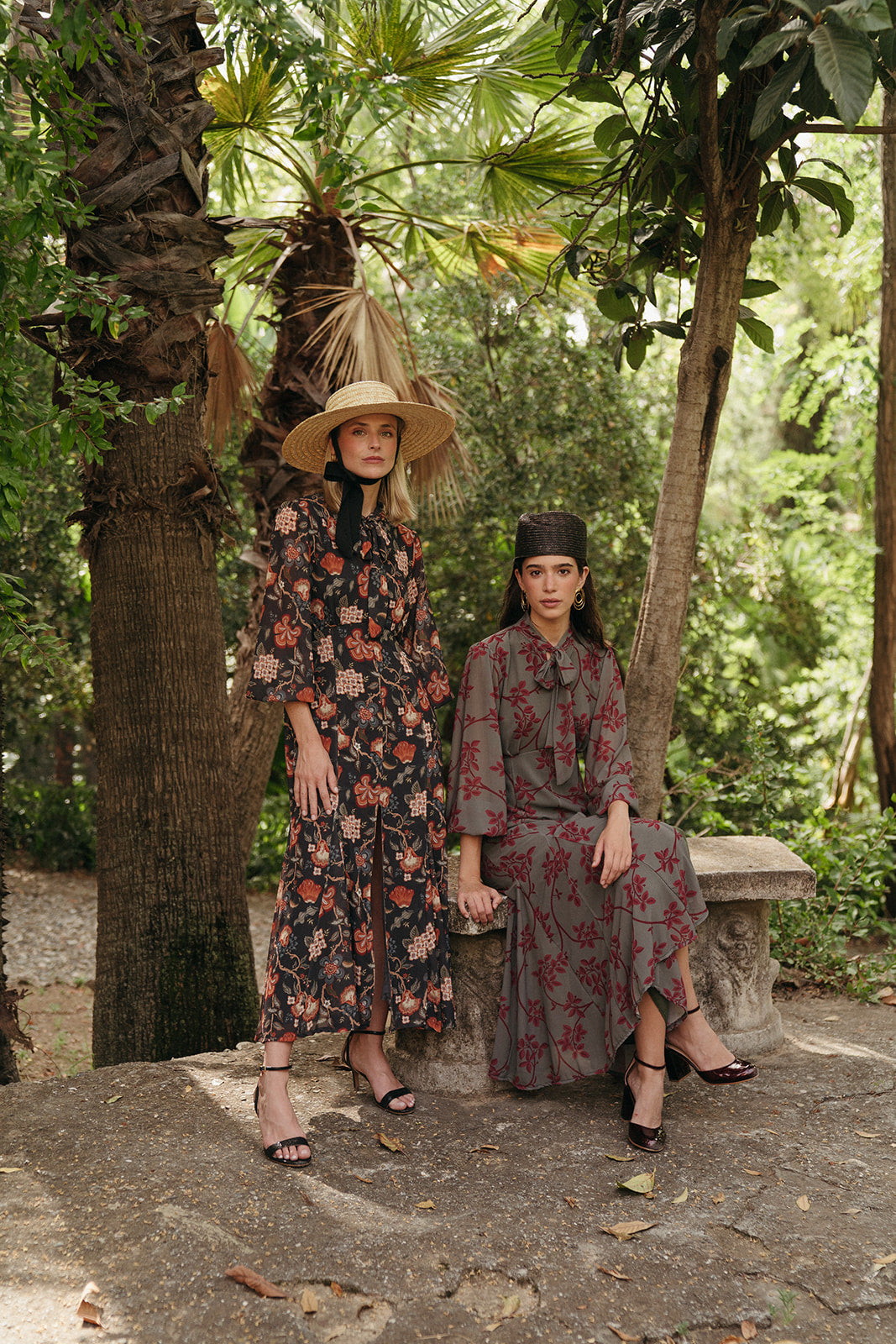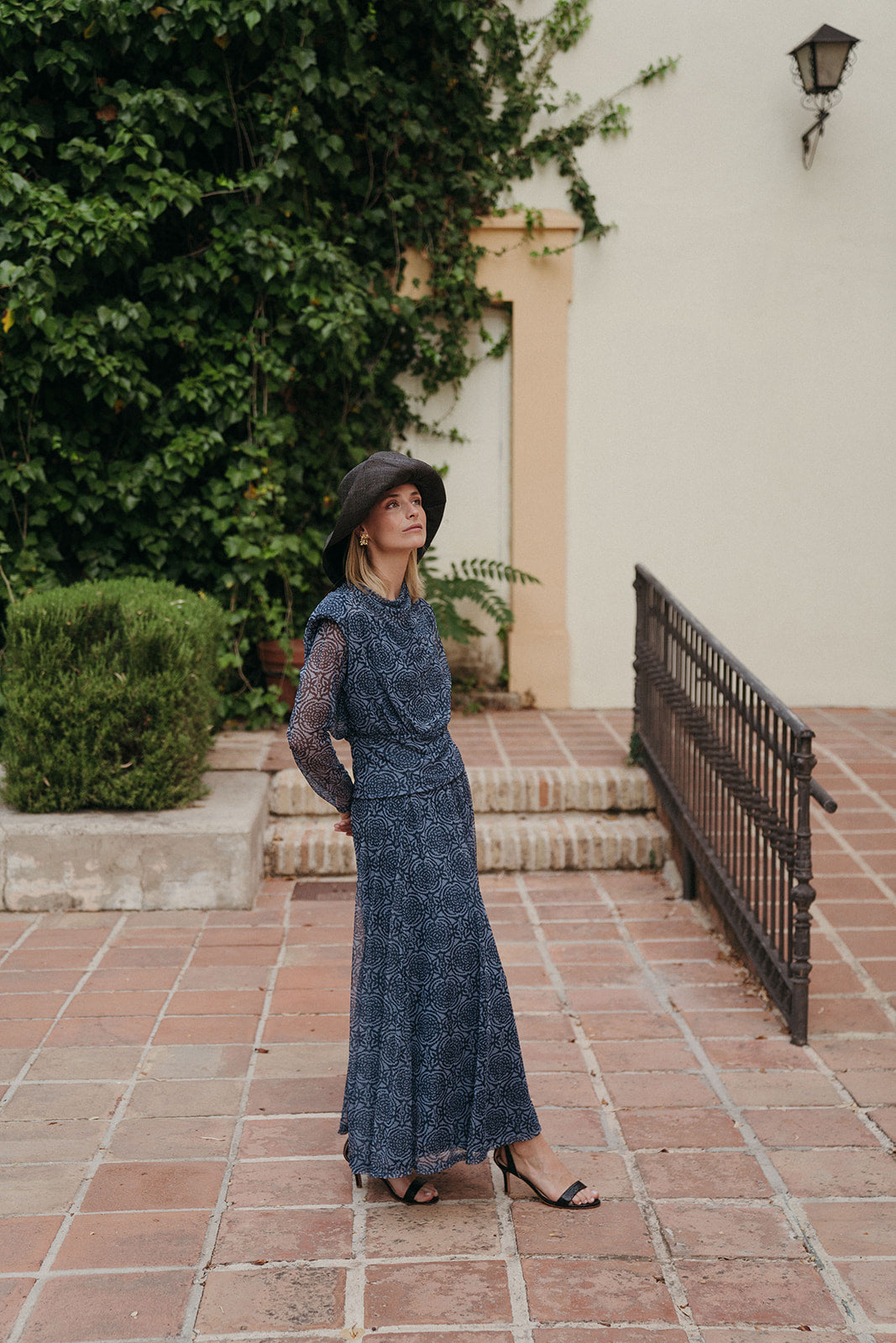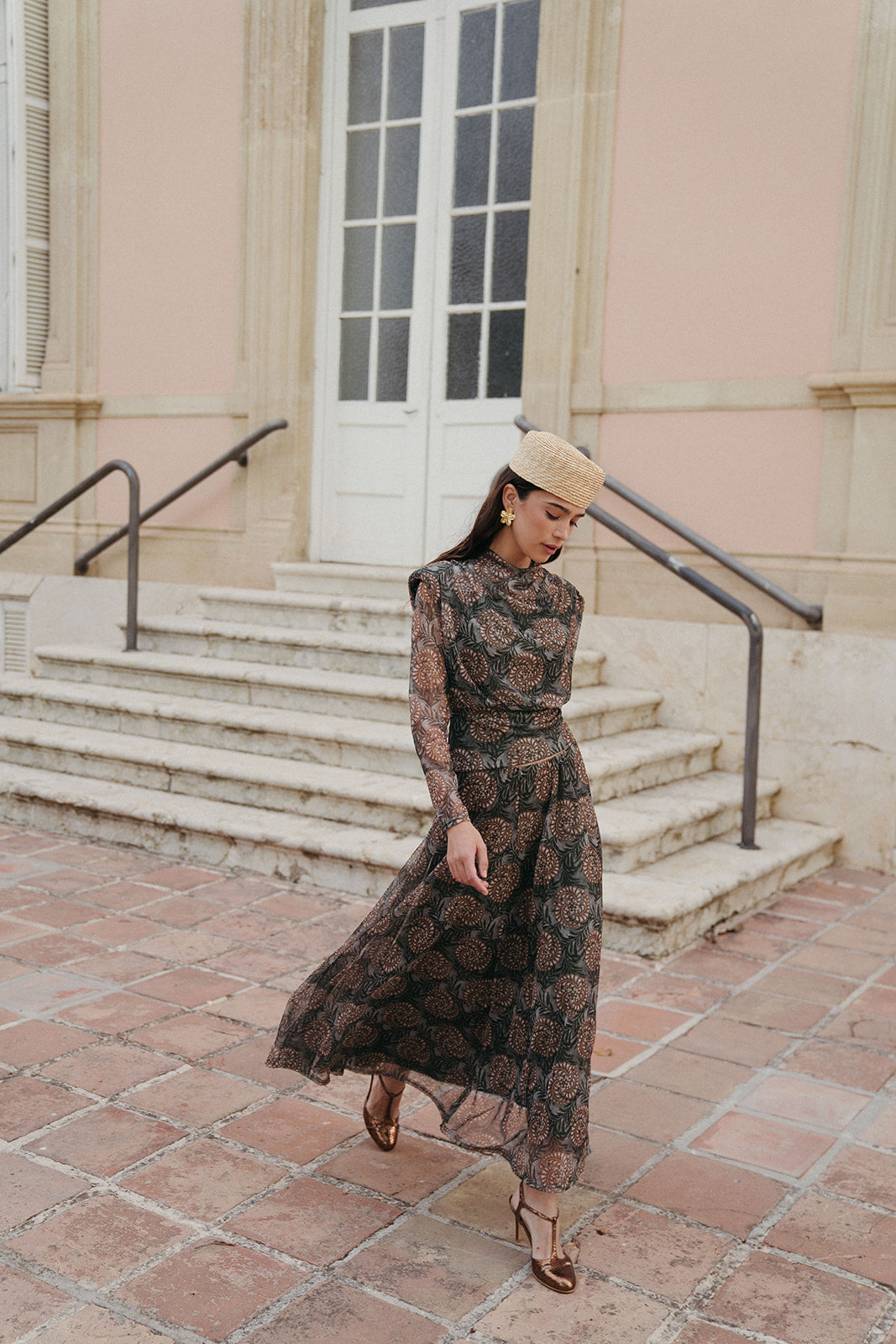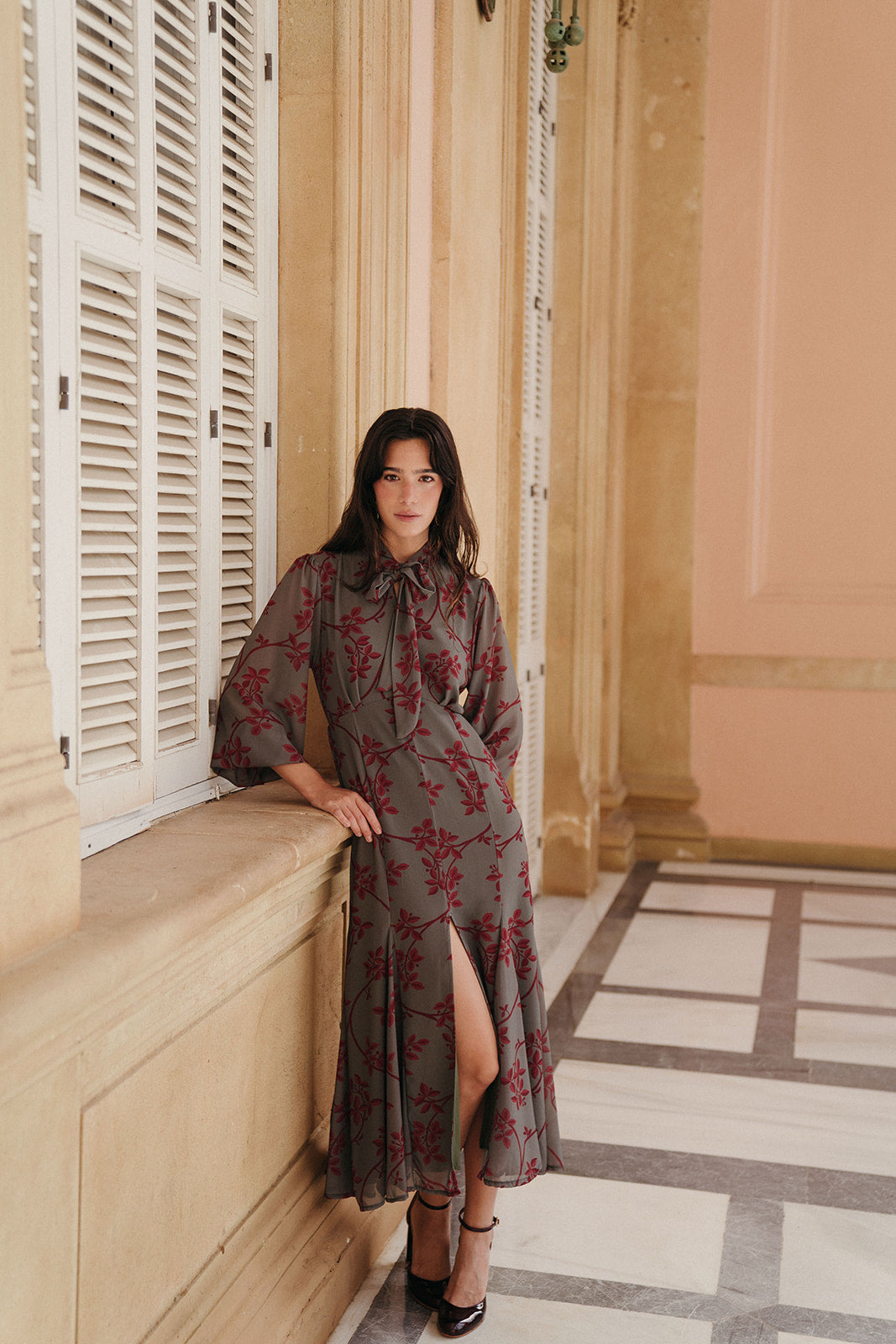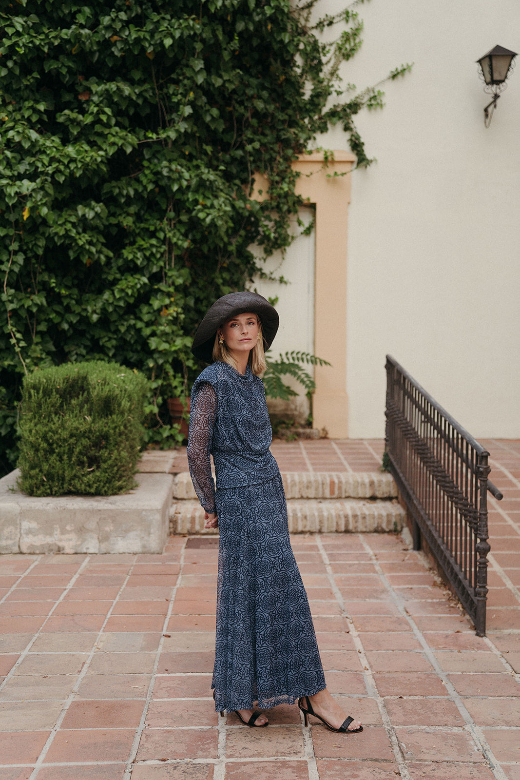 Estampados otoñales, siluetas con movimiento y tejidos con cuerpo, pensados para bodas entre septiembre y noviembre.