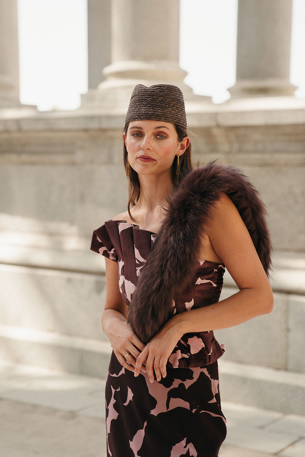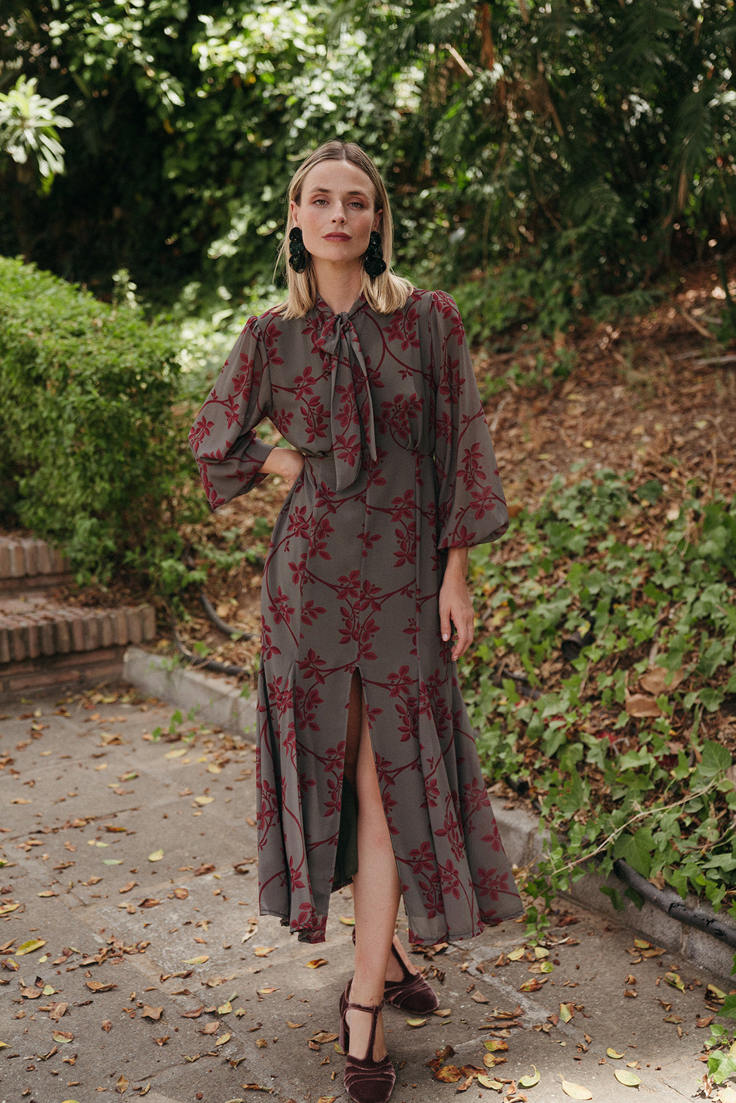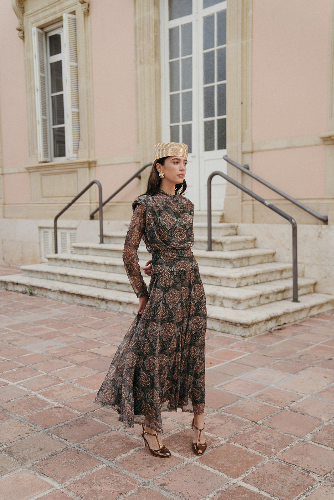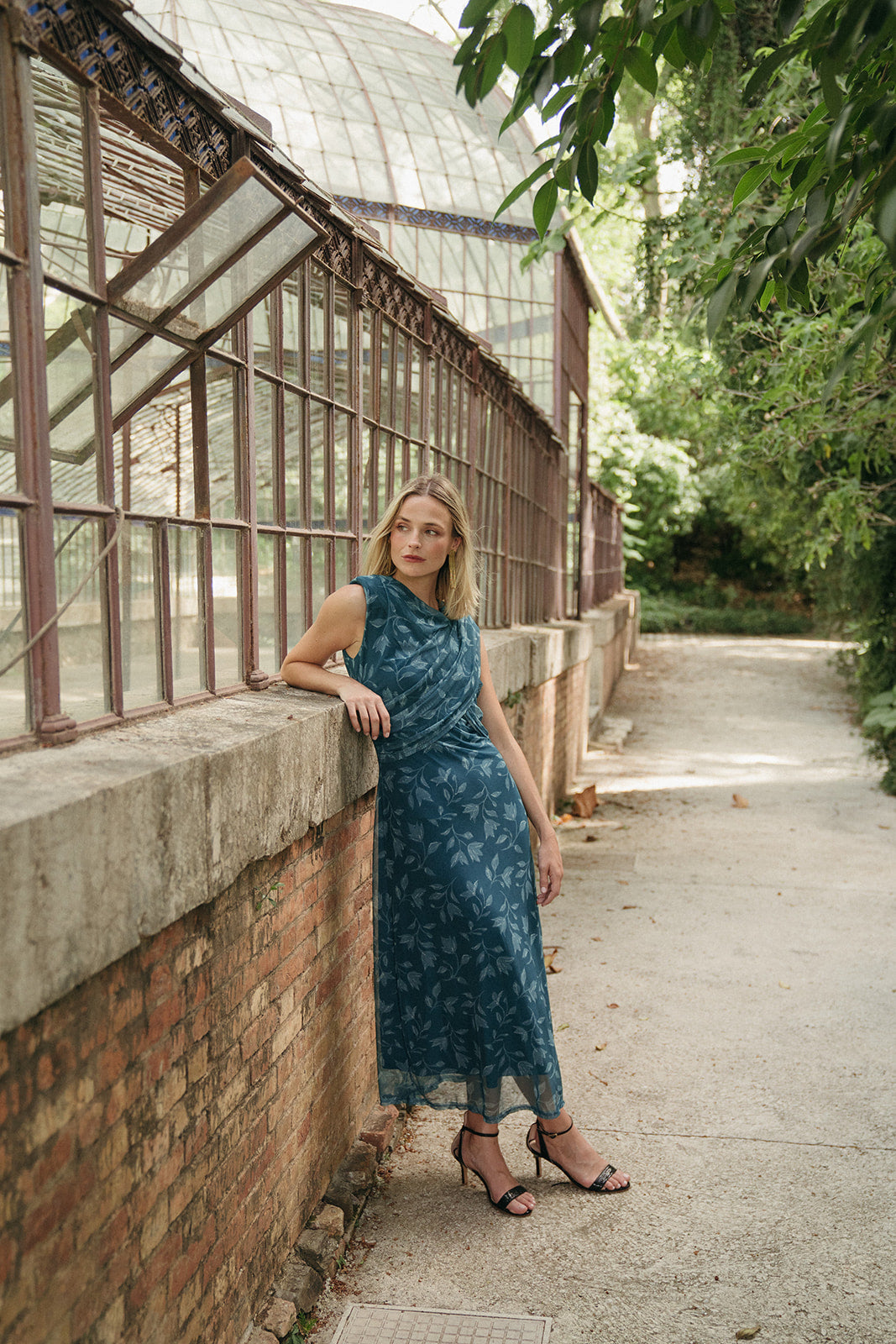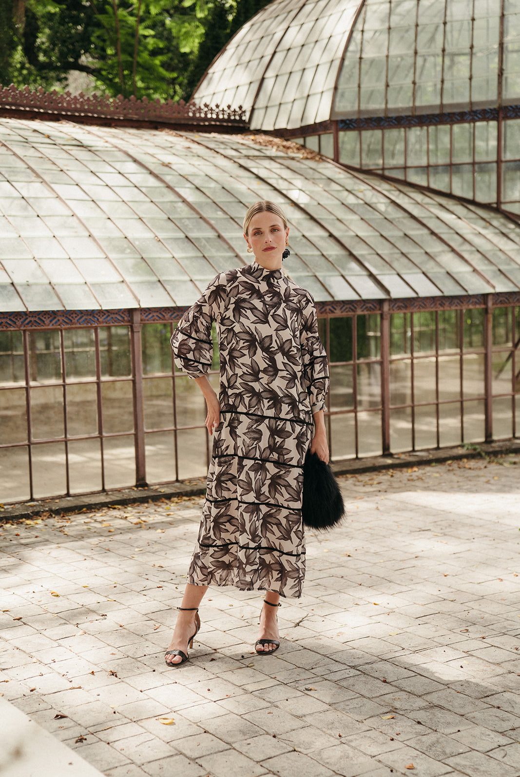 Estampados otoñales, siluetas con movimiento y tejidos con cuerpo, pensados para bodas entre septiembre y noviembre.