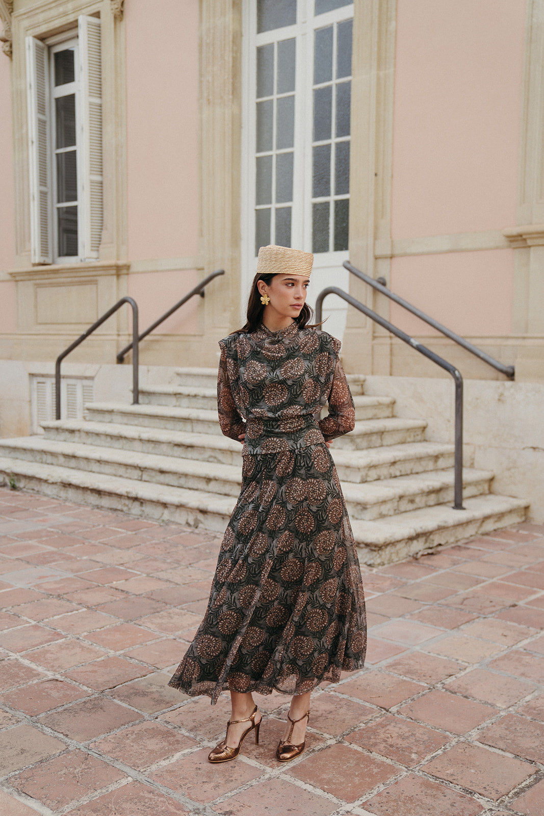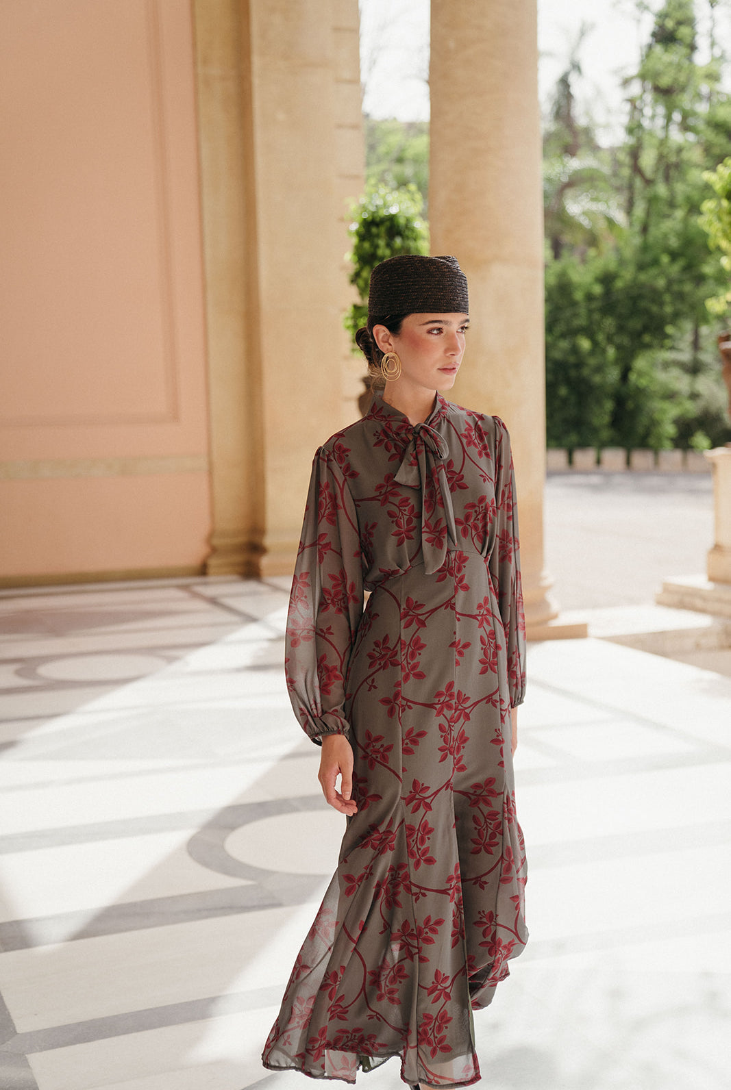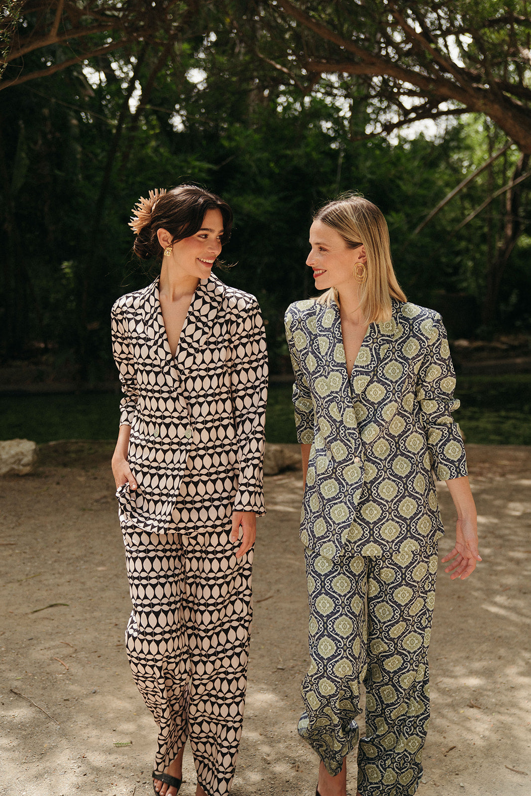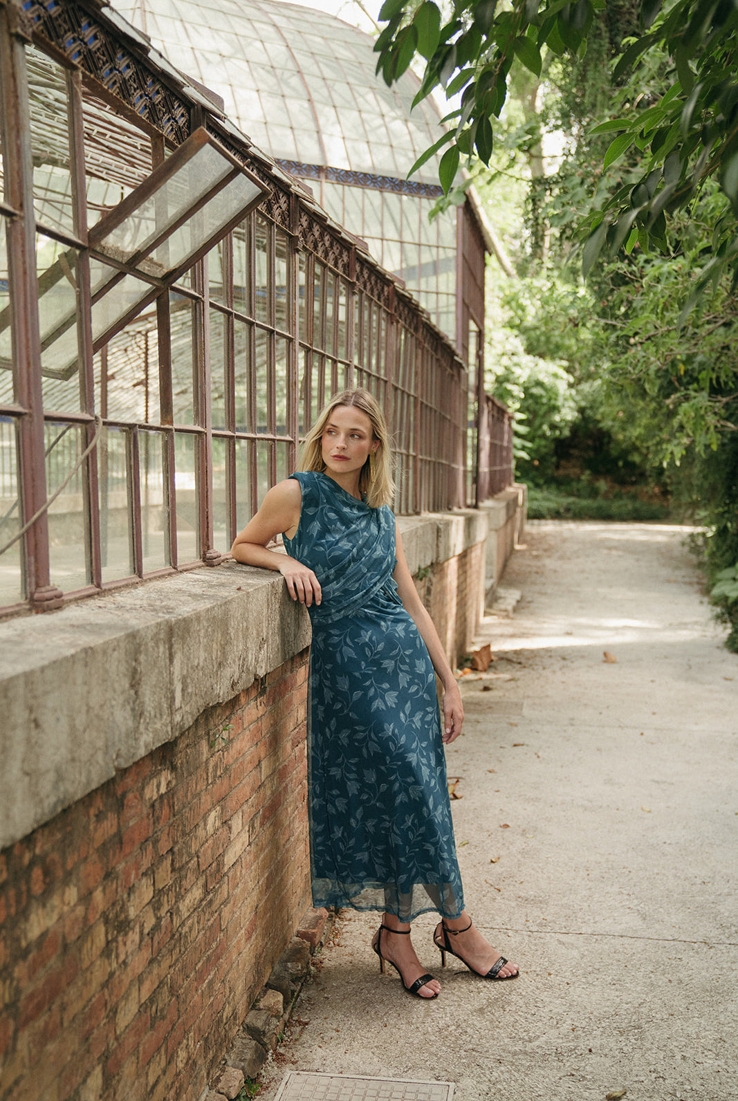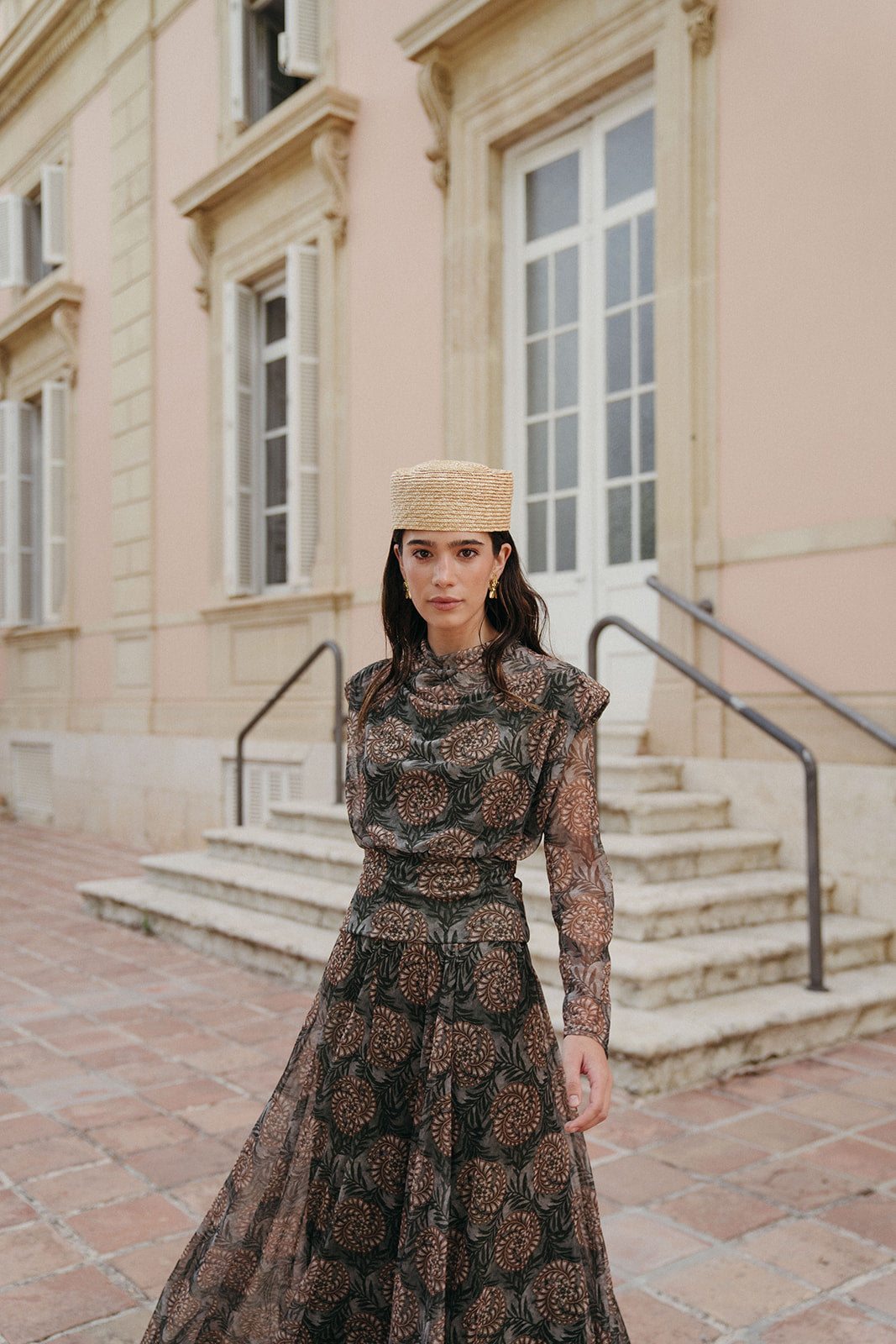 Estampados otoñales, siluetas con movimiento y tejidos con cuerpo, pensados para bodas entre septiembre y noviembre.
