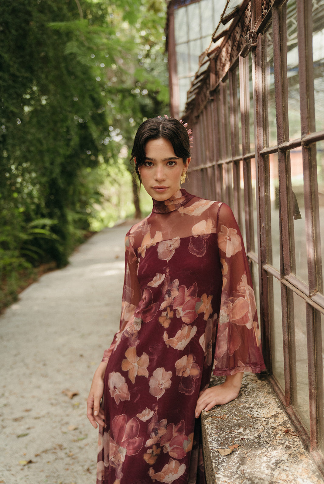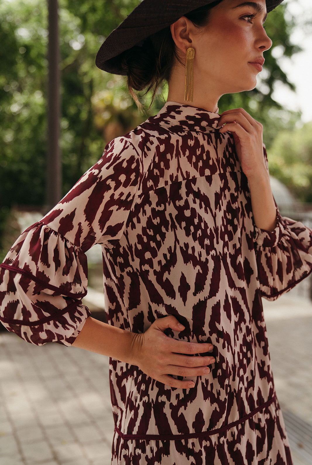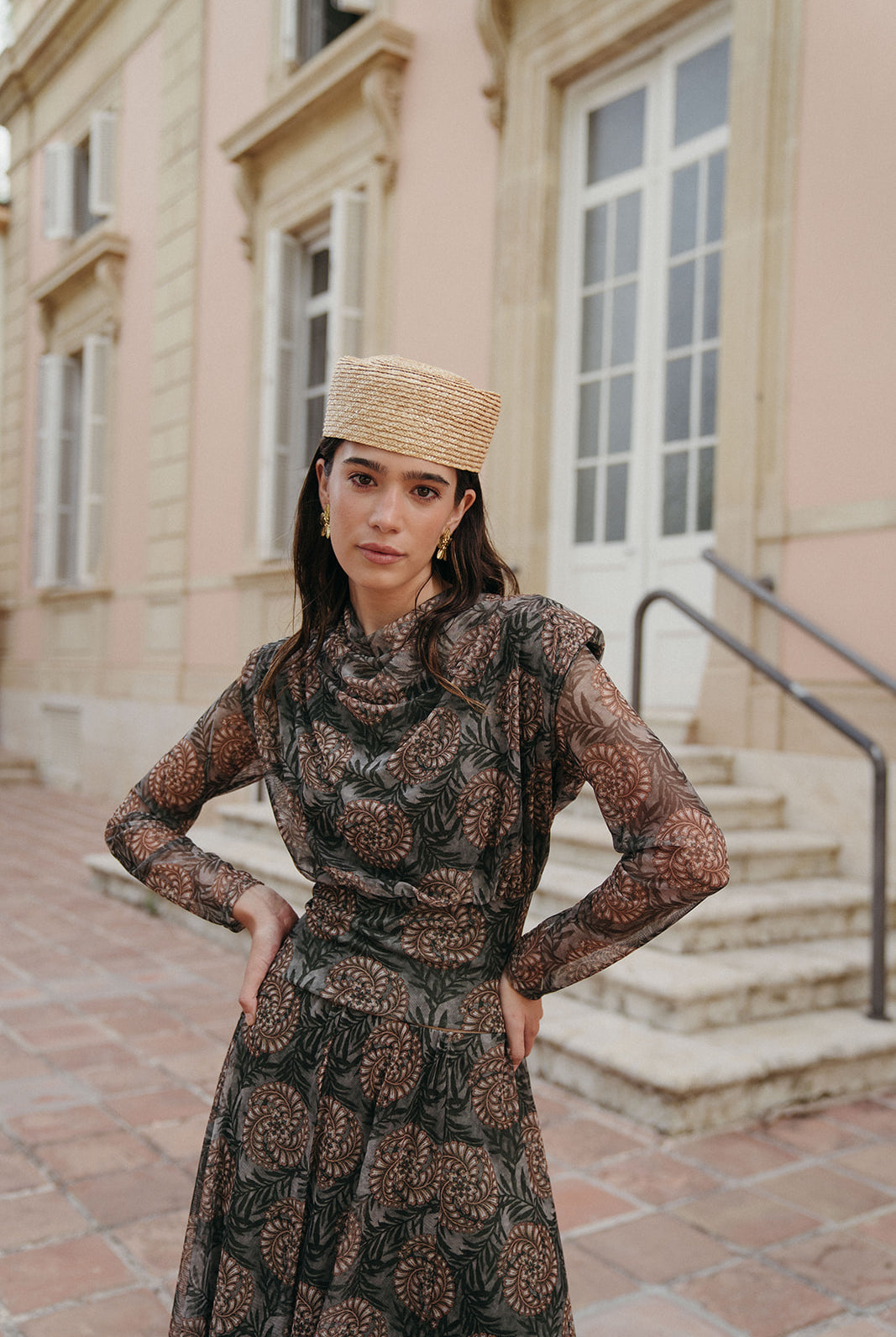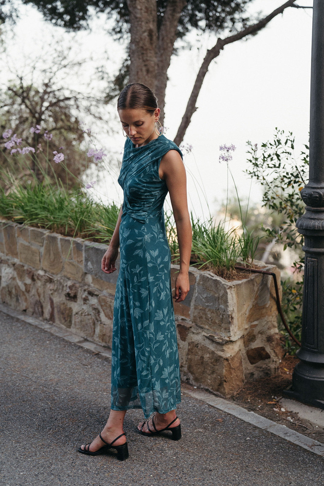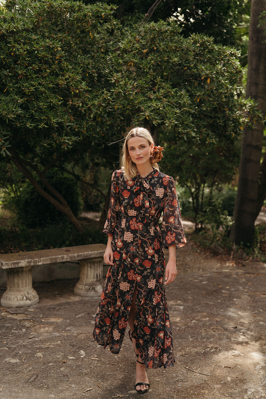 Estampados otoñales, siluetas con movimiento y tejidos con cuerpo, pensados para bodas entre septiembre y noviembre.