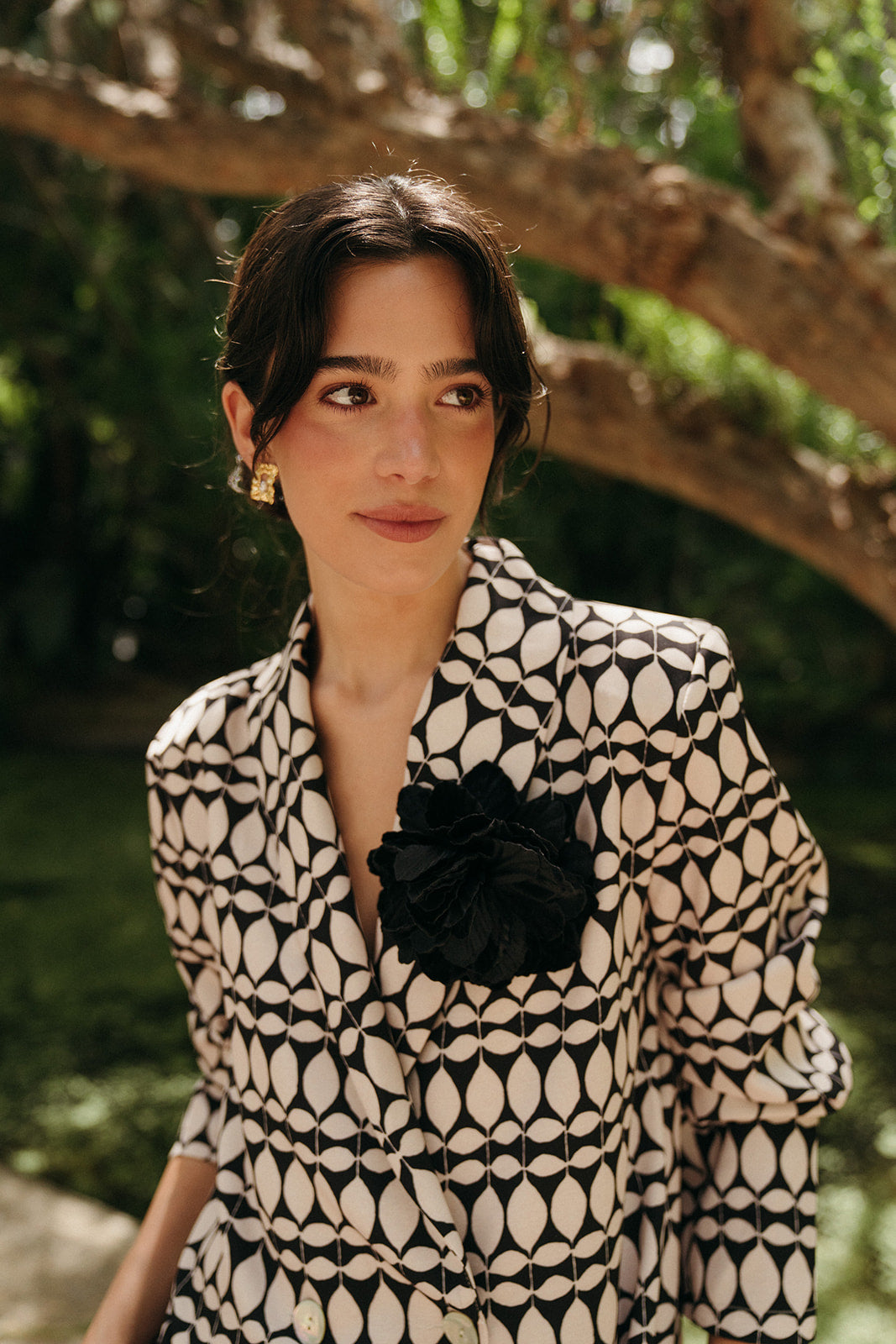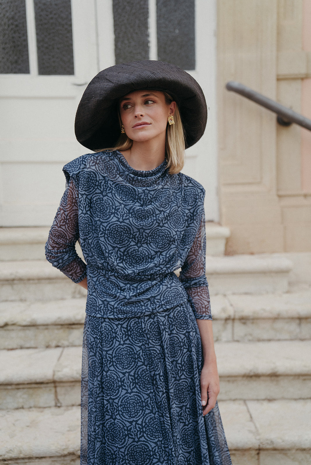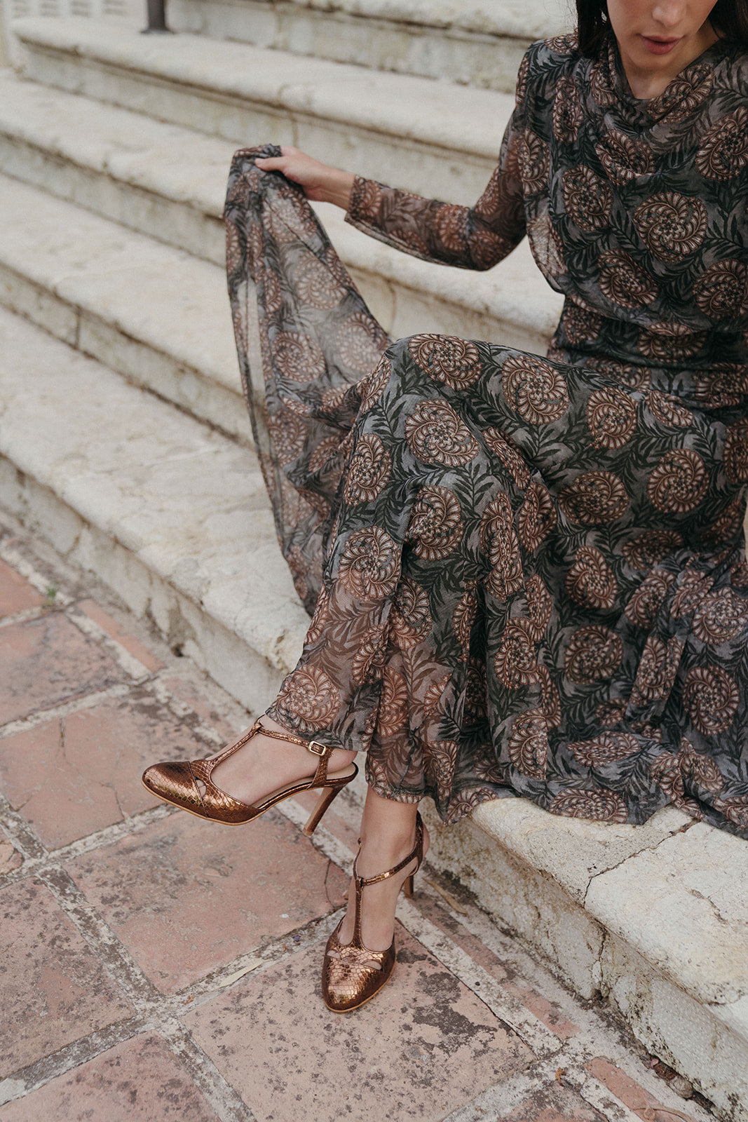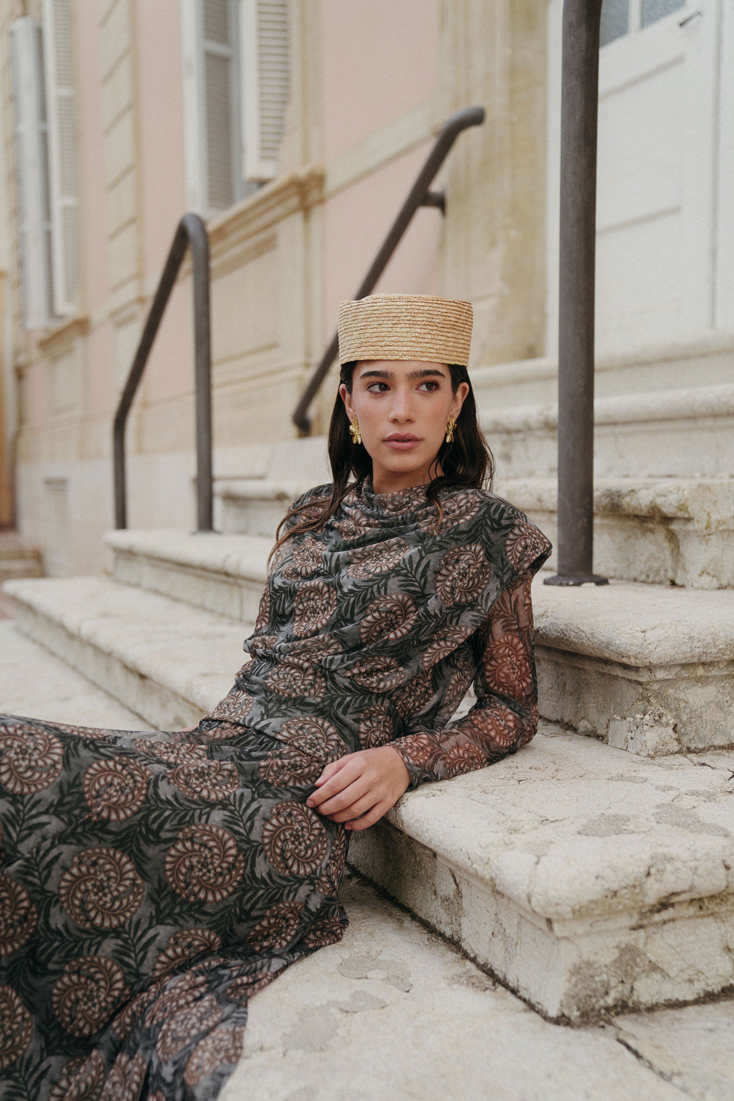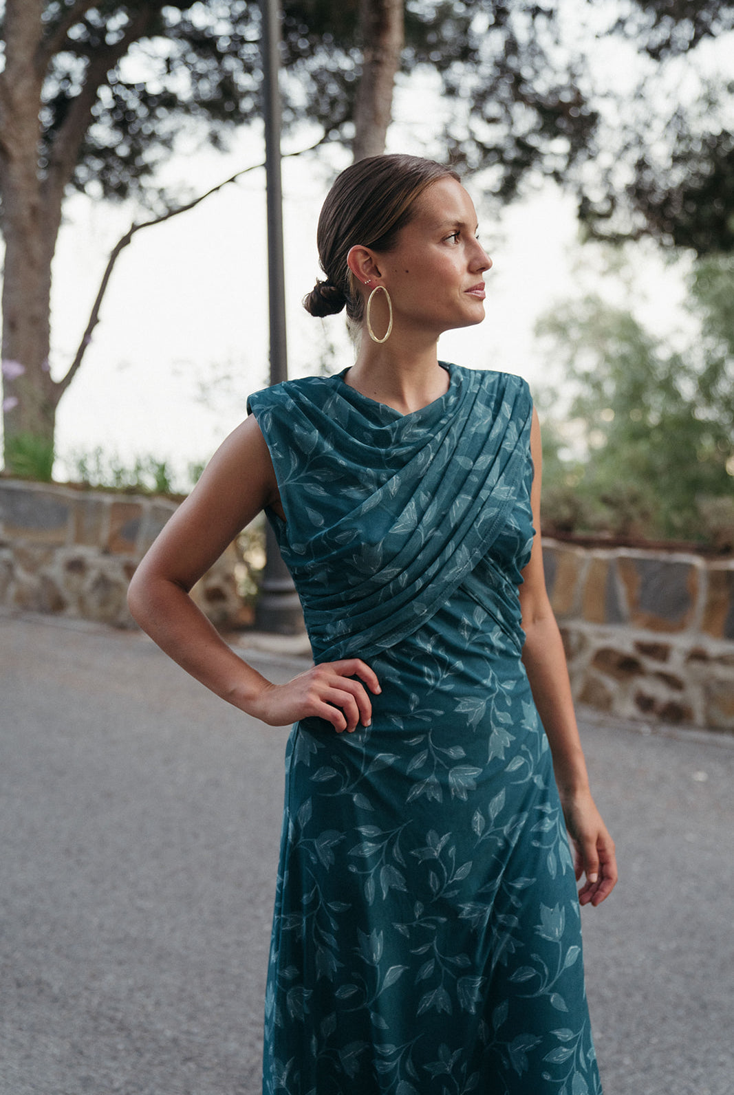 Estampados otoñales, siluetas con movimiento y tejidos con cuerpo, pensados para bodas entre septiembre y noviembre.