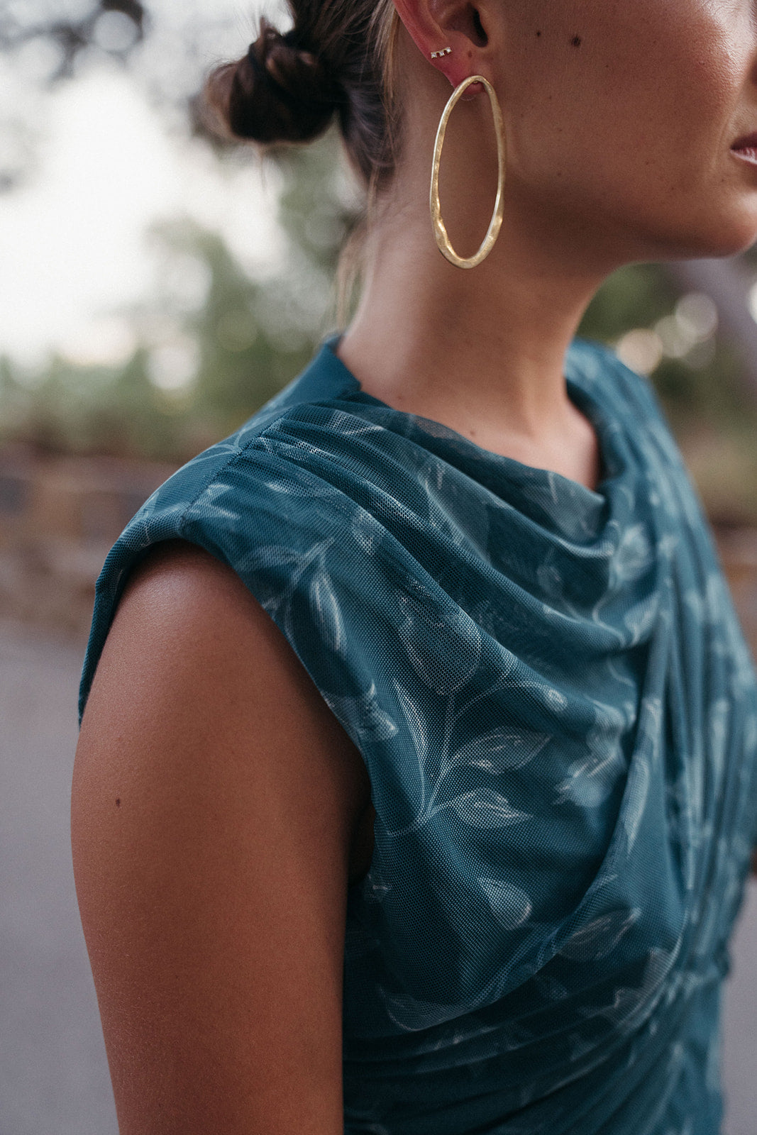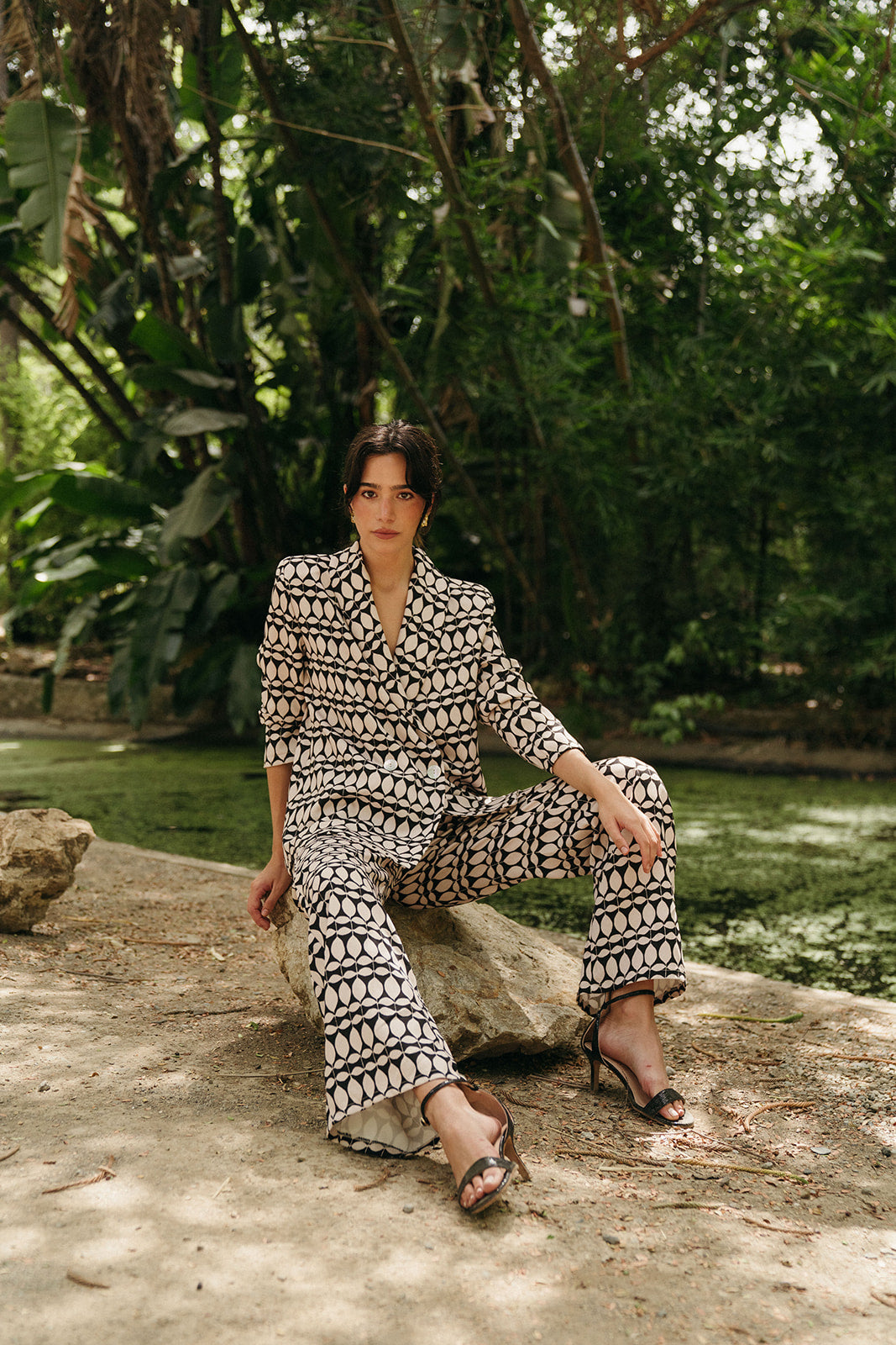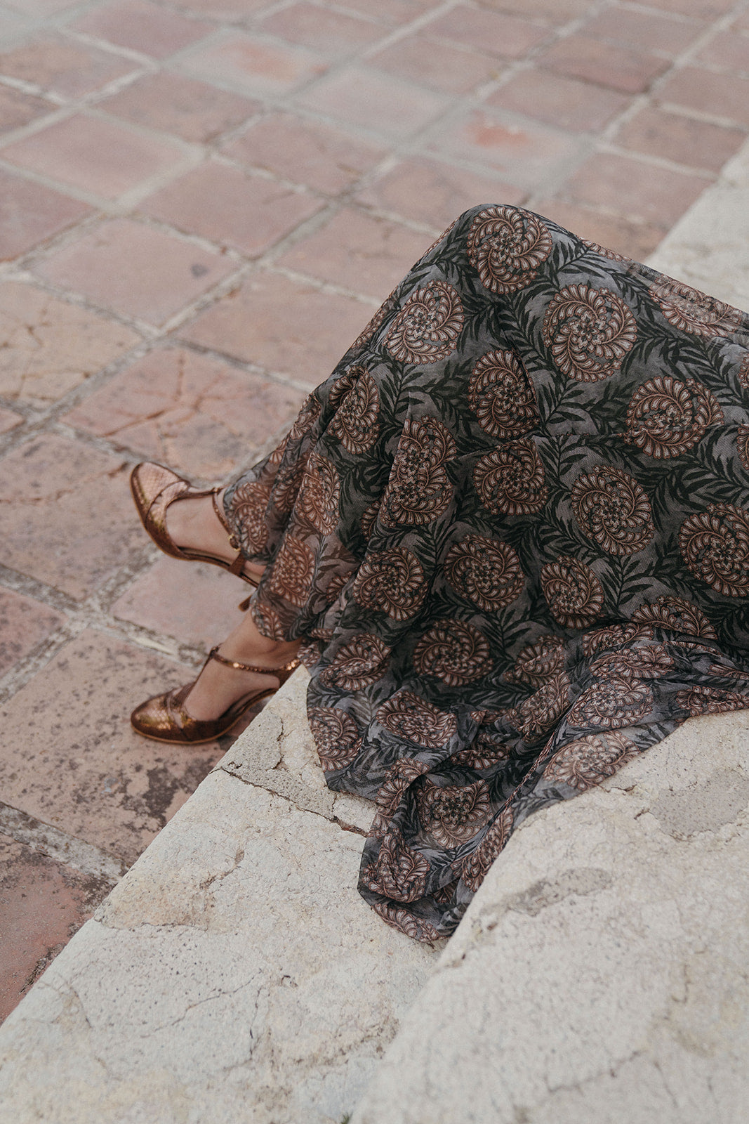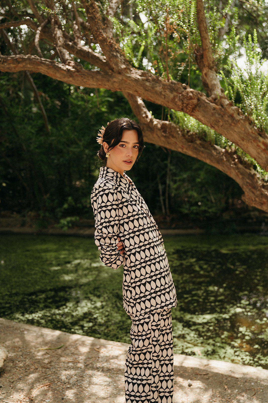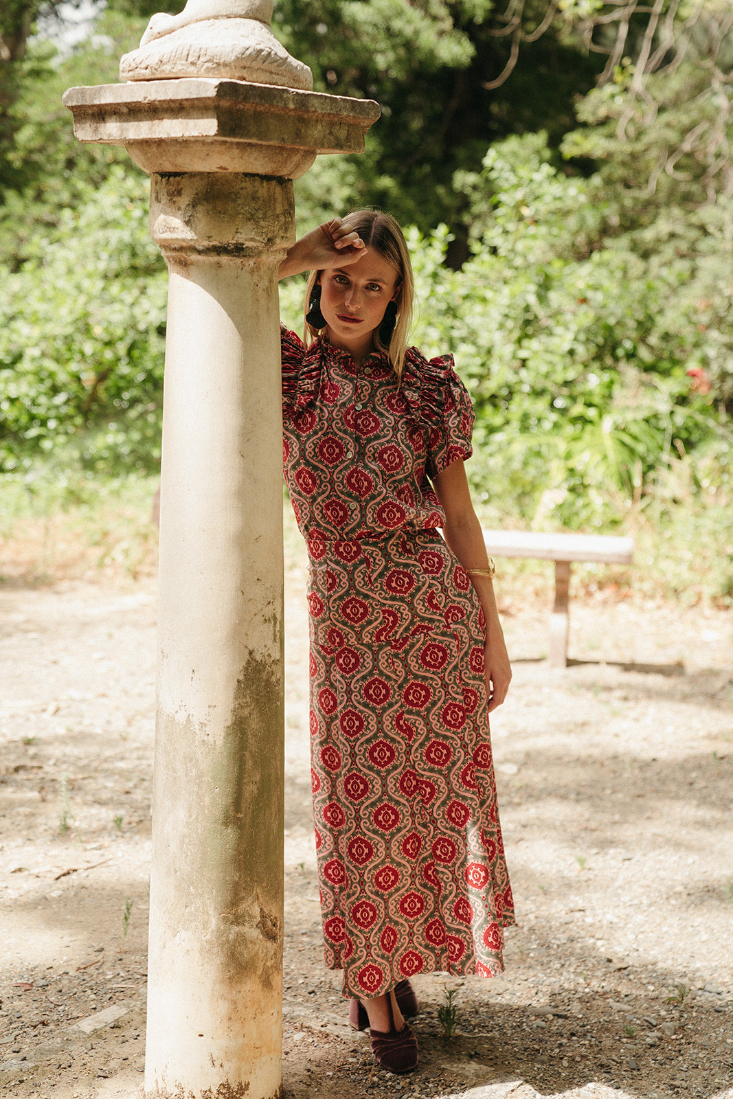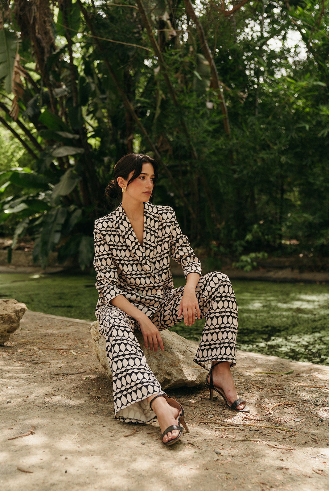 Estampados otoñales, siluetas con movimiento y tejidos con cuerpo, pensados para bodas entre septiembre y noviembre.