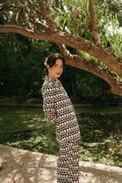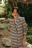 Blazer de corte recto y ligeramente oversize, tiene solapas amplias con escote de pico, cierre frontal con botones en nácar. El largo cubre justo por debajo de la cadera, lo que estiliza y permite llevarla tanto como conjunto —junto al pantalón a juego— como por separado con vaqueros o falda. Original tejido estampado con dibujo geométrico en tonos beige y negro.