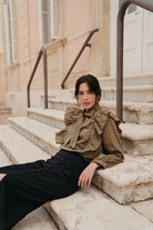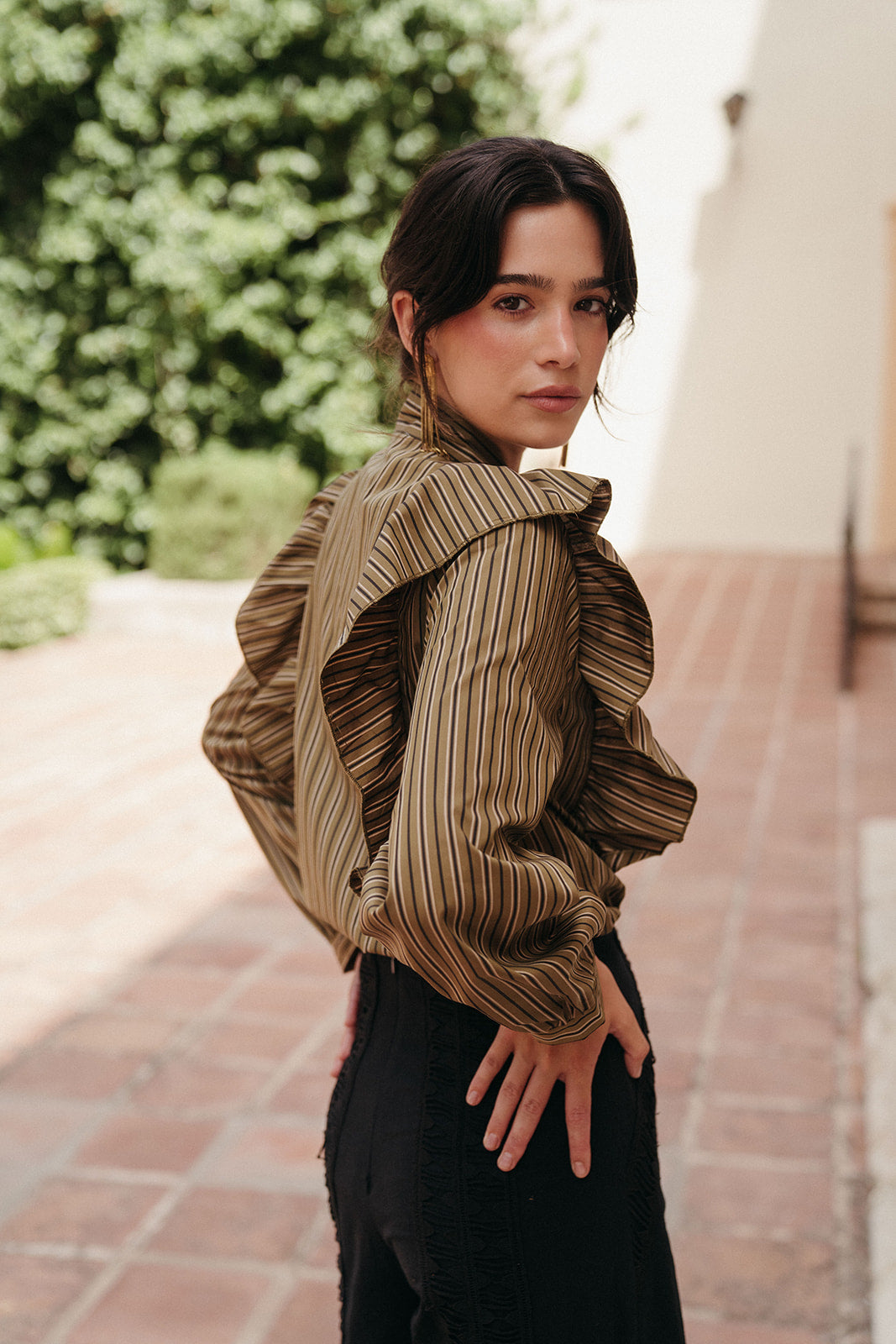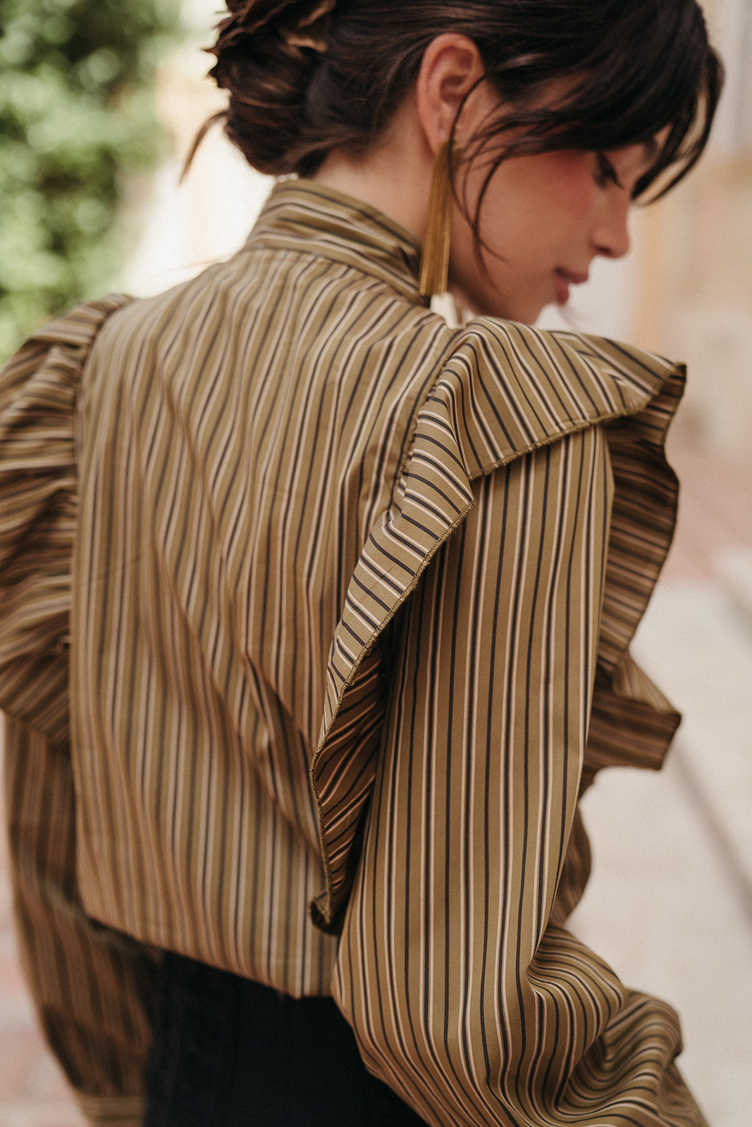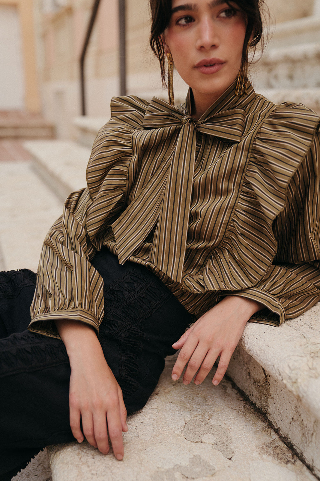 La Camisa Soto en tono caqui es una prenda sofisticada con mucha personalidad. Confeccionada en un tejido de algodón con rayas, destaca por su cuello lazo extragrande y sus voluminosas mangas plisadas que aportan estructura y elegancia.