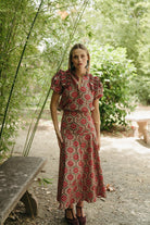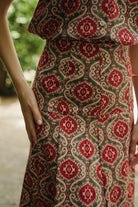 La Falda Cañada es una prenda de corte largo y cintura alta, elaborada en algodón 100% con el mismo estampado geométrico que el top, lo que permite llevarla como conjunto o por separado.