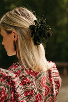 Flor con pétalos cortados en terciopelo con imperdible y pinza en parte trasera que permiten que te la puedas poner tanto en solapa como en el pelo.