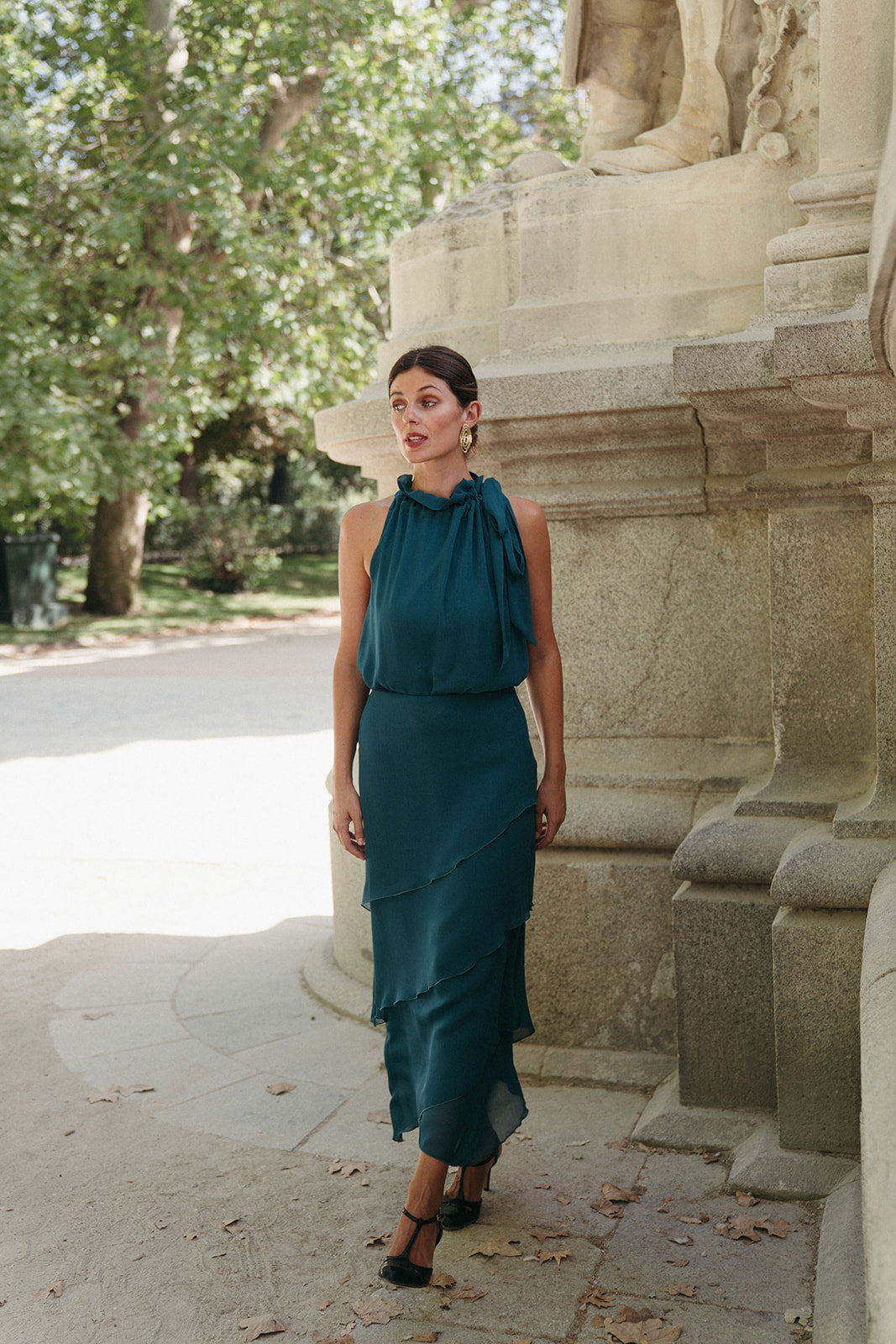 La Falda Fuente está confeccionada en gasa fluida a capas superpuestas con acabados en volantes, que le dan mucho movimiento. De largo midi-asimétrico y en un tono verde teal profundo, transmite frescura y elegancia. Su silueta ligera y vaporosa alarga la figura y la hace perfecta para eventos tanto de día como de noche.