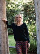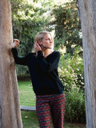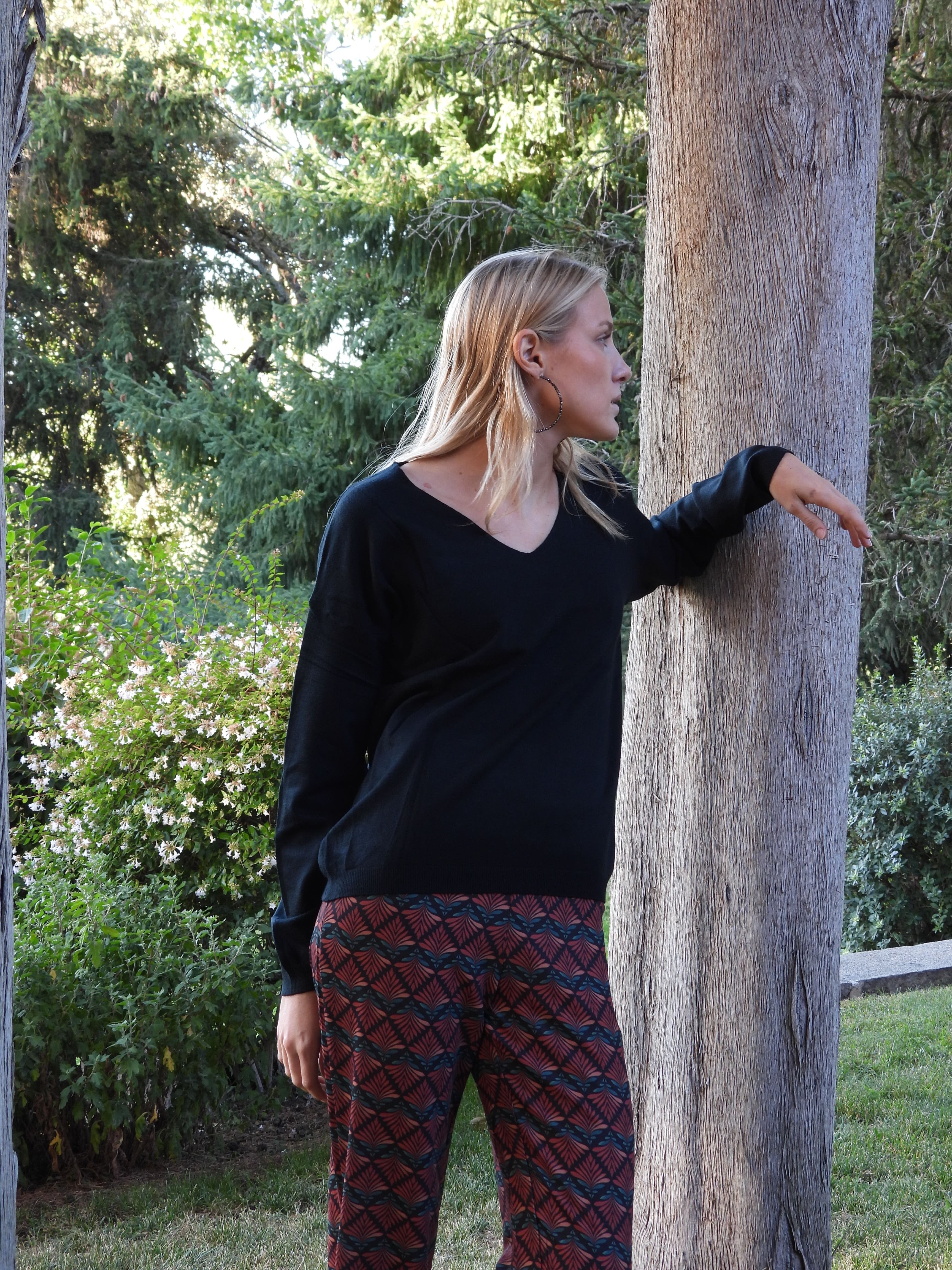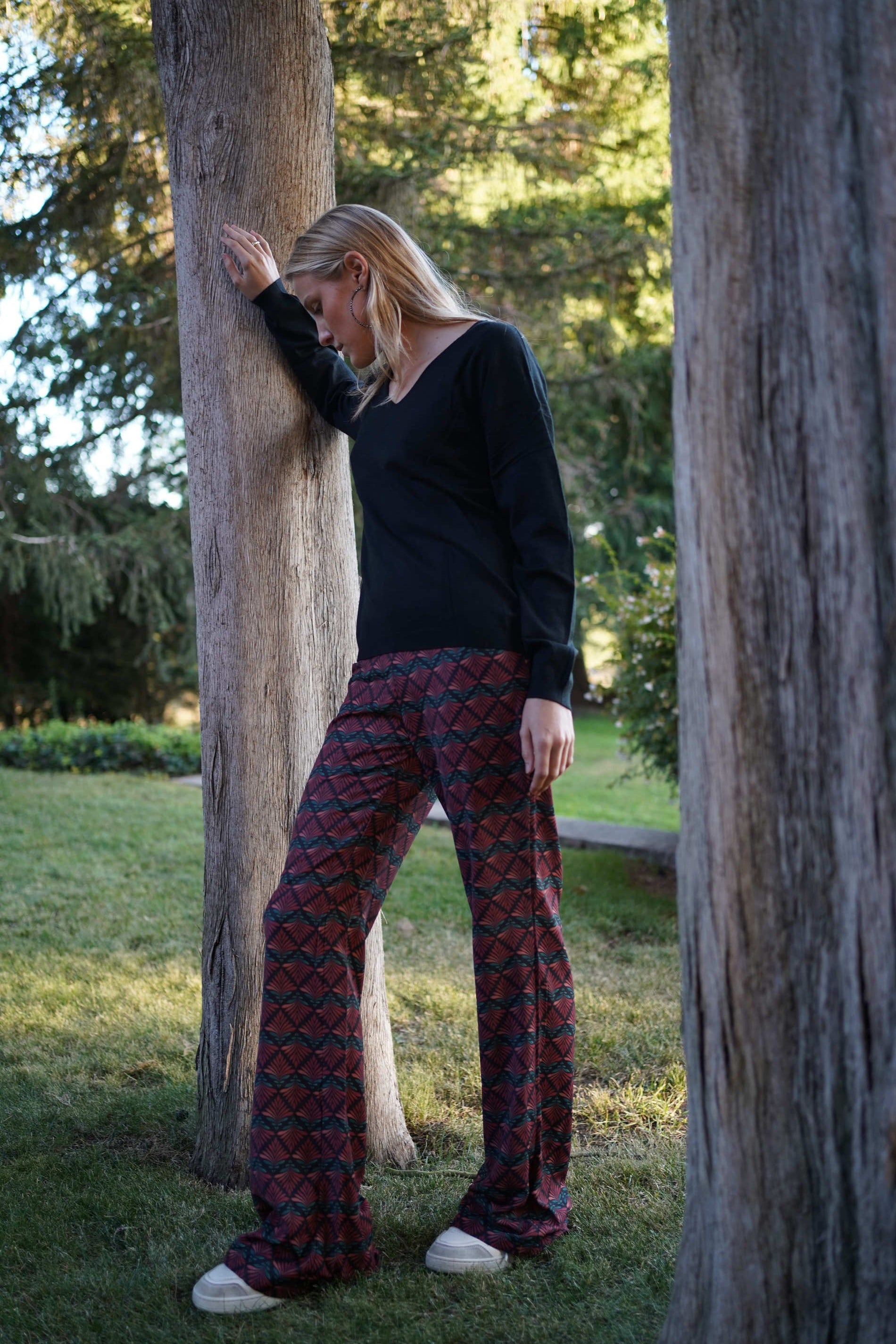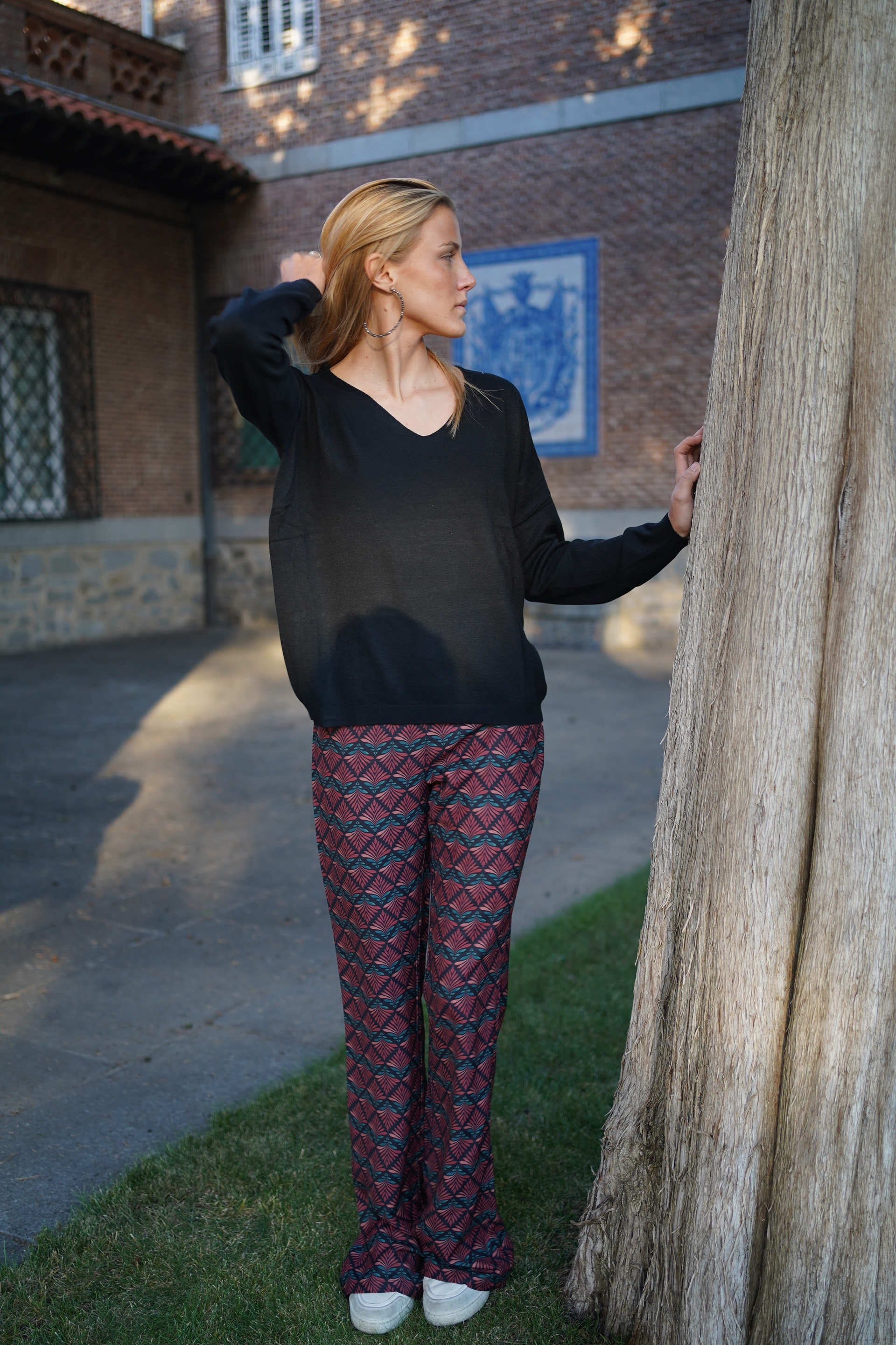 Pantalón suelto, con estampado geométrico, ideal para el día a día con jersey negro y zapatillas o botines si le quieres dar un toque más arreglado.