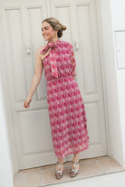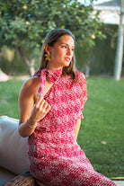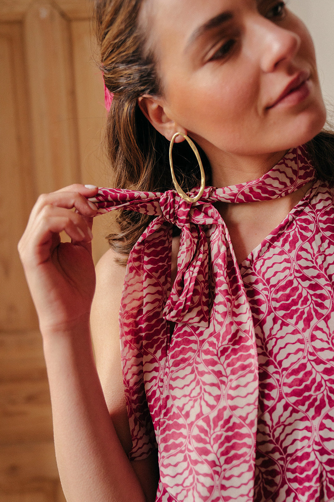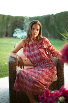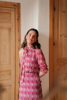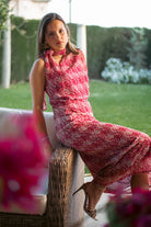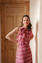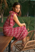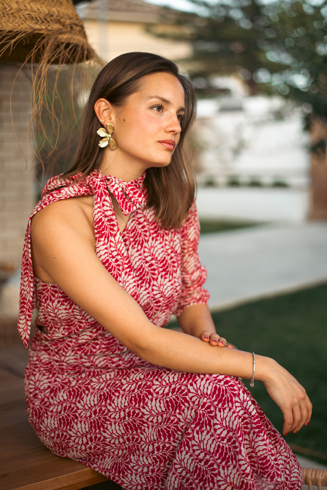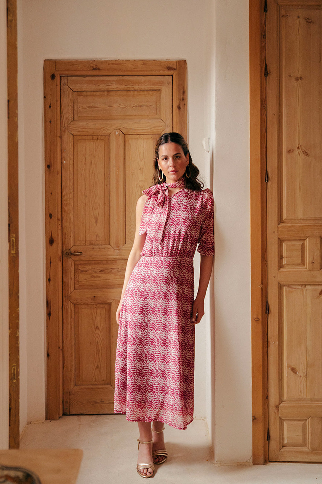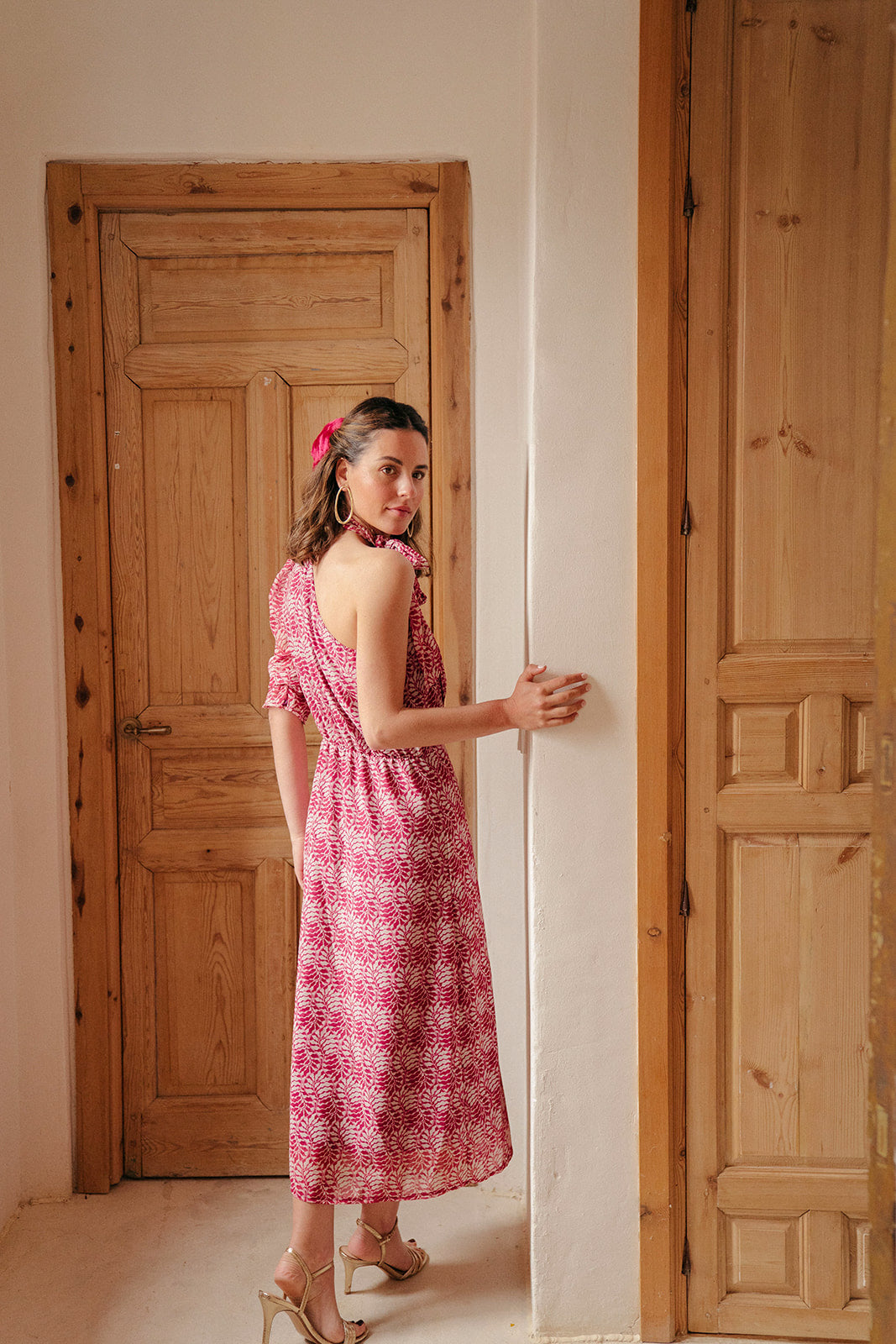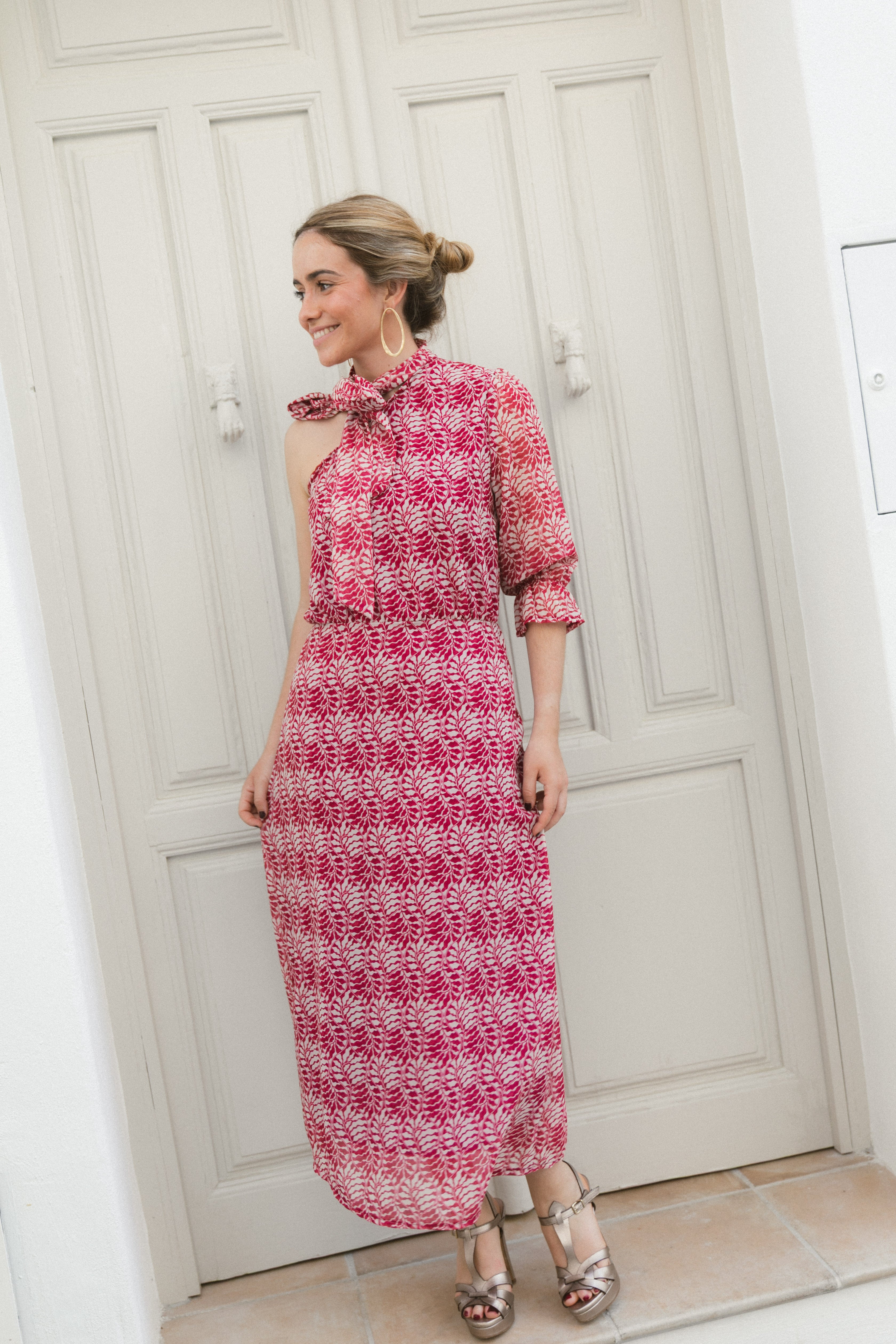 El tejido presenta un estampado en tono buganvilla, ideal para todos tus eventos de primavera. Una elección versátil y adecuada para invitadas que buscan un equilibrio entre estilo y comodidad.