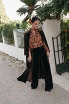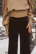Pantalón en tejido de terciopelo con pata recta y elástico en la cintura. Nuestro pantalón de terciopelo tiene una caída y un corte que se ajusta fenomenal al cuerpo y lo hacen cómodo para llevar en todos tus eventos. Color chocolate.