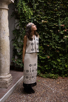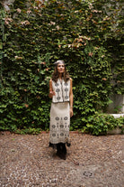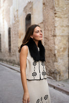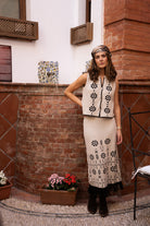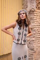 Chaleco sin mangas tipo rebeca confeccionado en punto con botones frontales. El estampado con motivos geométricos, en tonos oscuros sobre un fondo claro, le otorga un estilo chic y moderno, que a su vez mantiene una elegancia natural.