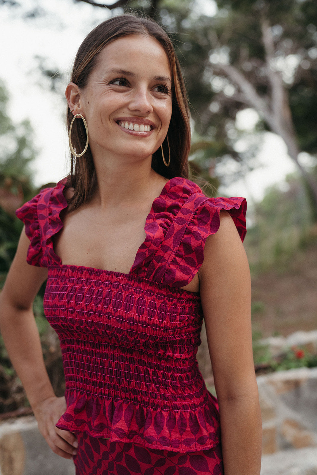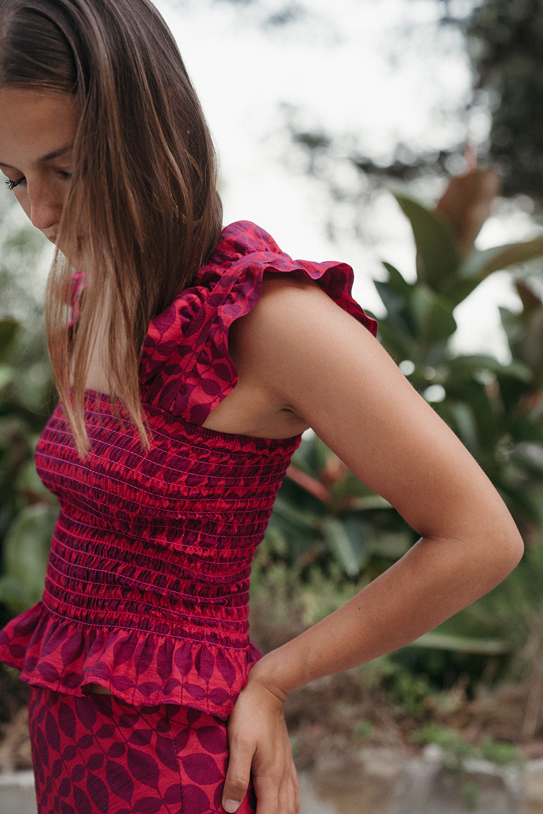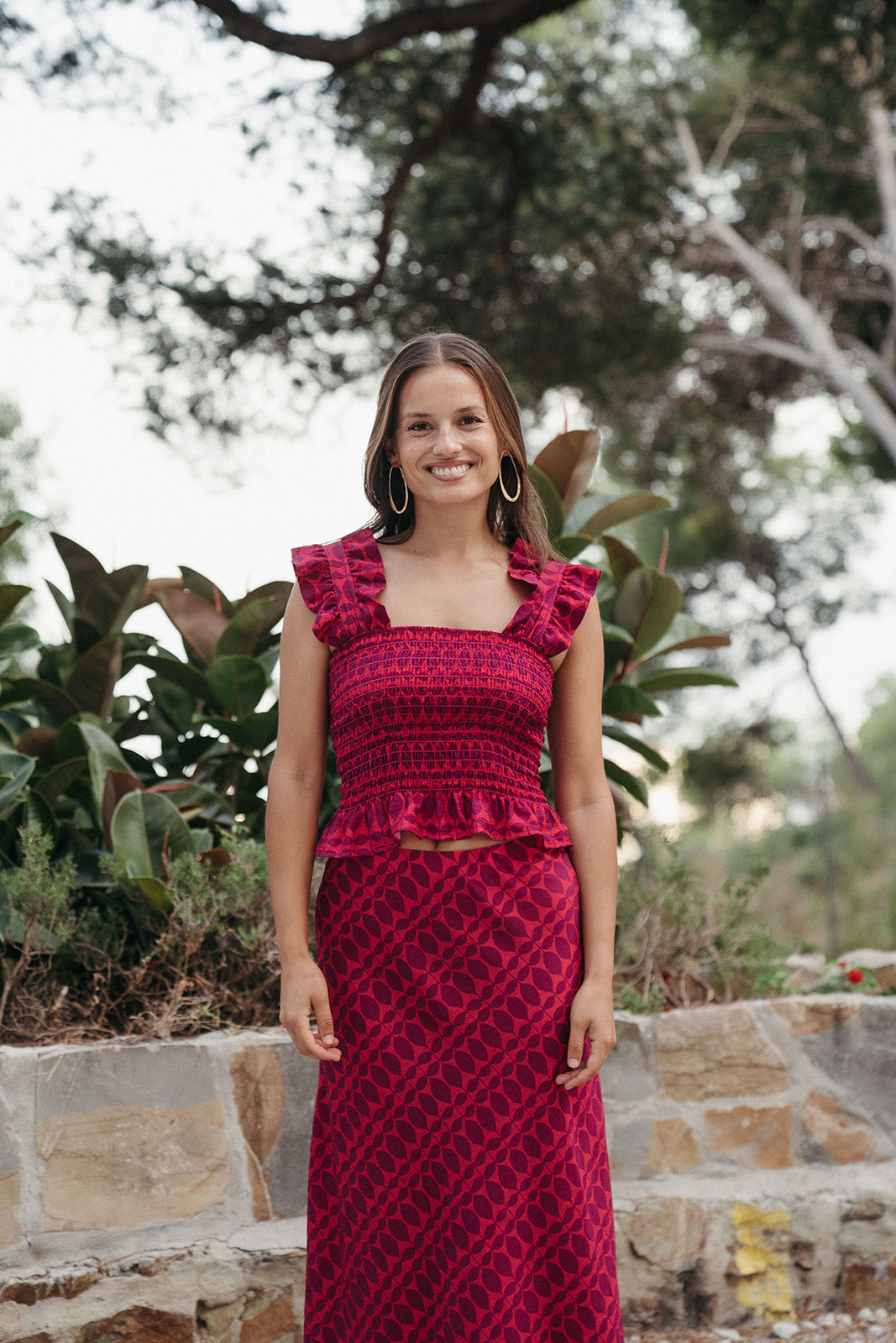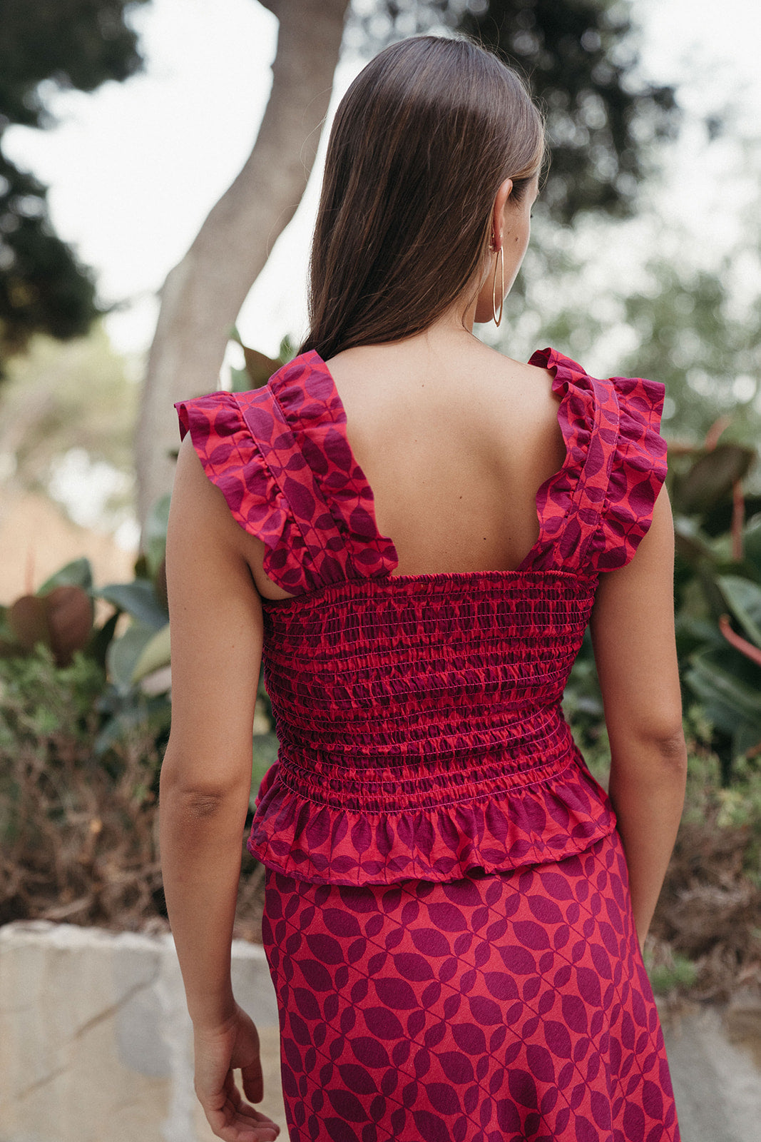 El Top Caballa está confeccionado en un tejido ligero y fresco con estampado en tonos buganvilla. Su diseño entallado con nido de abeja realza la silueta mientras que los volantes en los hombros aportan un aire romántico y favorecedor. Ideal para llevarlo con su falda a juego o combinarlo con pantalones blancos para un look más informal.