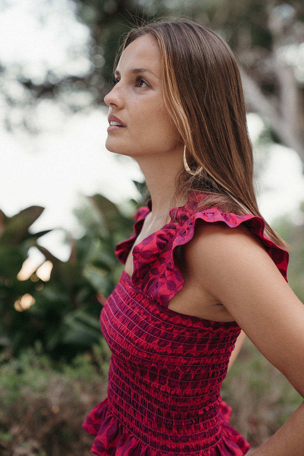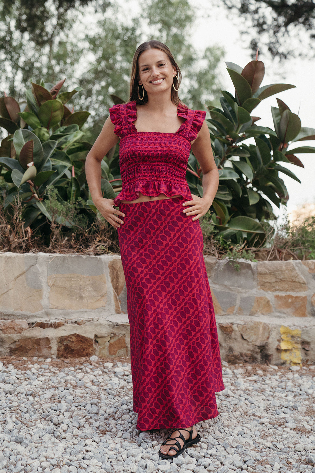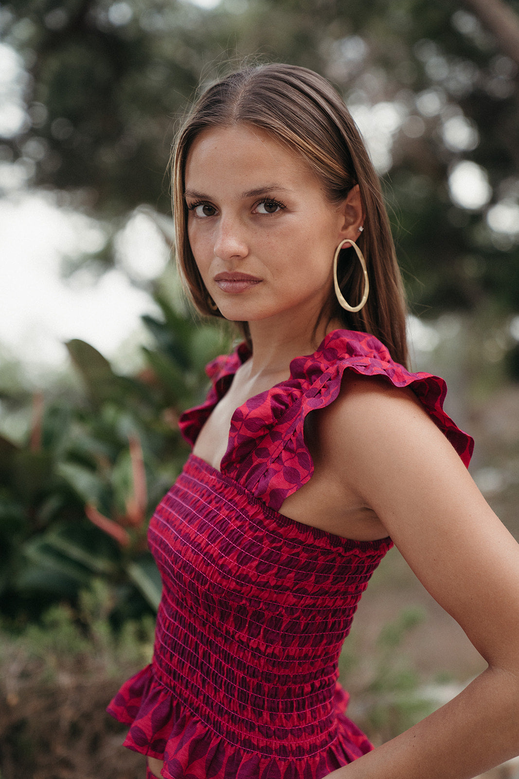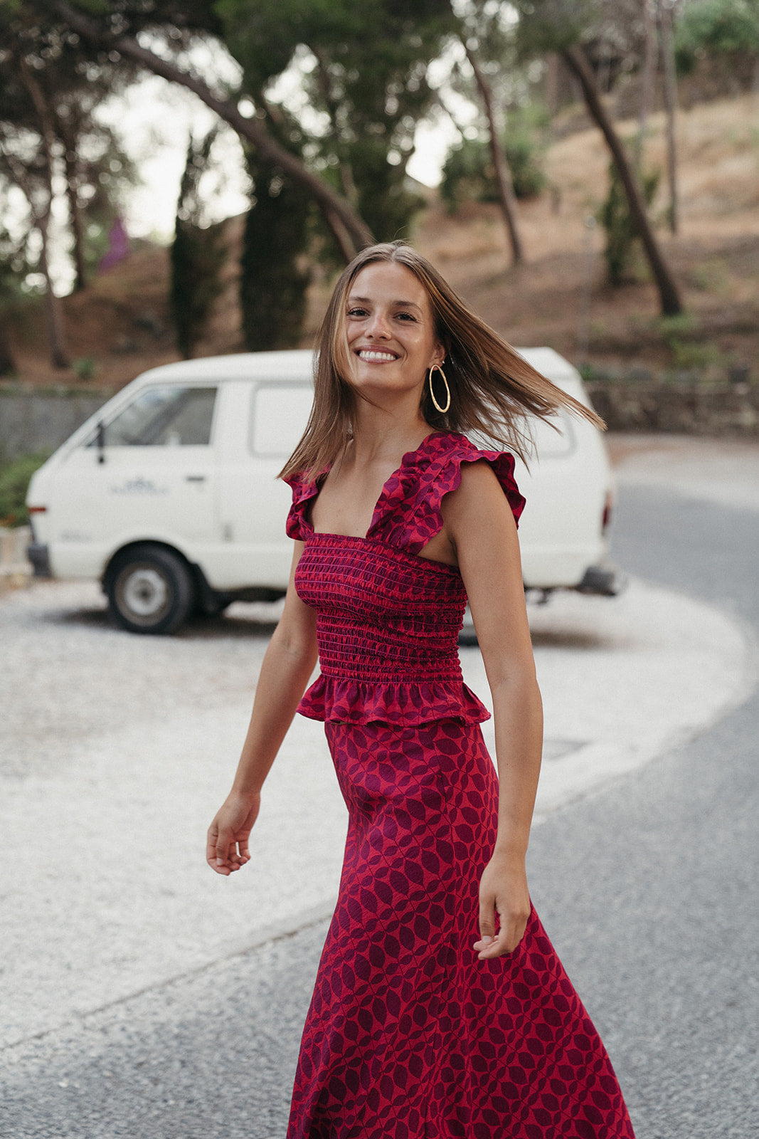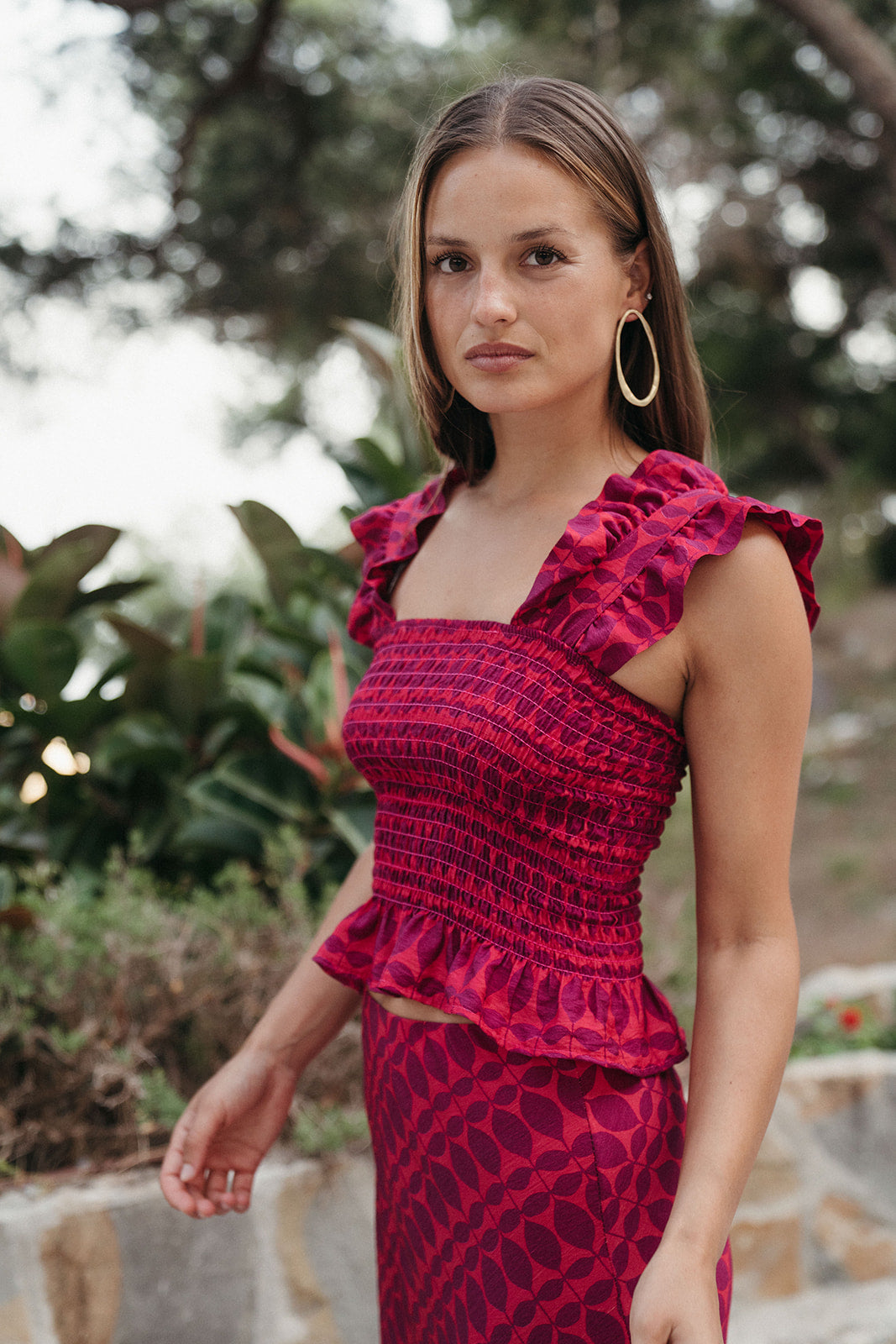 El Top Caballa está confeccionado en un tejido ligero y fresco con estampado en tonos buganvilla. Su diseño entallado con nido de abeja realza la silueta mientras que los volantes en los hombros aportan un aire romántico y favorecedor. Ideal para llevarlo con su falda a juego o combinarlo con pantalones blancos para un look más informal.