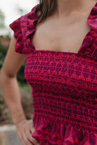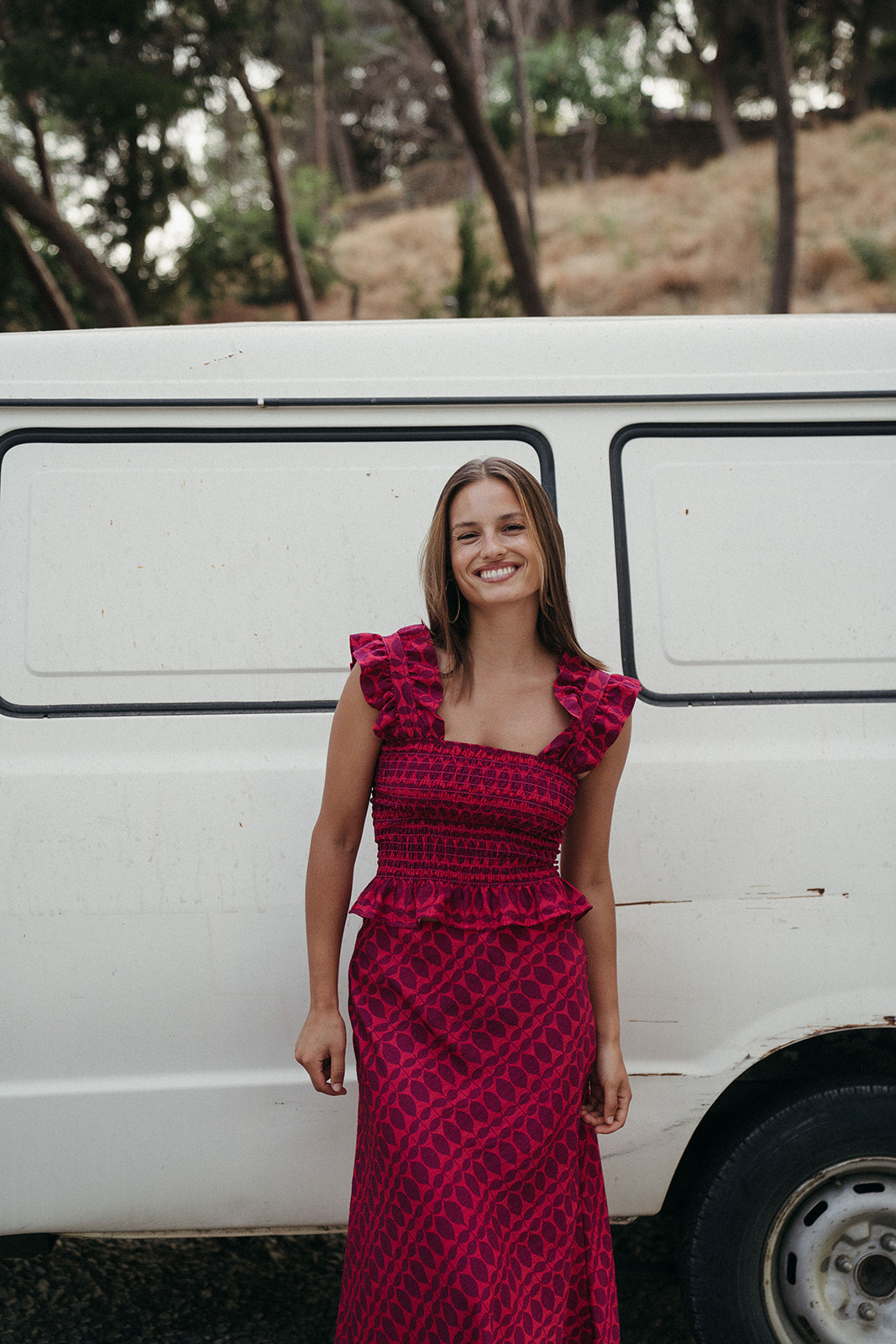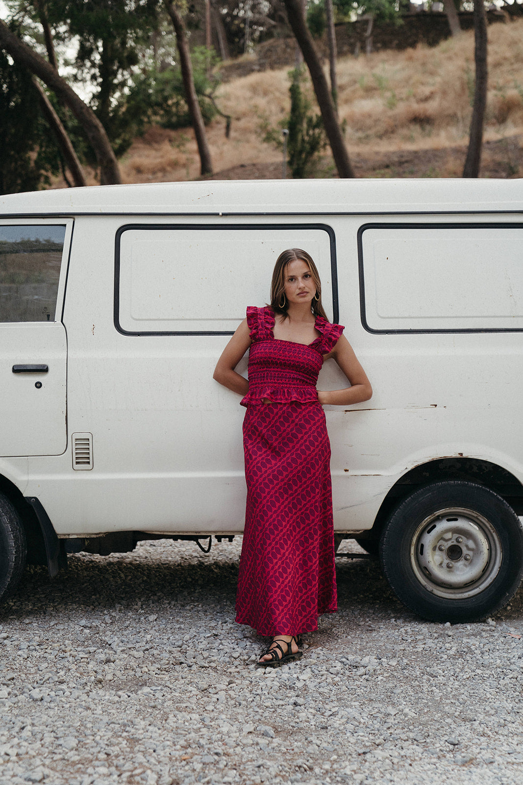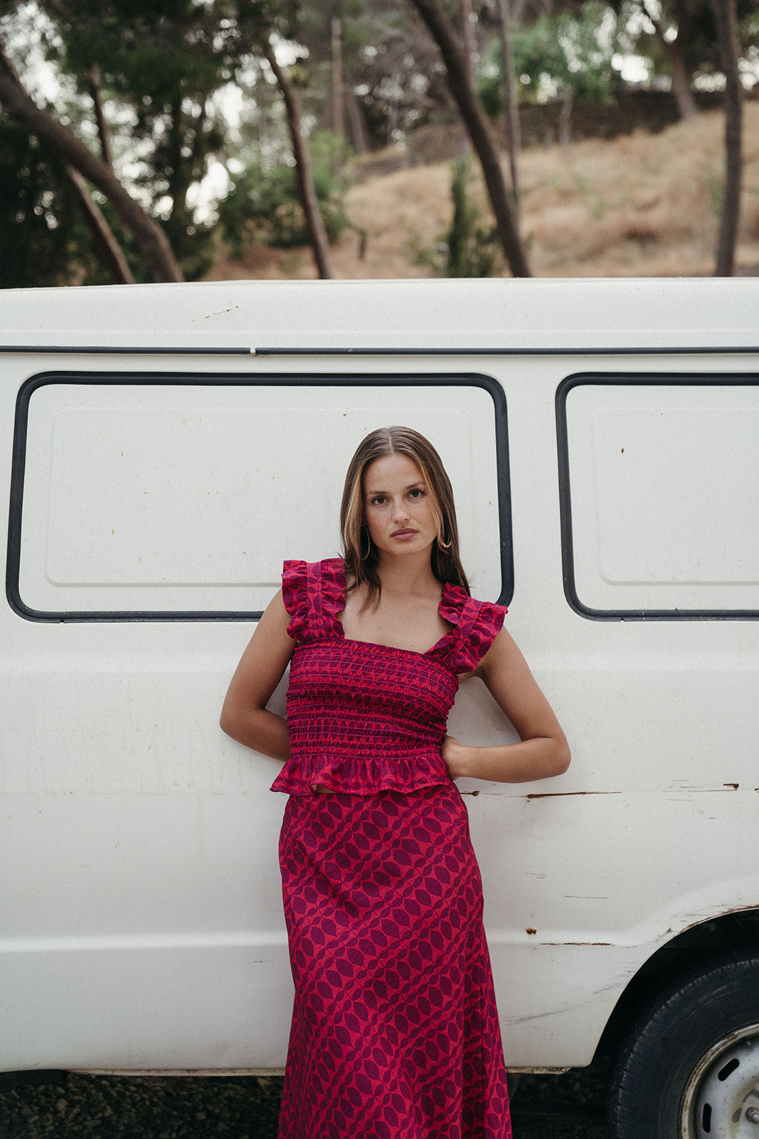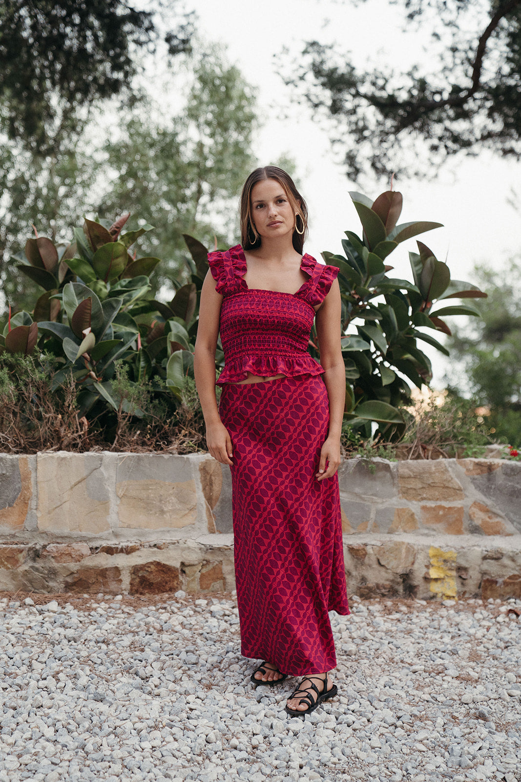 El Top Caballa está confeccionado en un tejido ligero y fresco con estampado en tonos buganvilla. Su diseño entallado con nido de abeja realza la silueta mientras que los volantes en los hombros aportan un aire romántico y favorecedor. Ideal para llevarlo con su falda a juego o combinarlo con pantalones blancos para un look más informal.