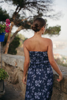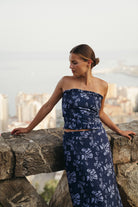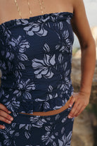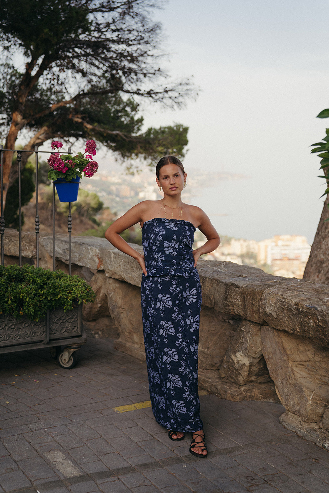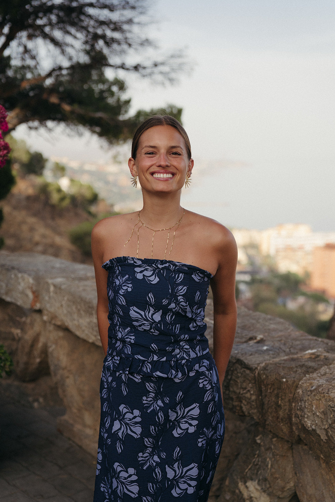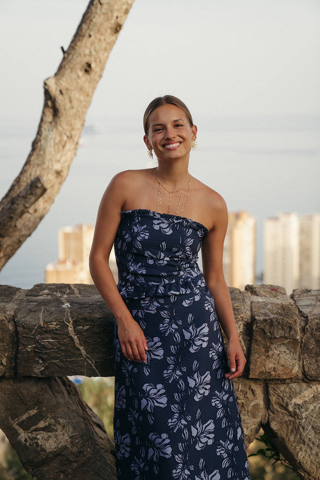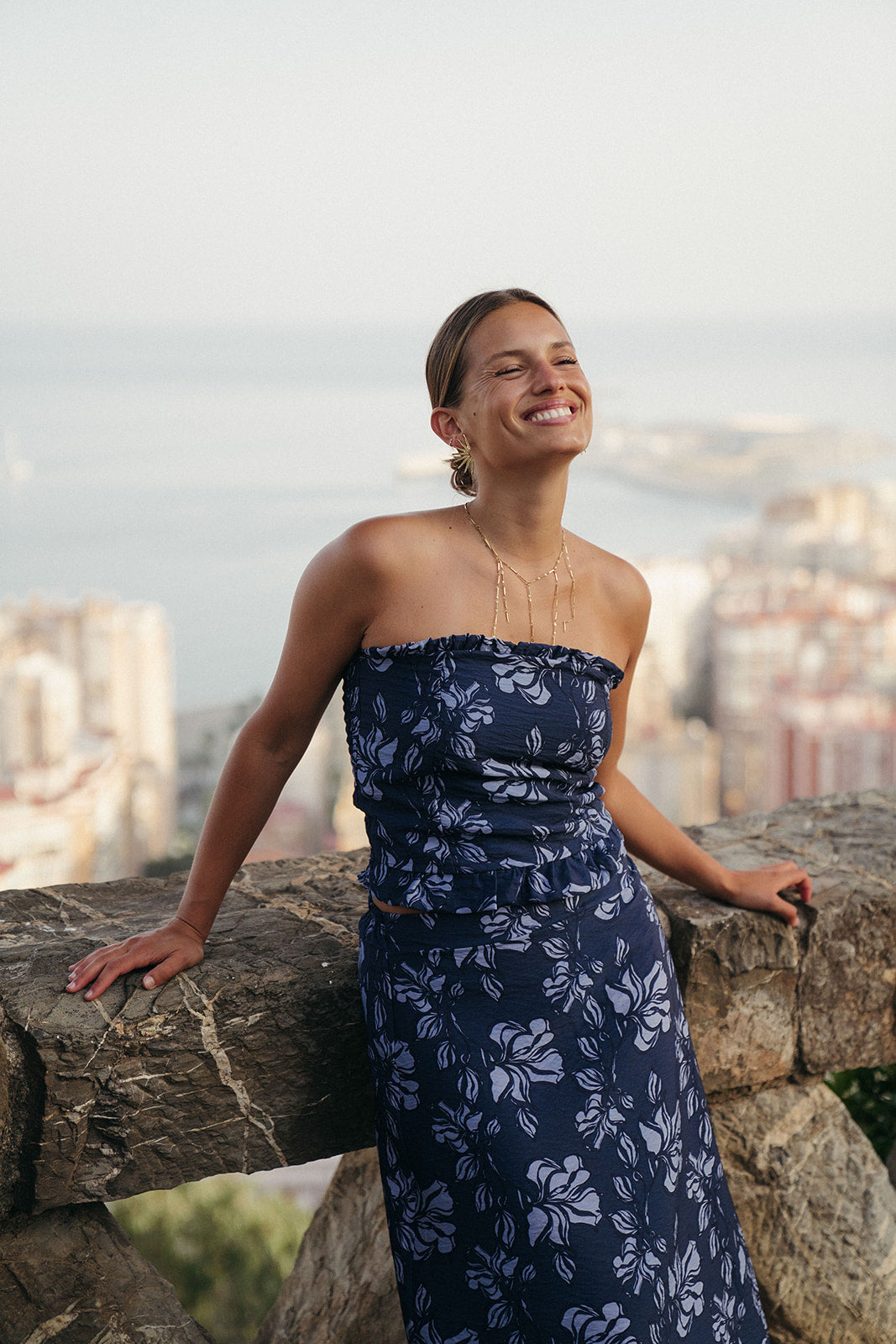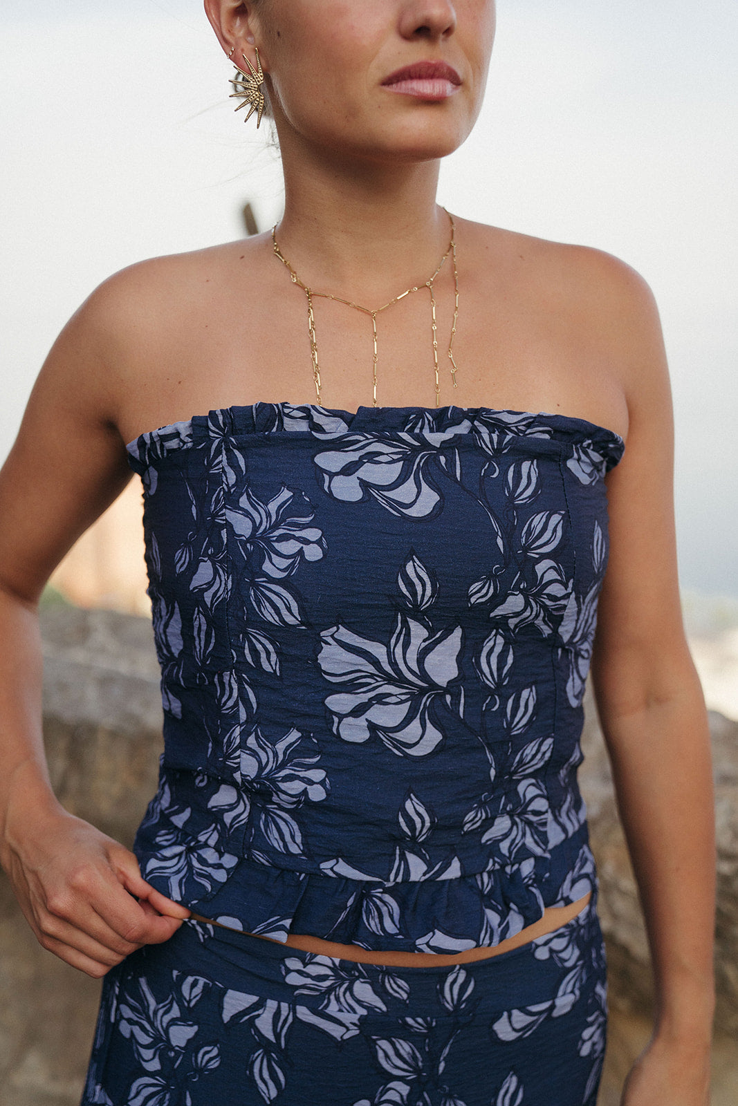 Un top con mucho rollo, pensado para esos días en los que quieres ir cómoda sin renunciar a un look especial. El Top Lucio está confeccionado en un tejido ligero con estampado floral azul sobre fondo marino, y tiene un diseño tipo pareo con volante en el bajo que aporta movimiento y un toque muy femenino. Puedes combinarlo con la Falda Lucio o con unos vaqueros para un look más casual.