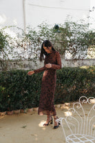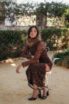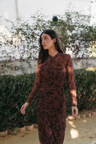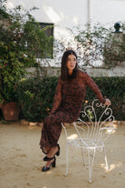 Confeccionado en un tejido de tul con estampado de hojas en tonos marrón chocolate, destaca por su sutil transparencia en la zona del escote y los hombros, que aporta un toque delicado y sofisticado. Su cuello cruzado y manga larga completan un diseño femenino y contemporáneo, ideal para eventos de noche o celebraciones invernales.