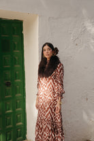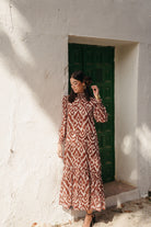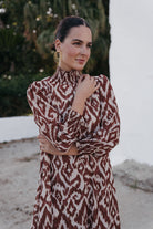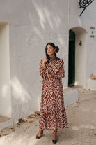 El Vestido Copo Geo es una pieza de corte midi y elegante confeccionada en tejido de gasa con un delicado estampado geométrico en tono marrón. De cuello alto fruncido y mangas abullonadas terminada en puño, combina una silueta fluida con un aire romántico y sofisticado.