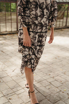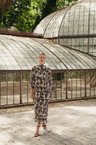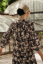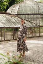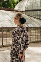El vestido Pedrita Hojas destaca por su original estampado en flores crudo y negro. De corte recto y largo hasta midi manga francesa ligeramente abullonada y vivos a tono en mangas y bajo que le dan un toque muy especial.