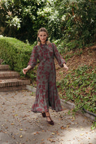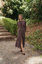 El vestido Valle es una prenda súper especial para eventos de esta temporada. Es de largo midi, con un estampado de hojas espectacular y llamativo que lo hace único. Tiene una lazada al cuello que le da un toque elegante y a la vez moderno, ideal para personalizarlo según el estilo que prefieras.