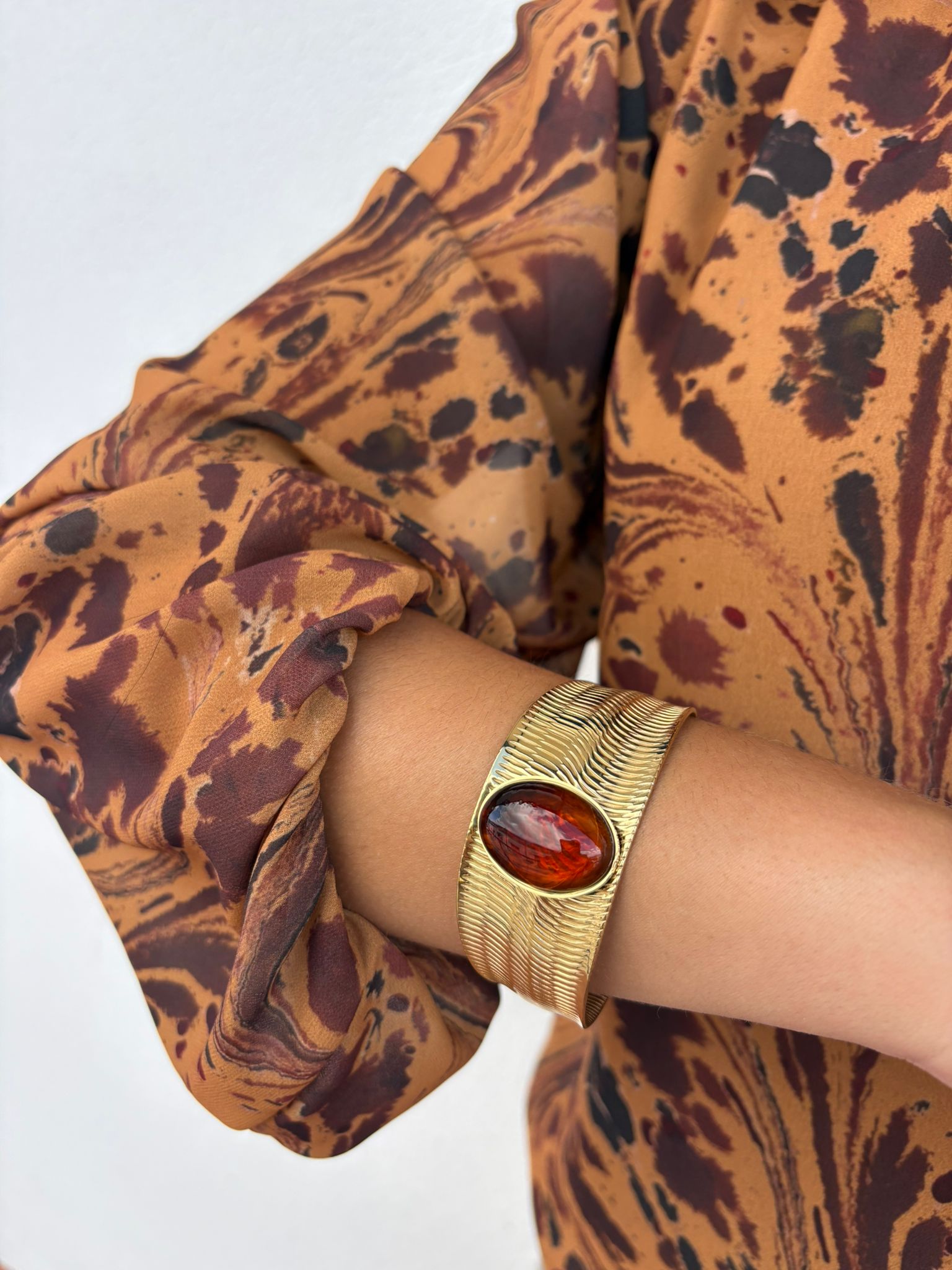 Brazalete dorado con piedra circular en tono marrón para elevar cualquier outfit de otoño/invierno.