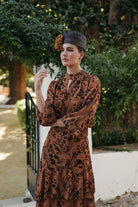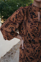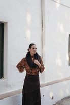 La Camisa Estela está confeccionada en una delicada gasa con un sutil estampado en tonos dorados y ambarinos. Presenta cuello original redondo con un pico en el escote súper favorecedor, mangas largas abullonadas con puño ajustado y una caída ligera que aporta movimiento y elegancia. Es una prenda fluida y luminosa, perfecta para combinar con su falda a juego o pantalones para una ocasión más informal.