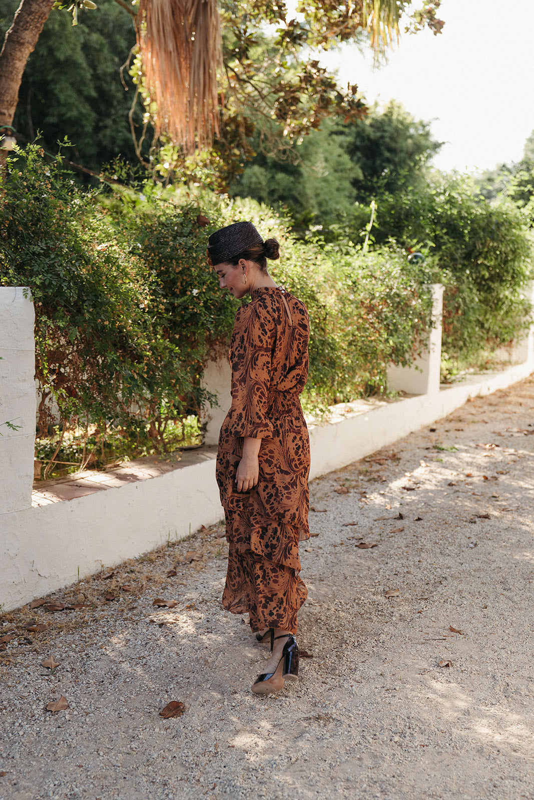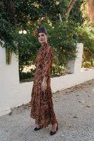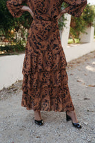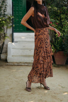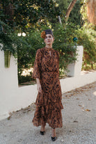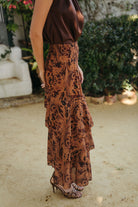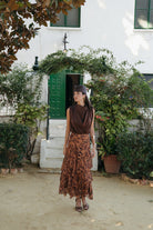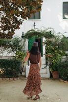 La Falda Estela destaca por su silueta femenina y su movimiento envolvente. Realizada en gasa vaporosa con el mismo estampado que su camisa a juego, presenta un diseño de tres volantes asimétricos que aportan volumen y movimiento al caminar. Su cintura ajustada realza la figura con sutileza, convirtiéndola en una pieza versátil y sofisticada, ideal para eventos de día o de noche.