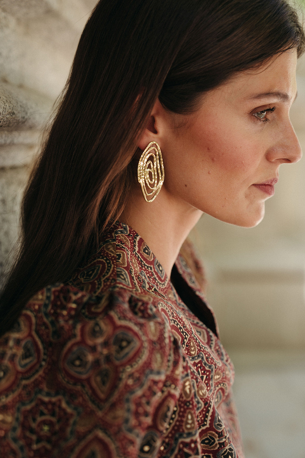 Pendientes con forma ovalada y ligeros círculos en tono dorado, súper favorecedores. Ideales para tus eventos de otoño/invierno.
