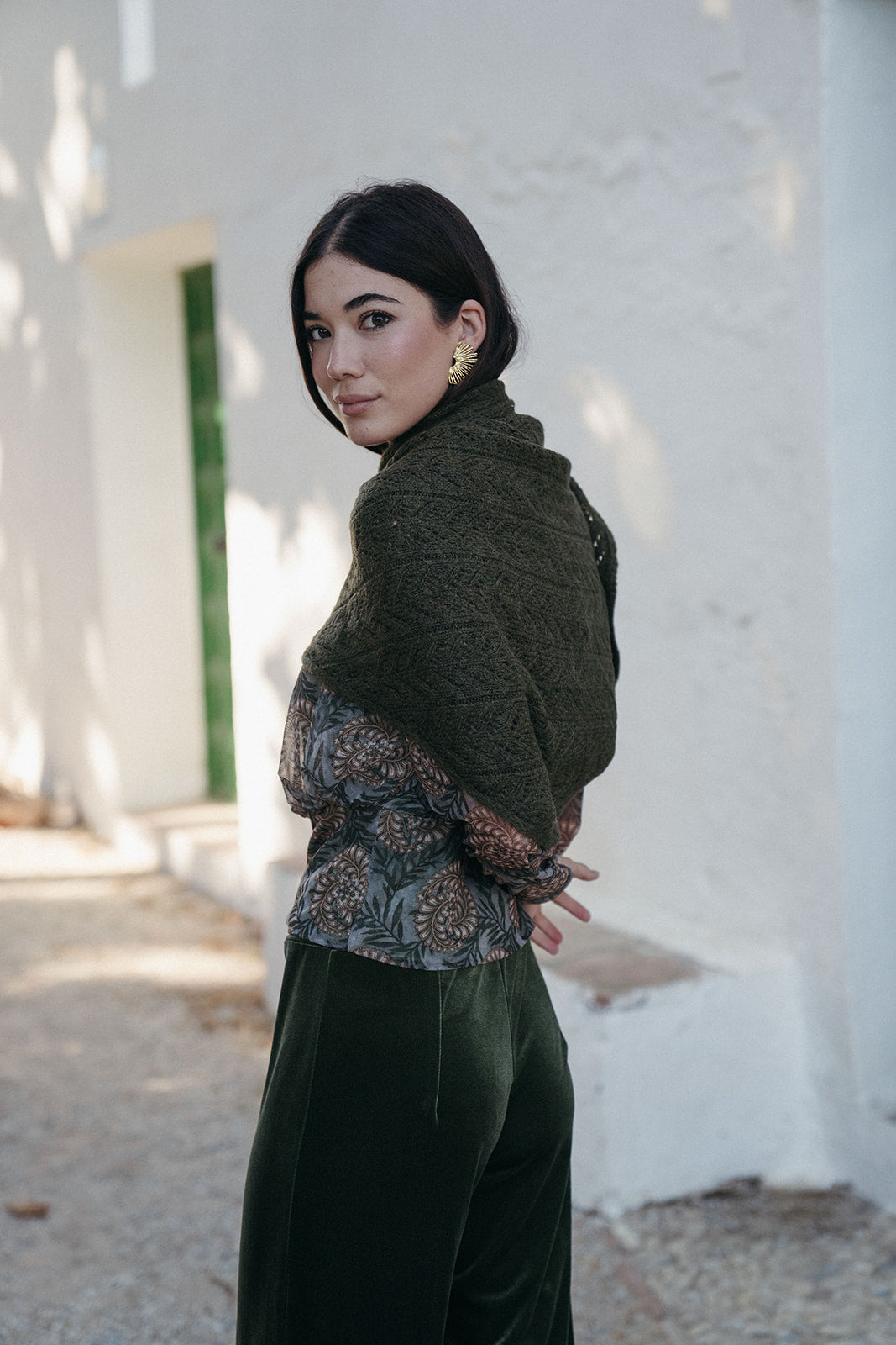 En punto de color verde con dibujo pequeño que es un básico y combina fácilmente con cualquier look, tiene un diseño que aporta elegancia. Los flecos en los bordes añaden un toque dinámico y moderno. Es ideal tanto para complementar con algunos de nuestros vestidos como para el uso diario.