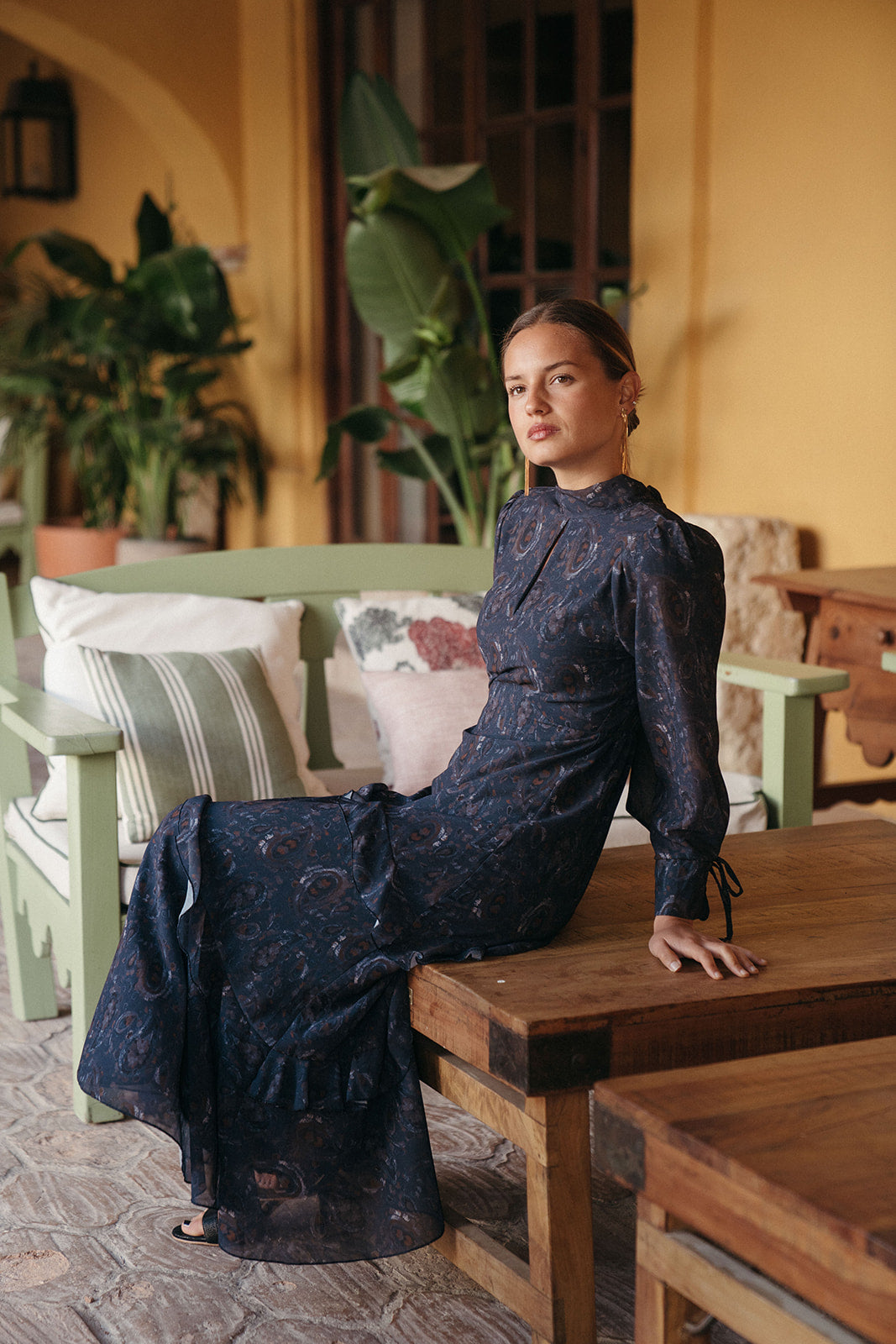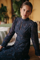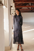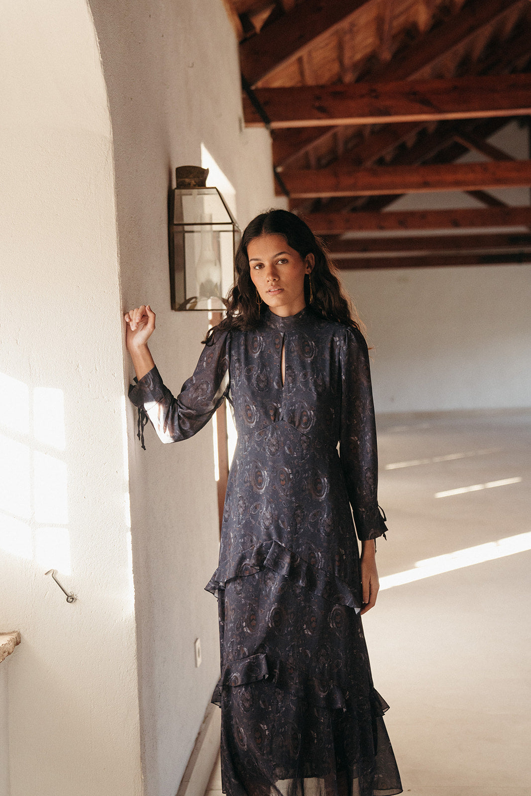 Vestido Estrella Azul es una de esas piezas que enamoran por su silueta y movimiento. Con cuello alzado, manga francesa y una falda larga rematada en volantes suaves, este diseño estiliza la figura y acompaña cada paso con una caída ligera y muy femenina.