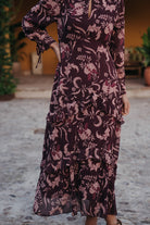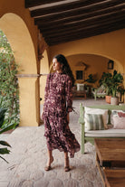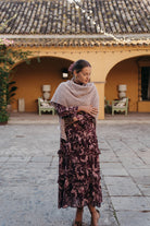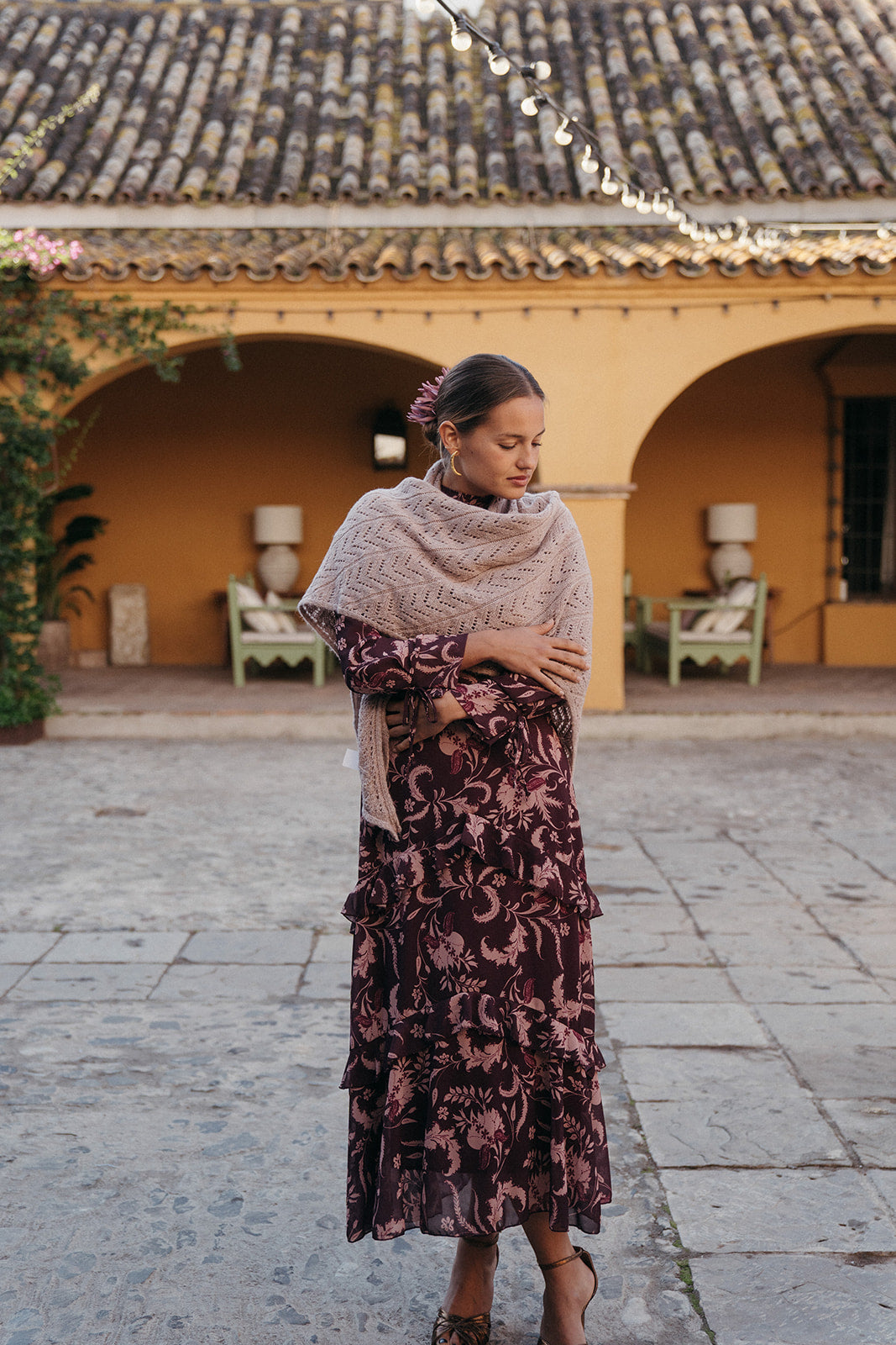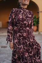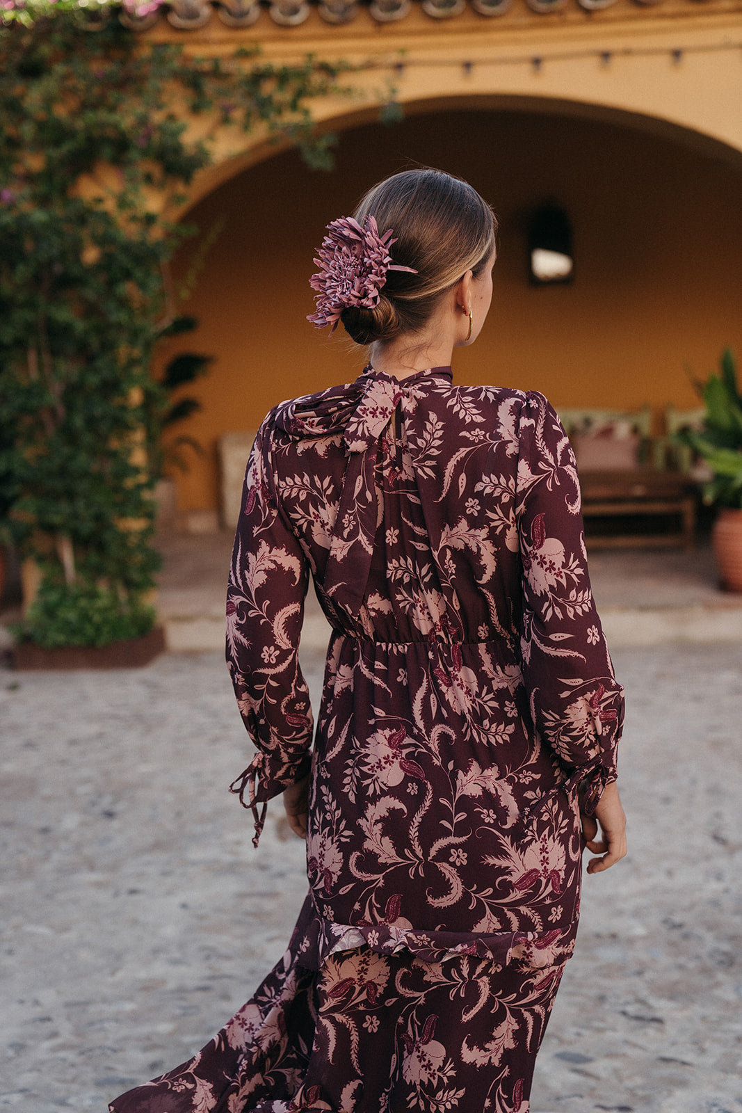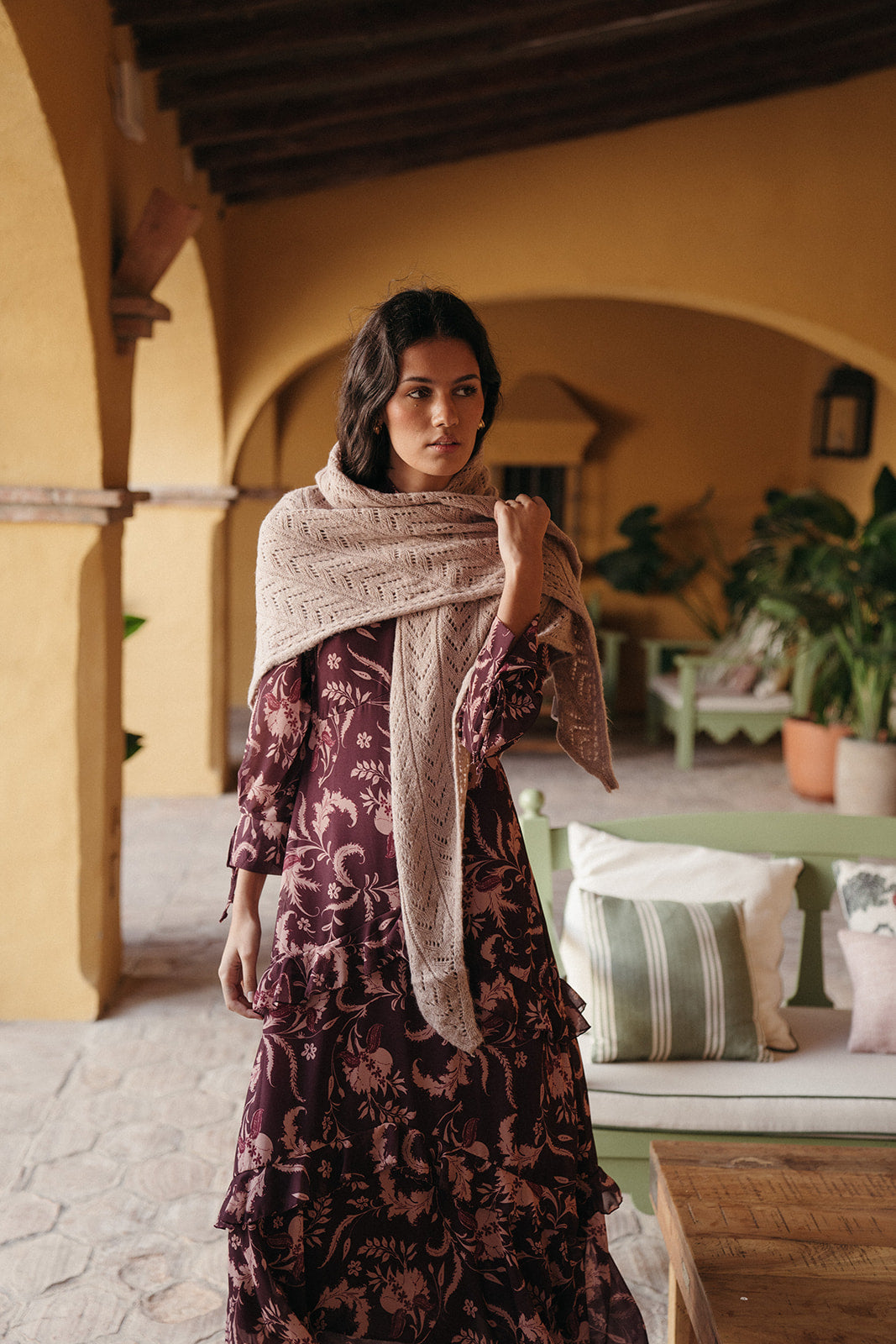 Vestido Estrella Berenjena es una de esas piezas que enamoran por su silueta y movimiento. Con cuello alzado, manga francesa y una falda larga rematada en volantes suaves, este diseño estiliza la figura y acompaña cada paso con una caída ligera y muy femenina.